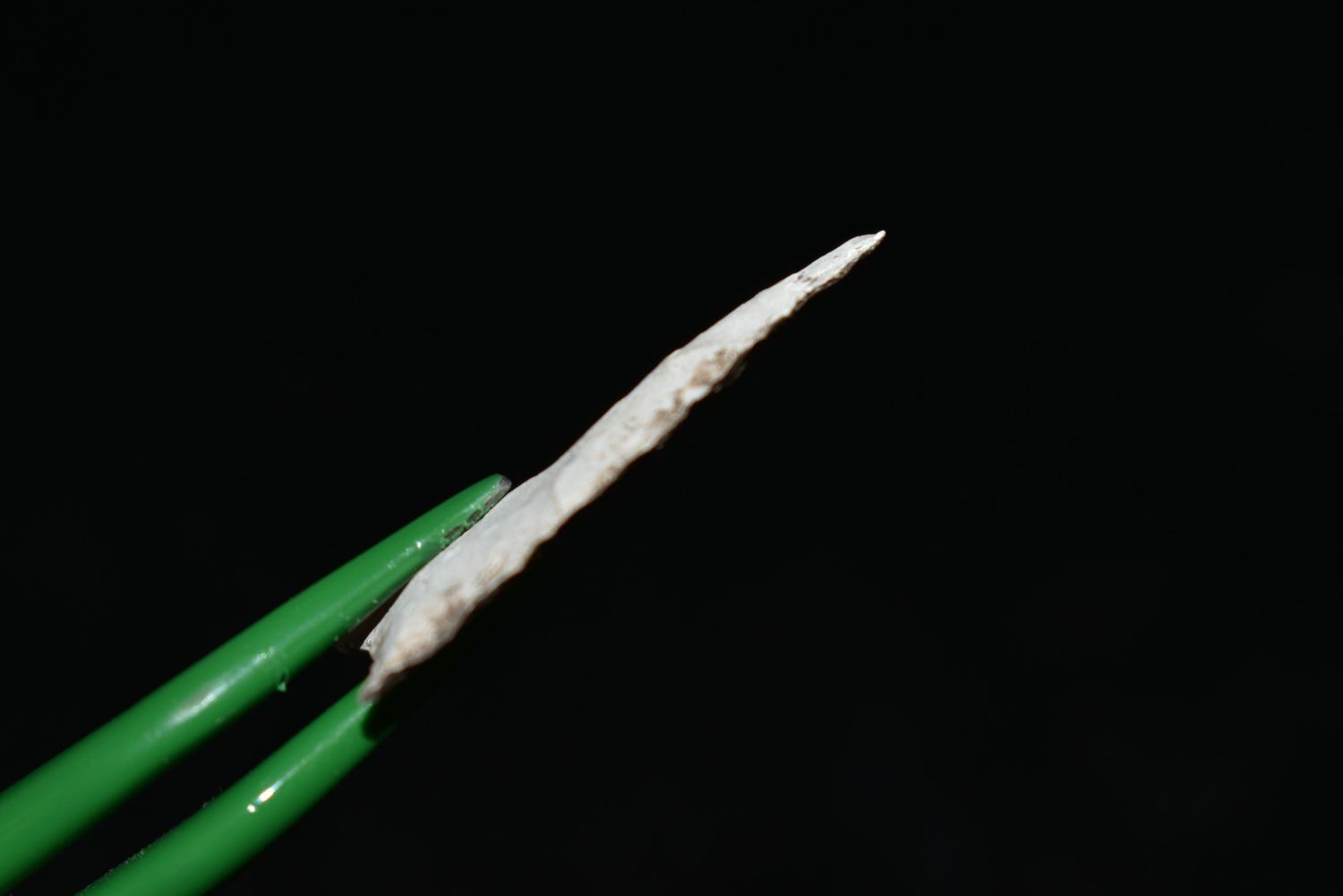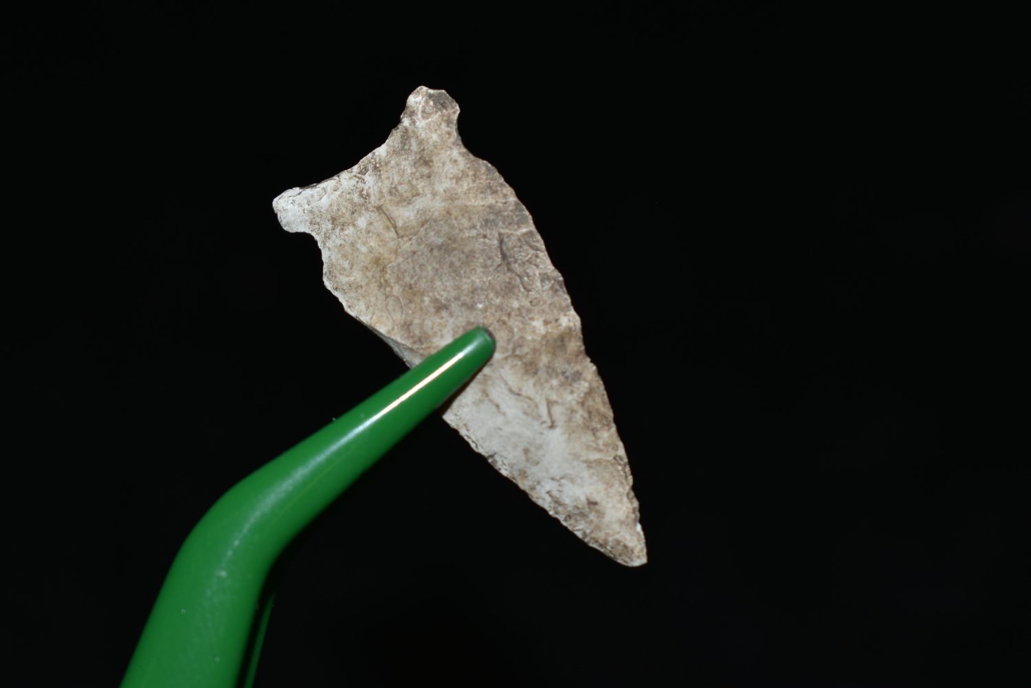 1 1/8" Avonlea point. Found in Musselshell, Montana. Creel Poore was born and raised in Musselshell, Montana where he found his first arrowhead at a very early age. This led Creel on a lifetime search for Montana’s prehistoric past. Creel owned a ranch in Musselshell and collected from sites and in and around the Musselshell River and tributaries. Every piece in Creel’s collection is personally found. He did not purchase pieces, nor did he accept pieces as gifts. He took pride in the fact he found every piece. He also made the cedar frames from cedar trees that were cut on his ranch. Many of the pieces were collected from the buffalo jumps which were plentiful nearby
