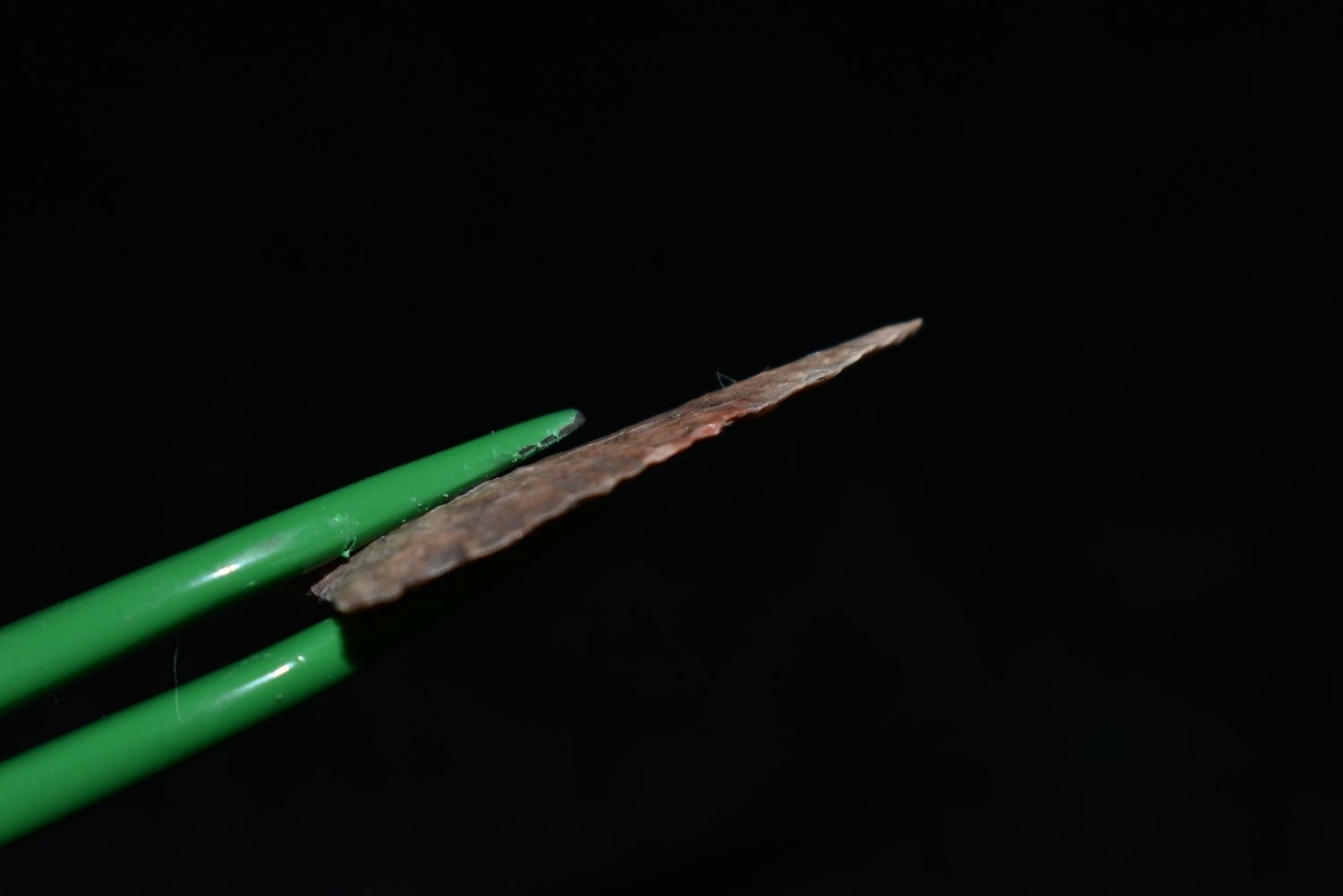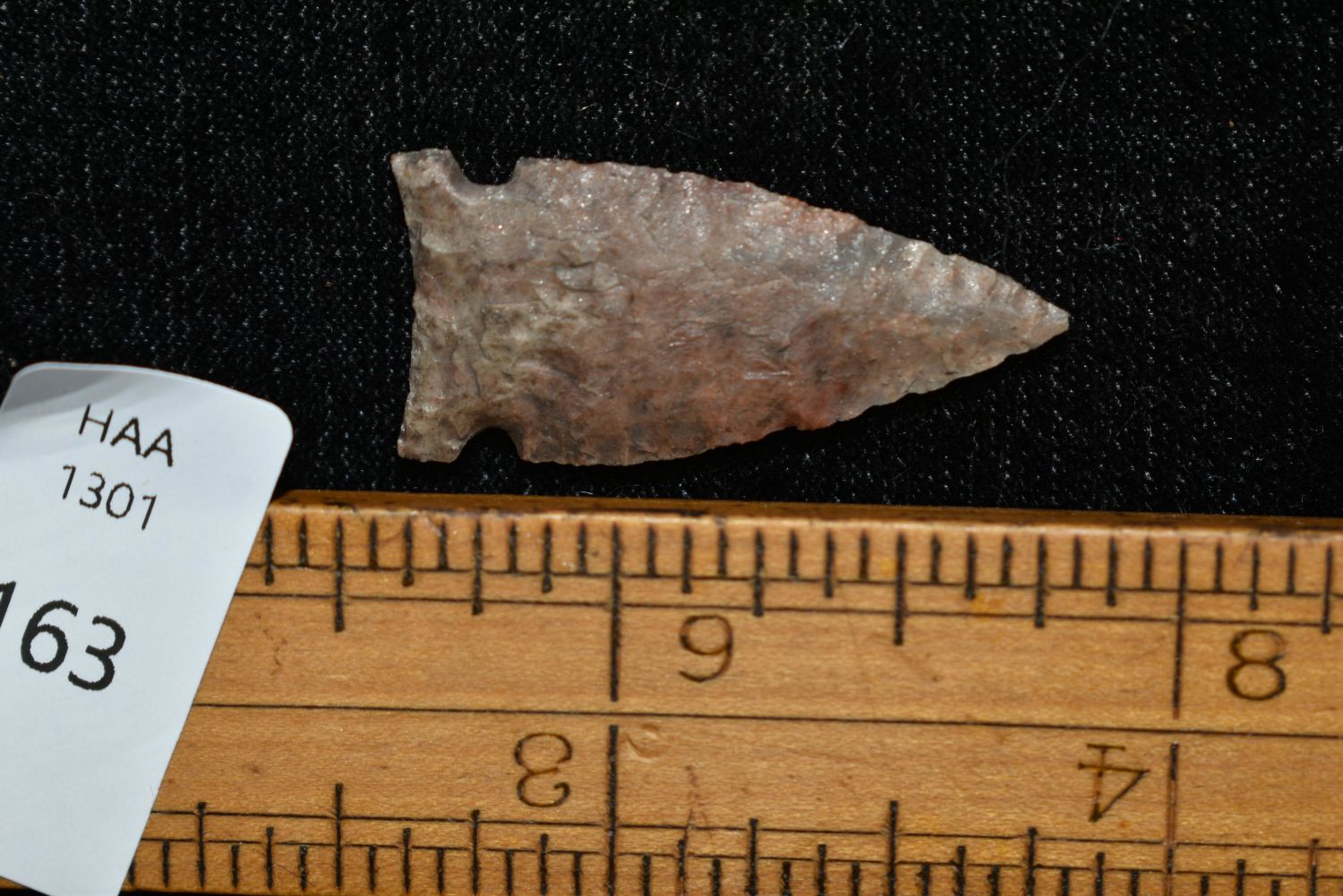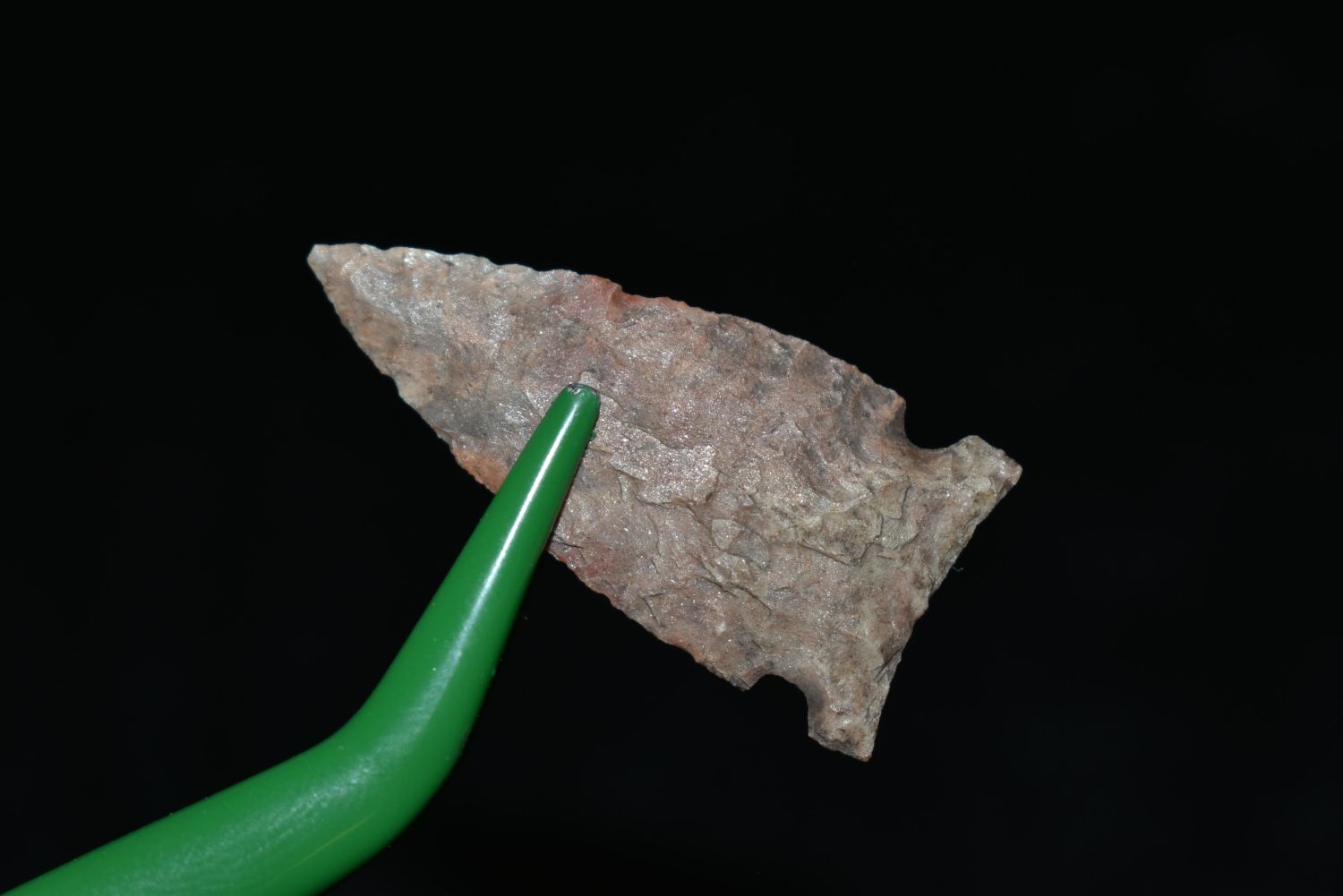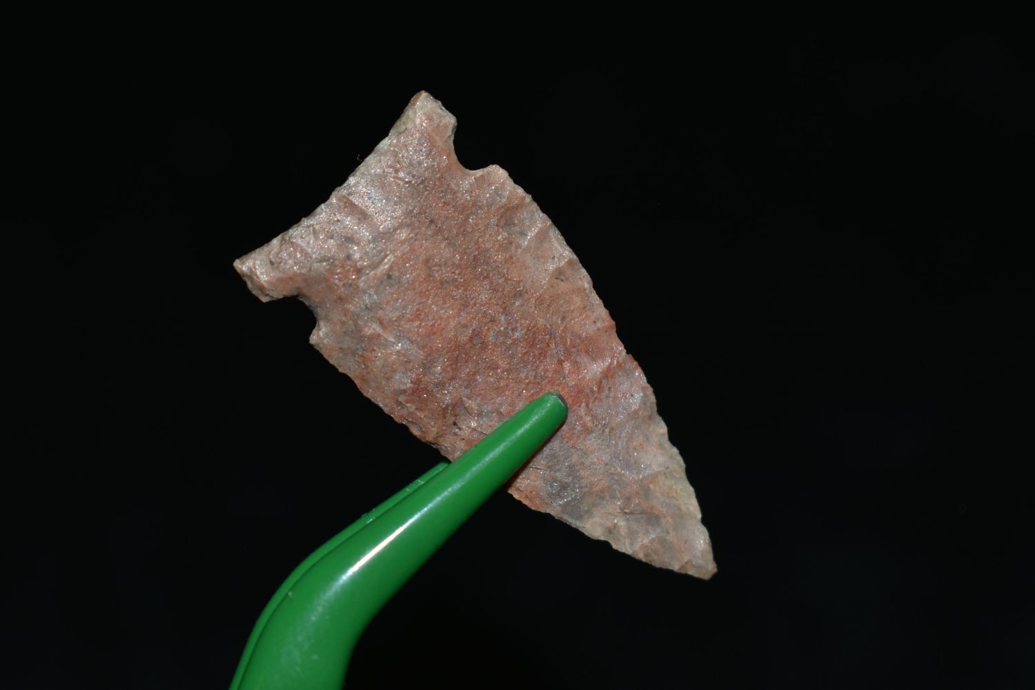 1 1/4" Avonlea point, made of colorful agate. Found in Musselshell, Montana. Creel Poore was born and raised in Musselshell, Montana where he found his first arrowhead at a very early age. This led Creel on a lifetime search for Montana’s prehistoric past. Creel owned a ranch in Musselshell and collected from sites and in and around the Musselshell River and tributaries. Every piece in Creel’s collection is personally found. He did not purchase pieces, nor did he accept pieces as gifts. He took pride in the fact he found every piece. He also made the cedar frames from cedar trees that were cut on his ranch. Many of the pieces were collected from the buffalo jumps which were plentiful nearby