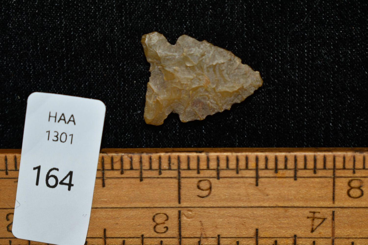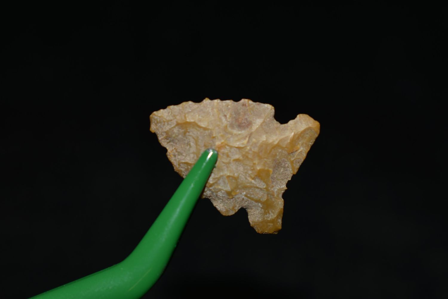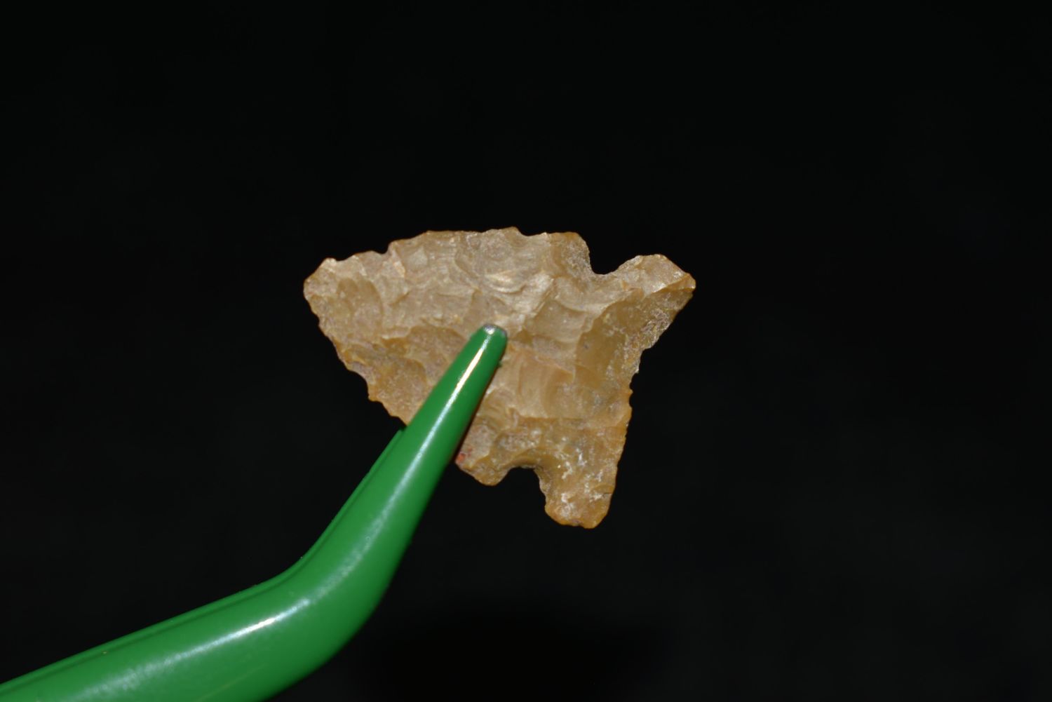 3/4" Avonlea point. Found in Musselshell, Montana. Creel Poore was born and raised in Musselshell, Montana where he found his first arrowhead at a very early age. This led Creel on a lifetime search for Montana’s prehistoric past. Creel owned a ranch in Musselshell and collected from sites and in and around the Musselshell River and tributaries. Every piece in Creel’s collection is personally found. He did not purchase pieces, nor did he accept pieces as gifts. He took pride in the fact he found every piece. He also made the cedar frames from cedar trees that were cut on his ranch. Many of the pieces were collected from the buffalo jumps which were plentiful nearby