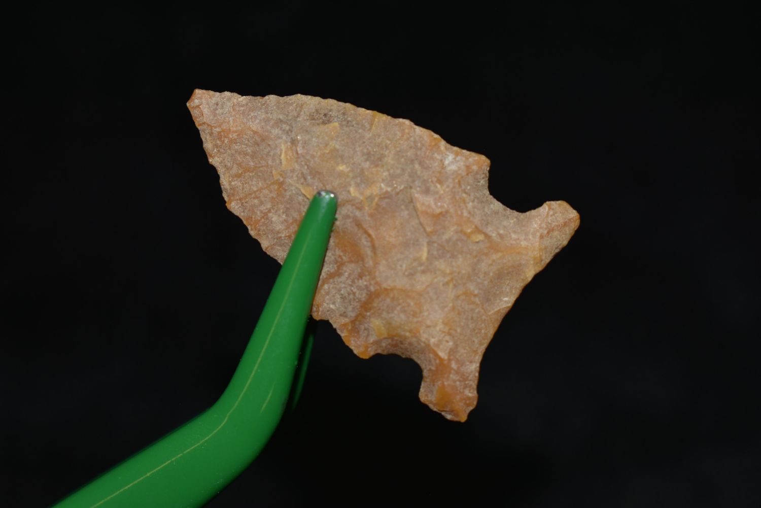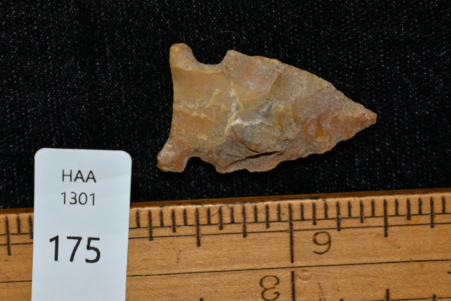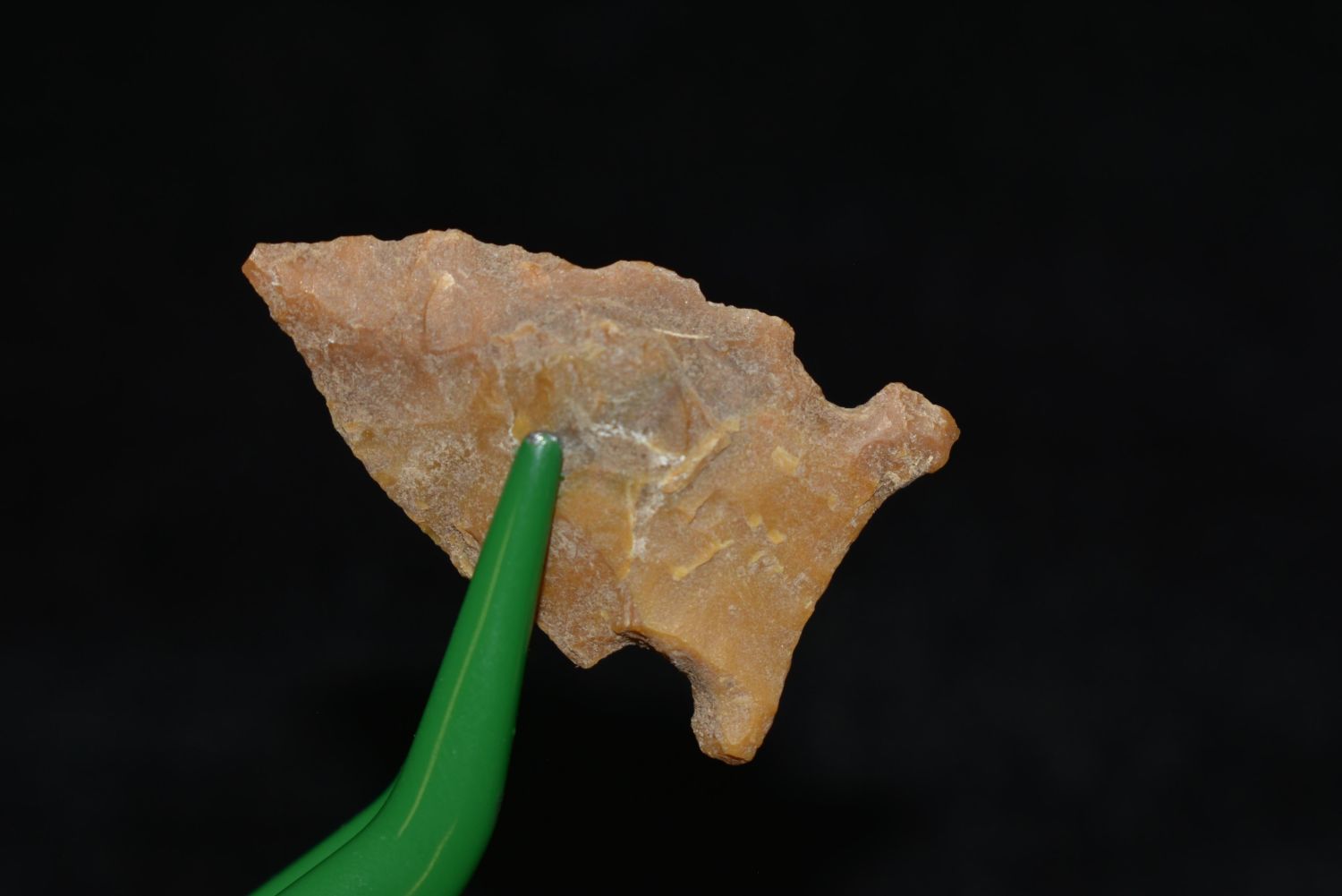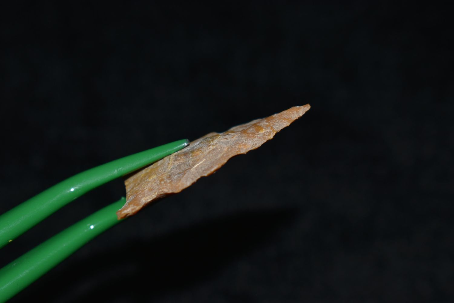1 1/8" Avonlea point. Found in Musselshell, Montana. Creel Poore was born and raised in Musselshell, Montana where he found his first arrowhead at a very early age. This led Creel on a lifetime search for Montana’s prehistoric past. Creel owned a ranch in Musselshell and collected from sites and in and around the Musselshell River and tributaries. Every piece in Creel’s collection is personally found. He did not purchase pieces, nor did he accept pieces as gifts. He took pride in the fact he found every piece. He also made the cedar frames from cedar trees that were cut on his ranch. Many of the pieces were collected from the buffalo jumps which were plentiful nearby