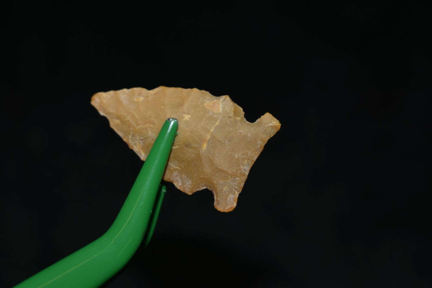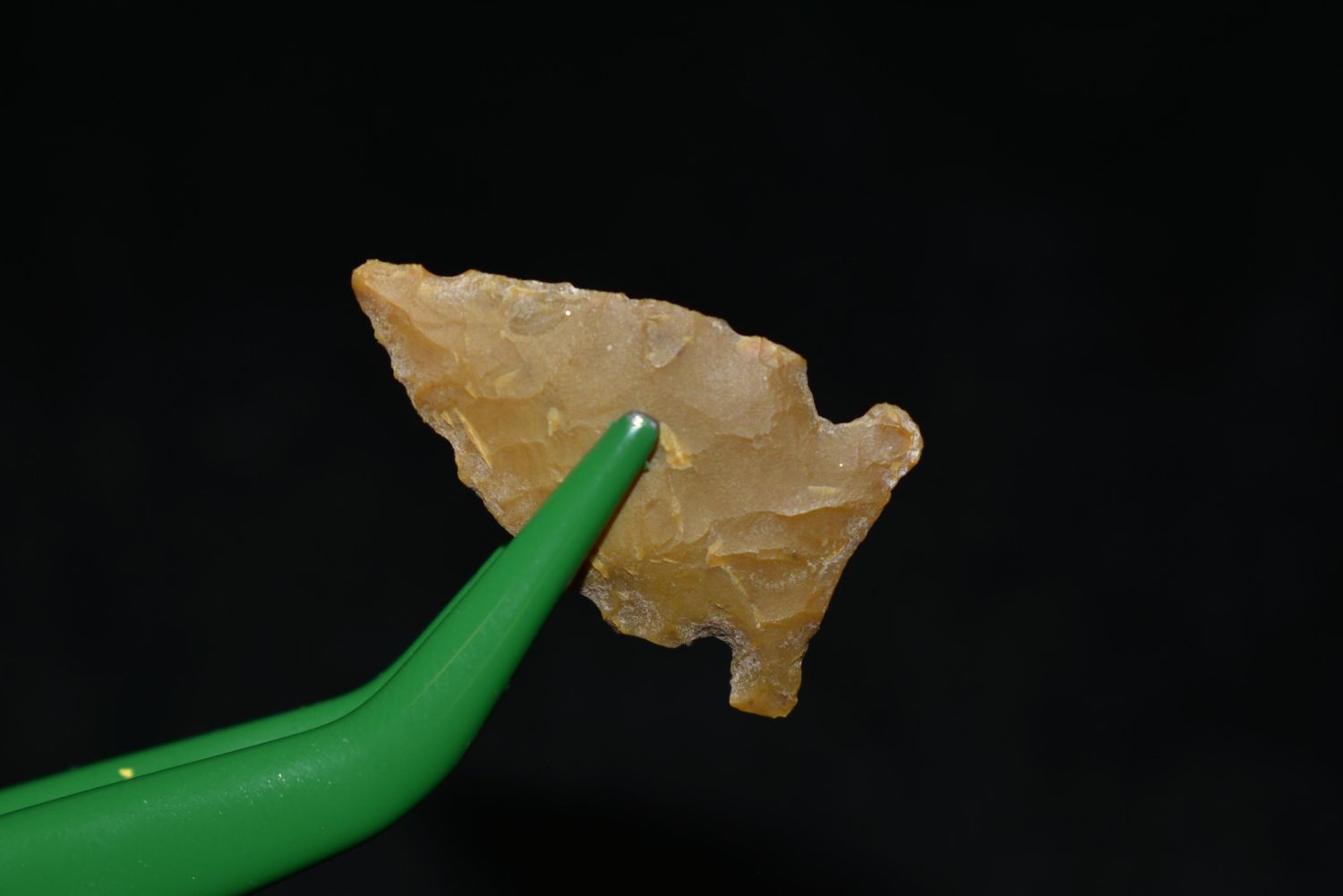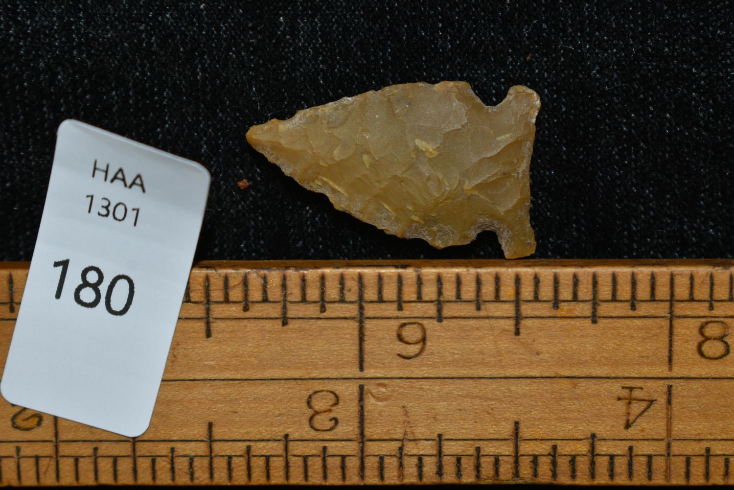 7/8" Avonlea point. Found in Musselshell, Montana. Creel Poore was born and raised in Musselshell, Montana where he found his first arrowhead at a very early age. This led Creel on a lifetime search for Montana’s prehistoric past. Creel owned a ranch in Musselshell and collected from sites and in and around the Musselshell River and tributaries. Every piece in Creel’s collection is personally found. He did not purchase pieces, nor did he accept pieces as gifts. He took pride in the fact he found every piece. He also made the cedar frames from cedar trees that were cut on his ranch. Many of the pieces were collected from the buffalo jumps which were plentiful nearby