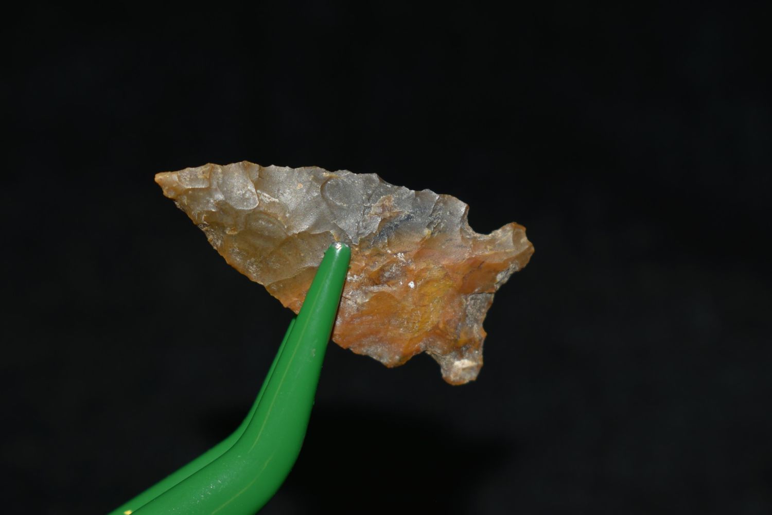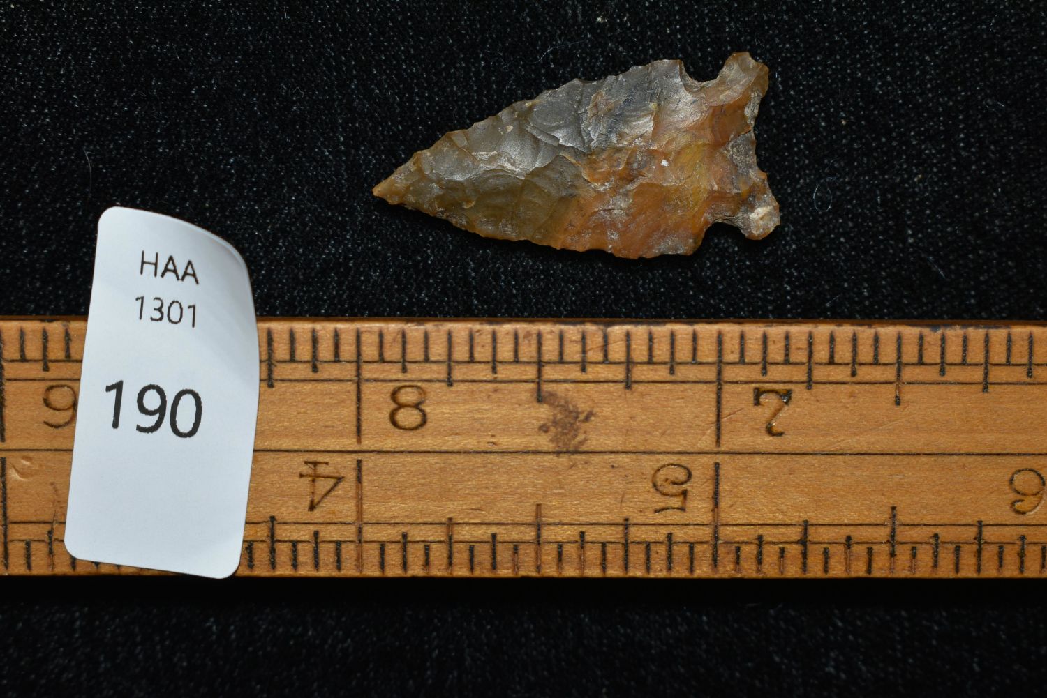 1" very colorful agate point, Found in Musselshell, Montana. Creel Poore was born and raised in Musselshell, Montana where he found his first arrowhead at a very early age. This led Creel on a lifetime search for Montana’s prehistoric past. Creel owned a ranch in Musselshell and collected from sites and in and around the Musselshell River and tributaries. Every piece in Creel’s collection is personally found. He did not purchase pieces, nor did he accept pieces as gifts. He took pride in the fact he found every piece. He also made the cedar frames from cedar trees that were cut on his ranch. Many of the pieces were collected from the buffalo jumps which were plentiful nearby