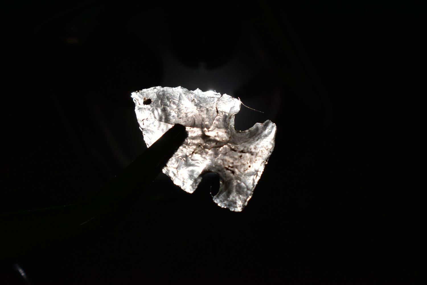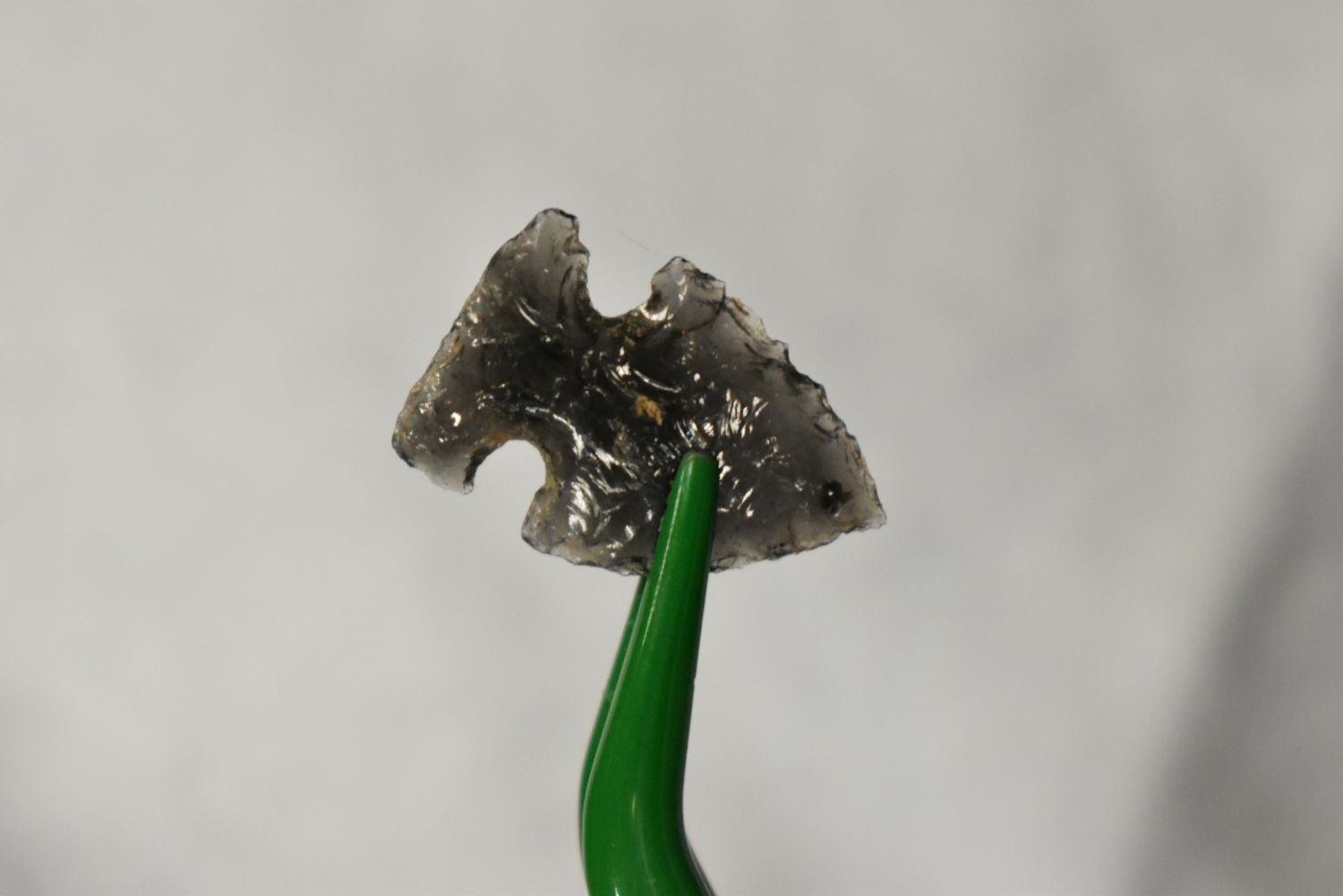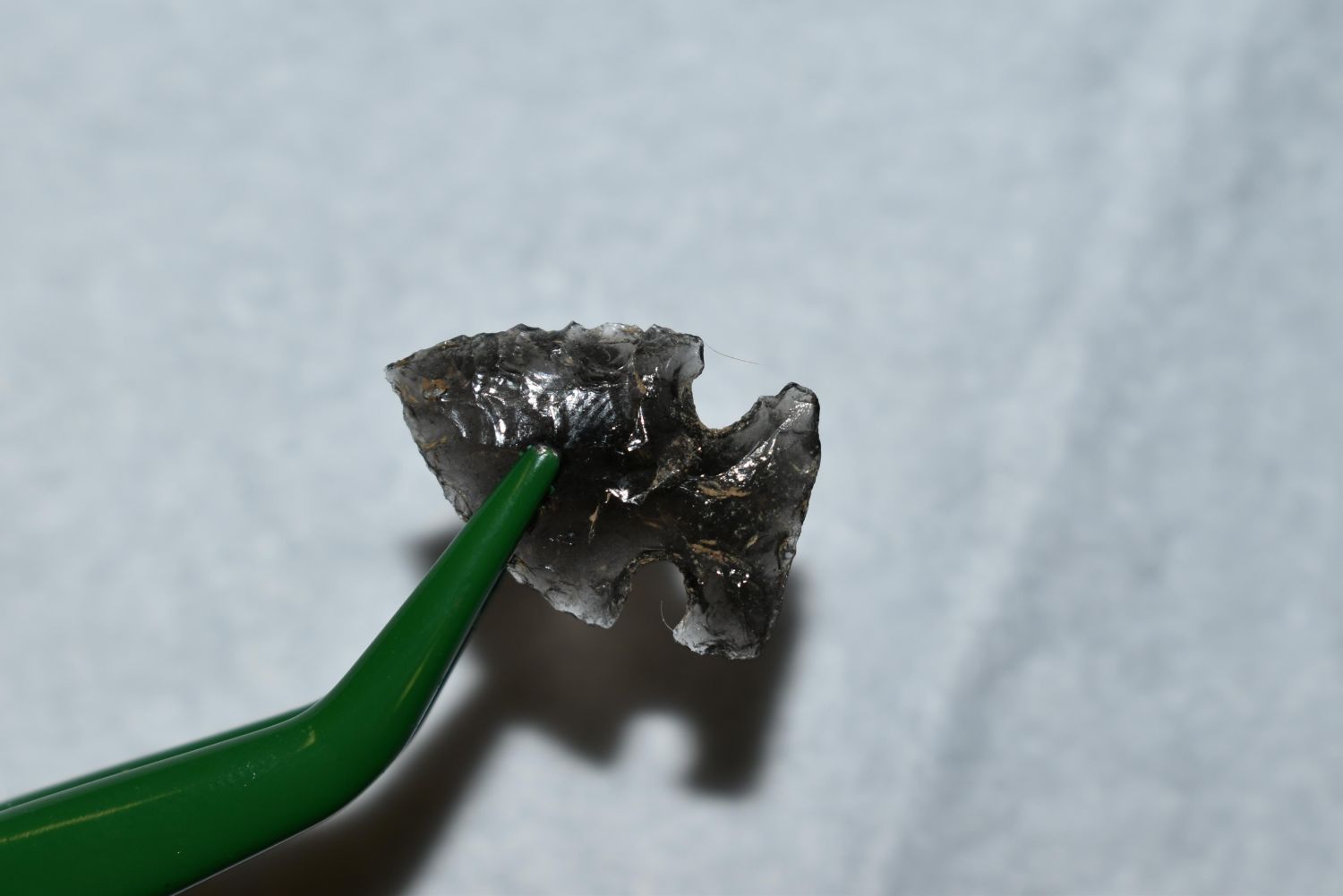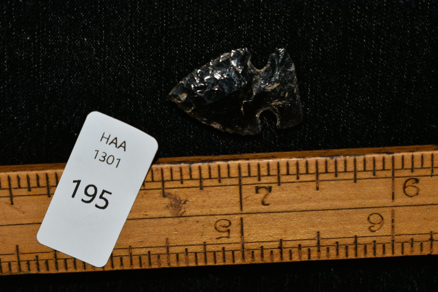 3/4" Prairie side notch, obsidian, Found in Musselshell, Montana. Creel Poore was born and raised in Musselshell, Montana where he found his first arrowhead at a very early age. This led Creel on a lifetime search for Montana’s prehistoric past. Creel owned a ranch in Musselshell and collected from sites and in and around the Musselshell River and tributaries. Every piece in Creel’s collection is personally found. He did not purchase pieces, nor did he accept pieces as gifts. He took pride in the fact he found every piece. He also made the cedar frames from cedar trees that were cut on his ranch. Many of the pieces were collected from the buffalo jumps which were plentiful nearby