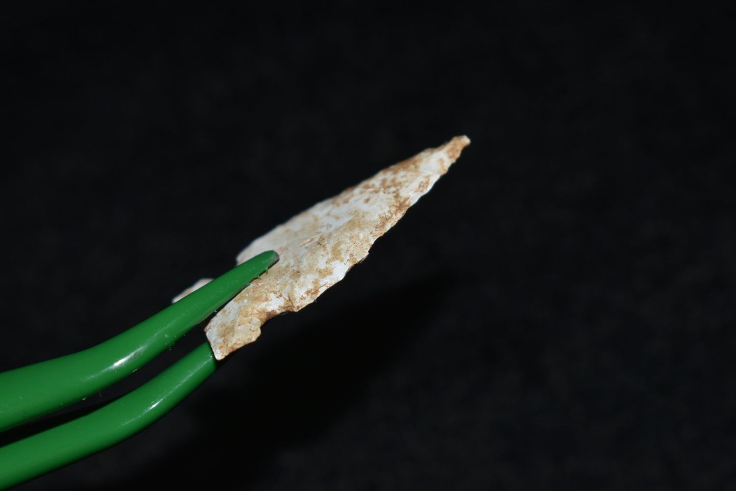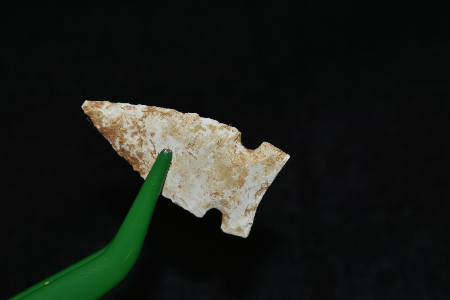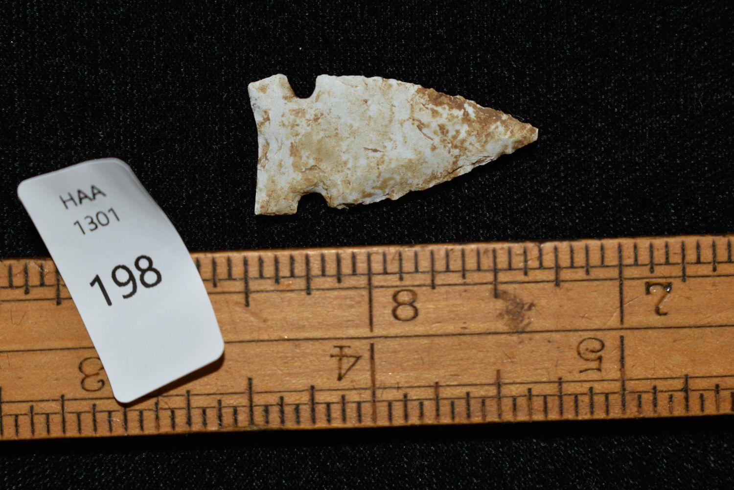 1 1/8" Avonlea point, Found in Musselshell, Montana. Creel Poore was born and raised in Musselshell, Montana where he found his first arrowhead at a very early age. This led Creel on a lifetime search for Montana’s prehistoric past. Creel owned a ranch in Musselshell and collected from sites and in and around the Musselshell River and tributaries. Every piece in Creel’s collection is personally found. He did not purchase pieces, nor did he accept pieces as gifts. He took pride in the fact he found every piece. He also made the cedar frames from cedar trees that were cut on his ranch. Many of the pieces were collected from the buffalo jumps which were plentiful nearby