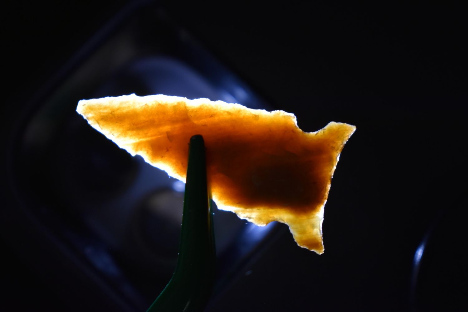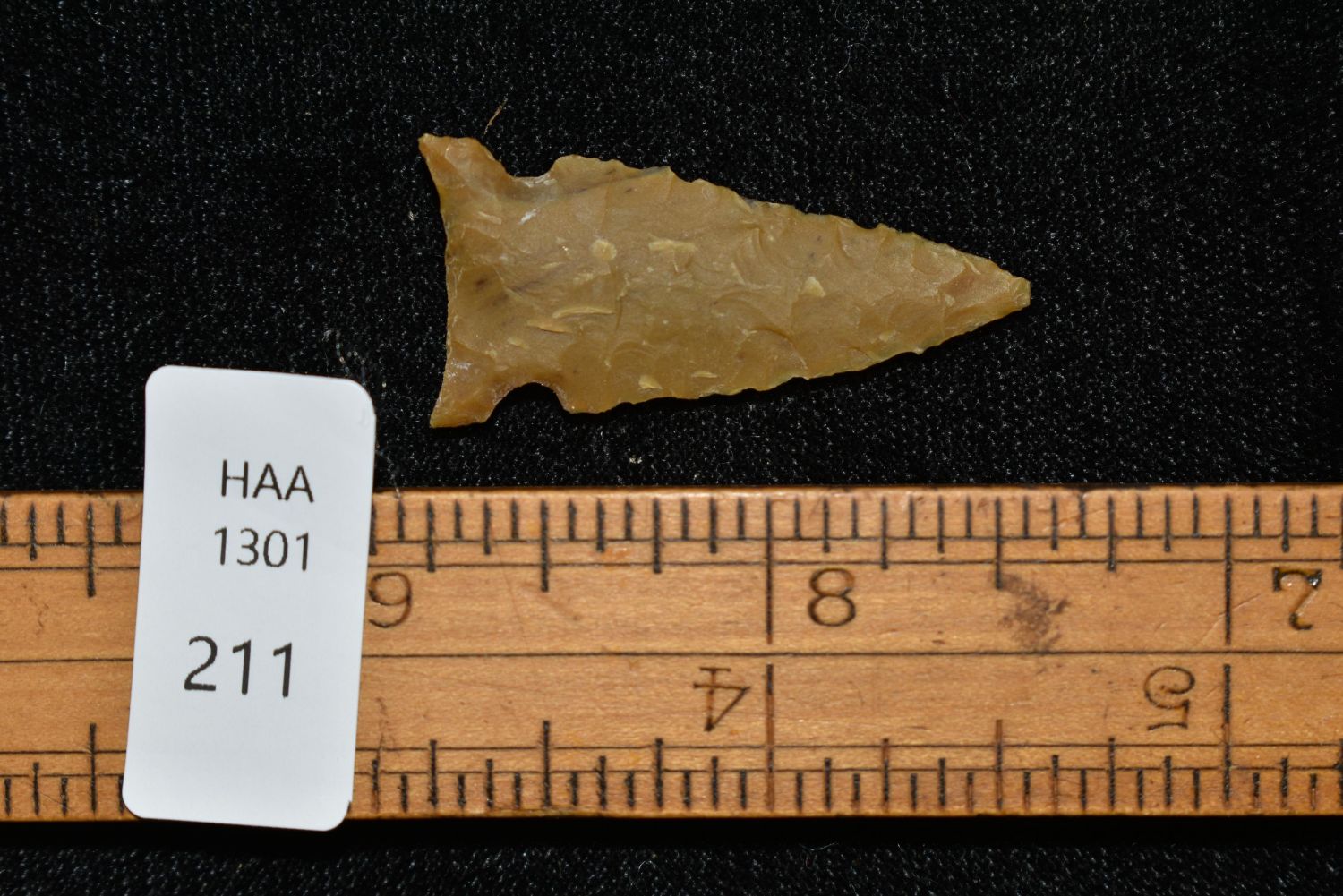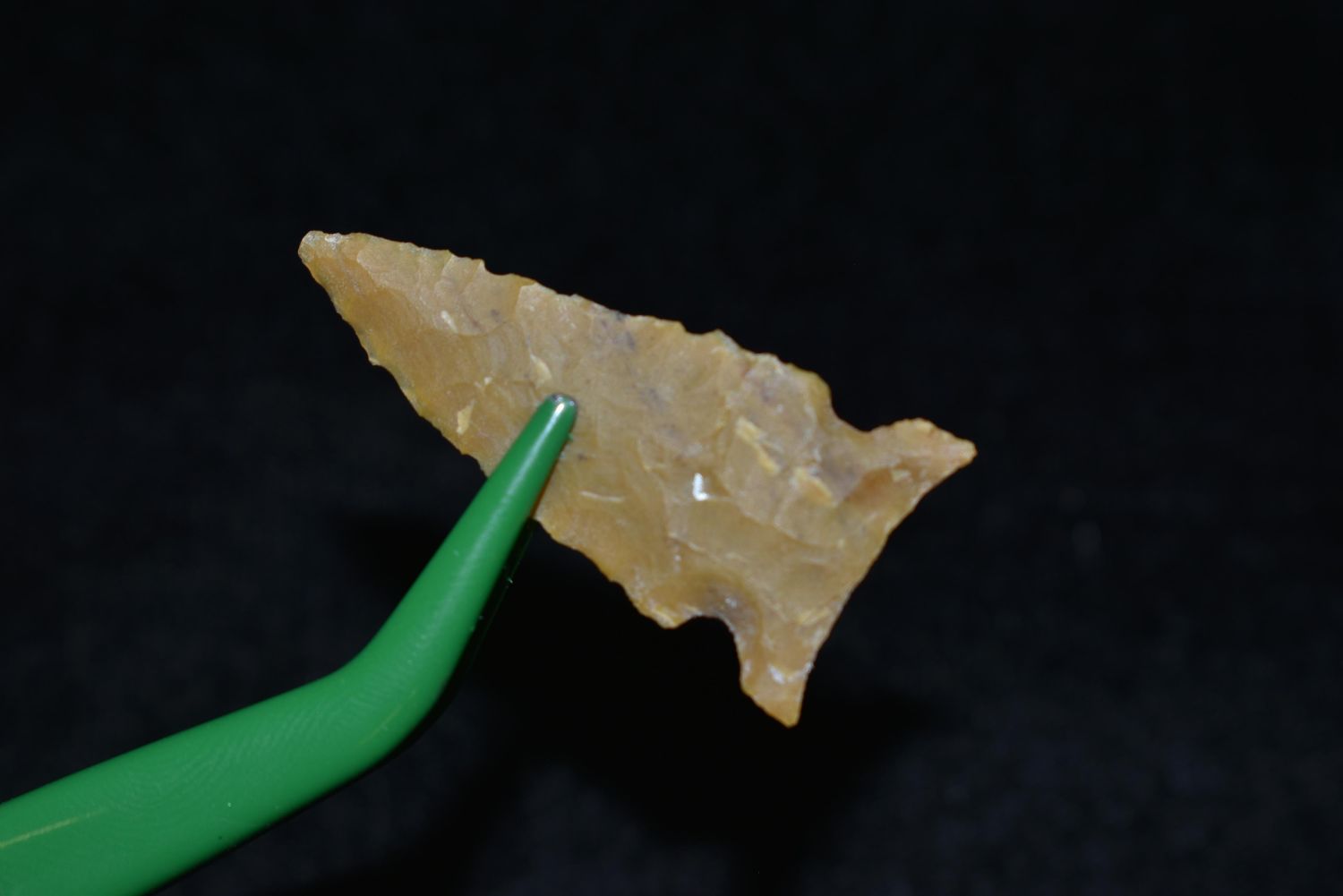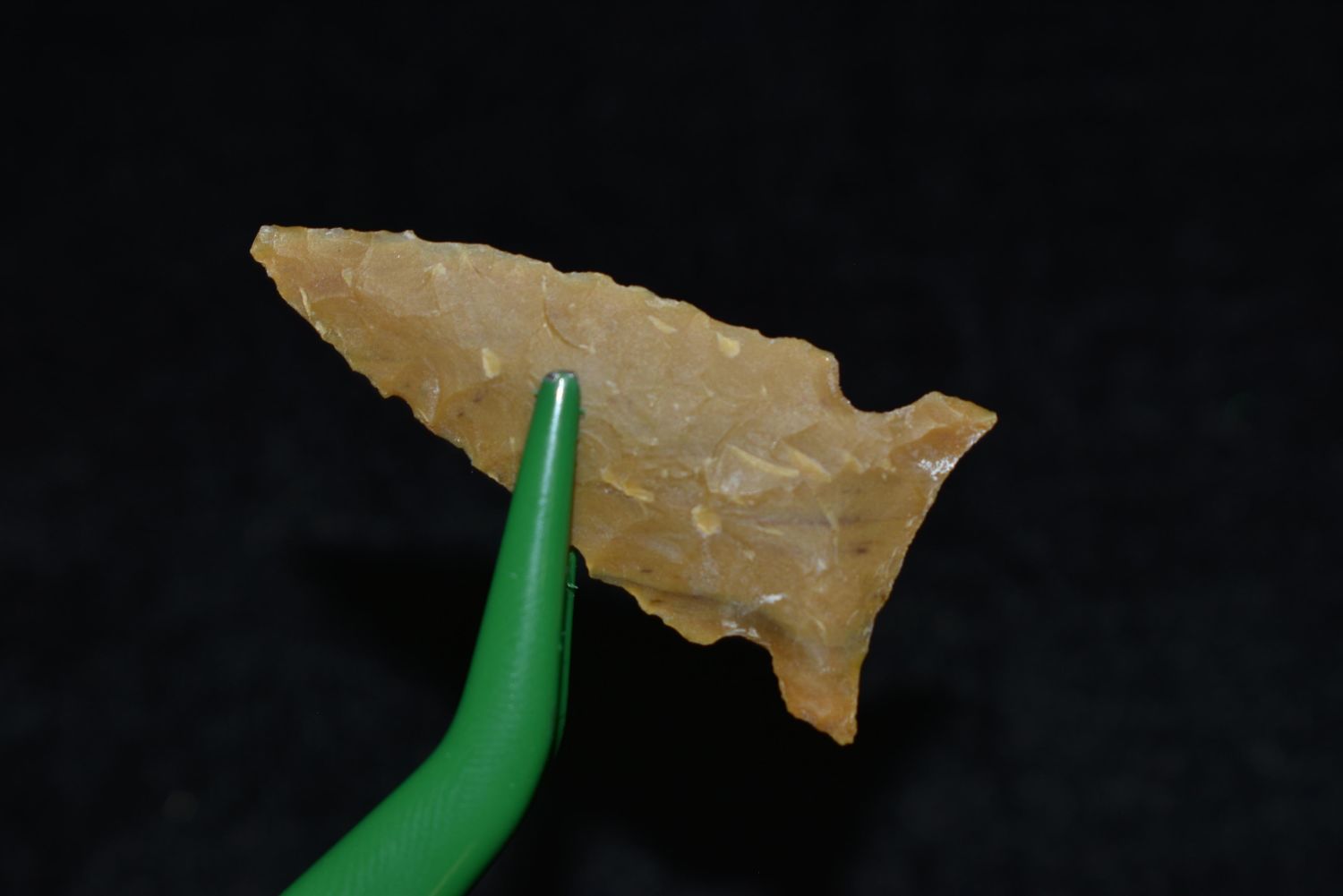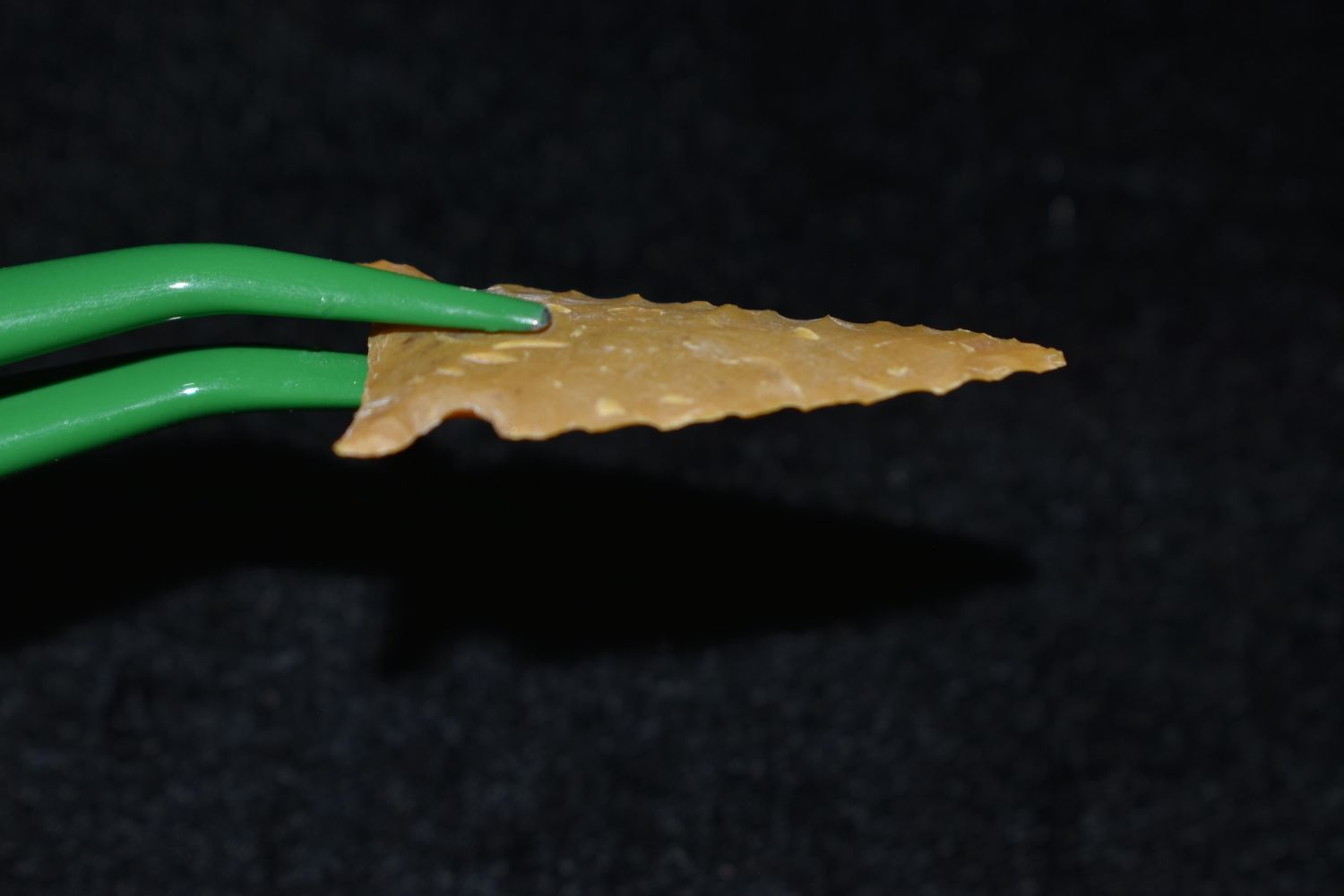 1 3/8" Avonlea point, Found in Musselshell, Montana. Creel Poore was born and raised in Musselshell, Montana where he found his first arrowhead at a very early age. This led Creel on a lifetime search for Montana’s prehistoric past. Creel owned a ranch in Musselshell and collected from sites and in and around the Musselshell River and tributaries. Every piece in Creel’s collection is personally found. He did not purchase pieces, nor did he accept pieces as gifts. He took pride in the fact he found every piece. He also made the cedar frames from cedar trees that were cut on his ranch. Many of the pieces were collected from the buffalo jumps which were plentiful nearby