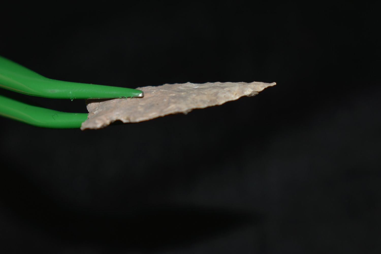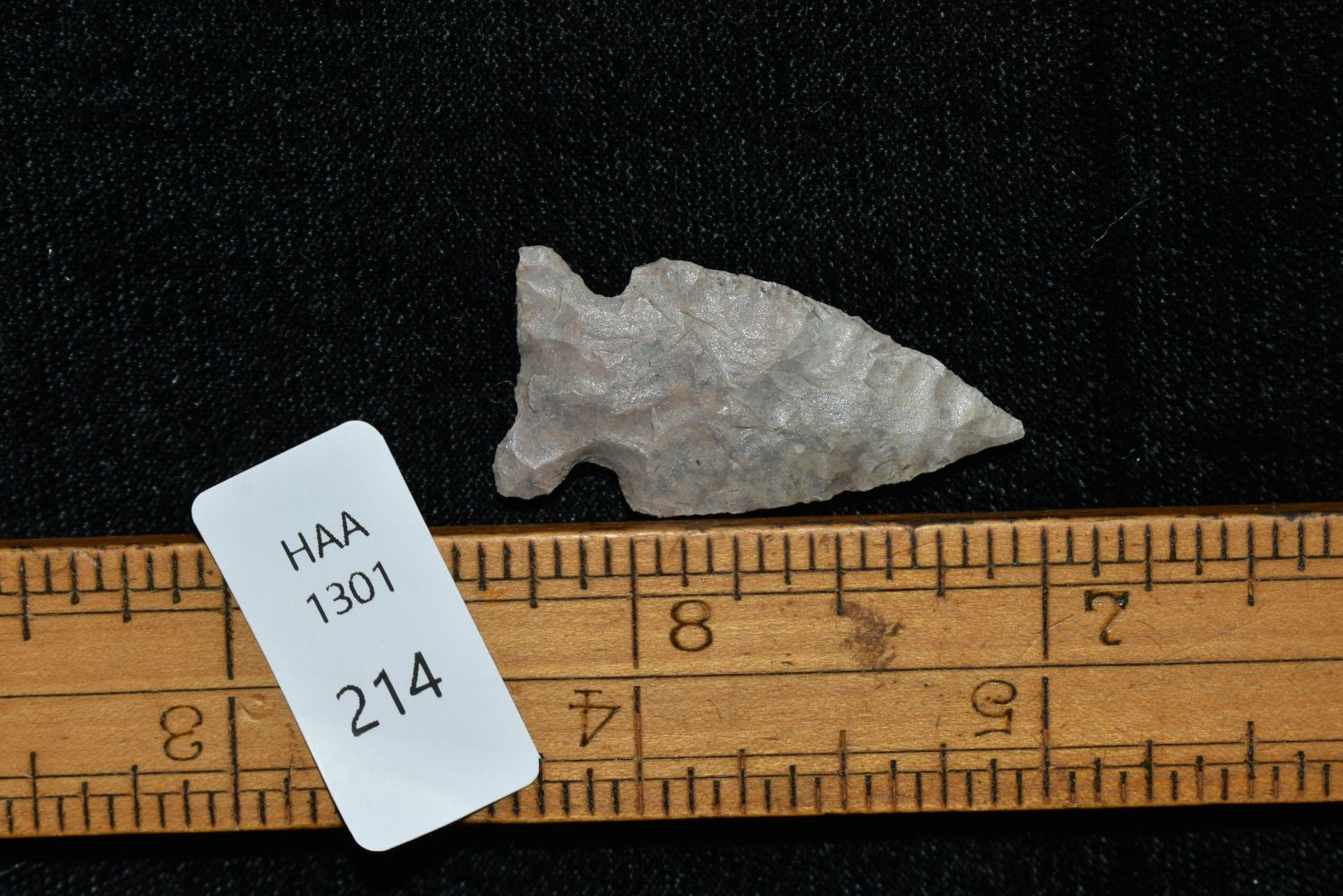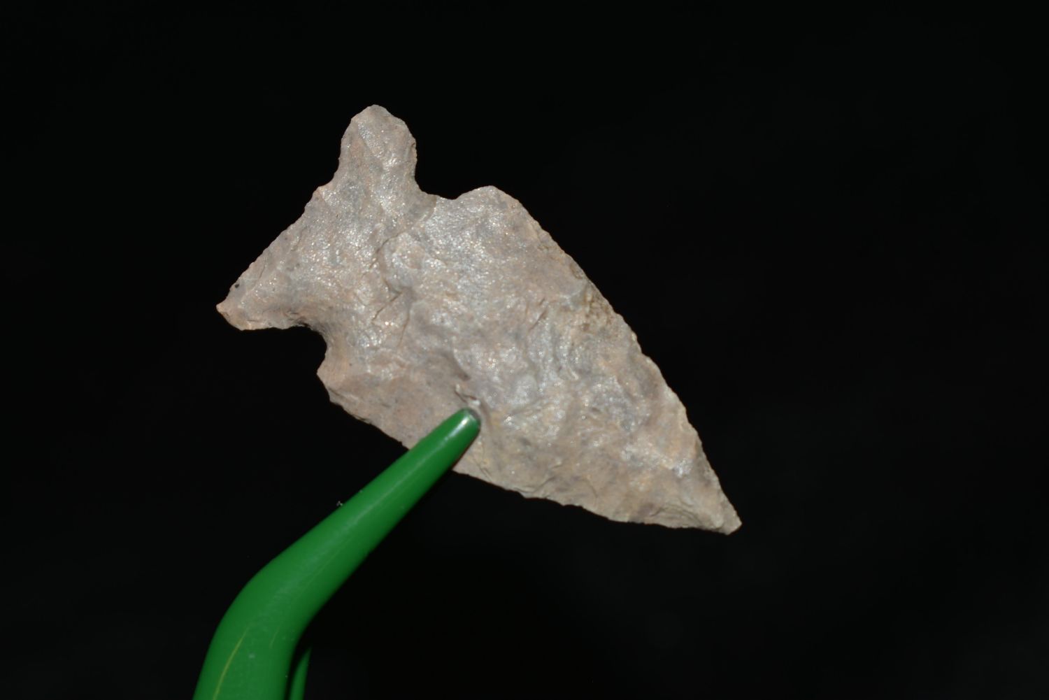 1 1/4" Avonlea point, Found in Musselshell, Montana. Creel Poore was born and raised in Musselshell, Montana where he found his first arrowhead at a very early age. This led Creel on a lifetime search for Montana’s prehistoric past. Creel owned a ranch in Musselshell and collected from sites and in and around the Musselshell River and tributaries. Every piece in Creel’s collection is personally found. He did not purchase pieces, nor did he accept pieces as gifts. He took pride in the fact he found every piece. He also made the cedar frames from cedar trees that were cut on his ranch. Many of the pieces were collected from the buffalo jumps which were plentiful nearby