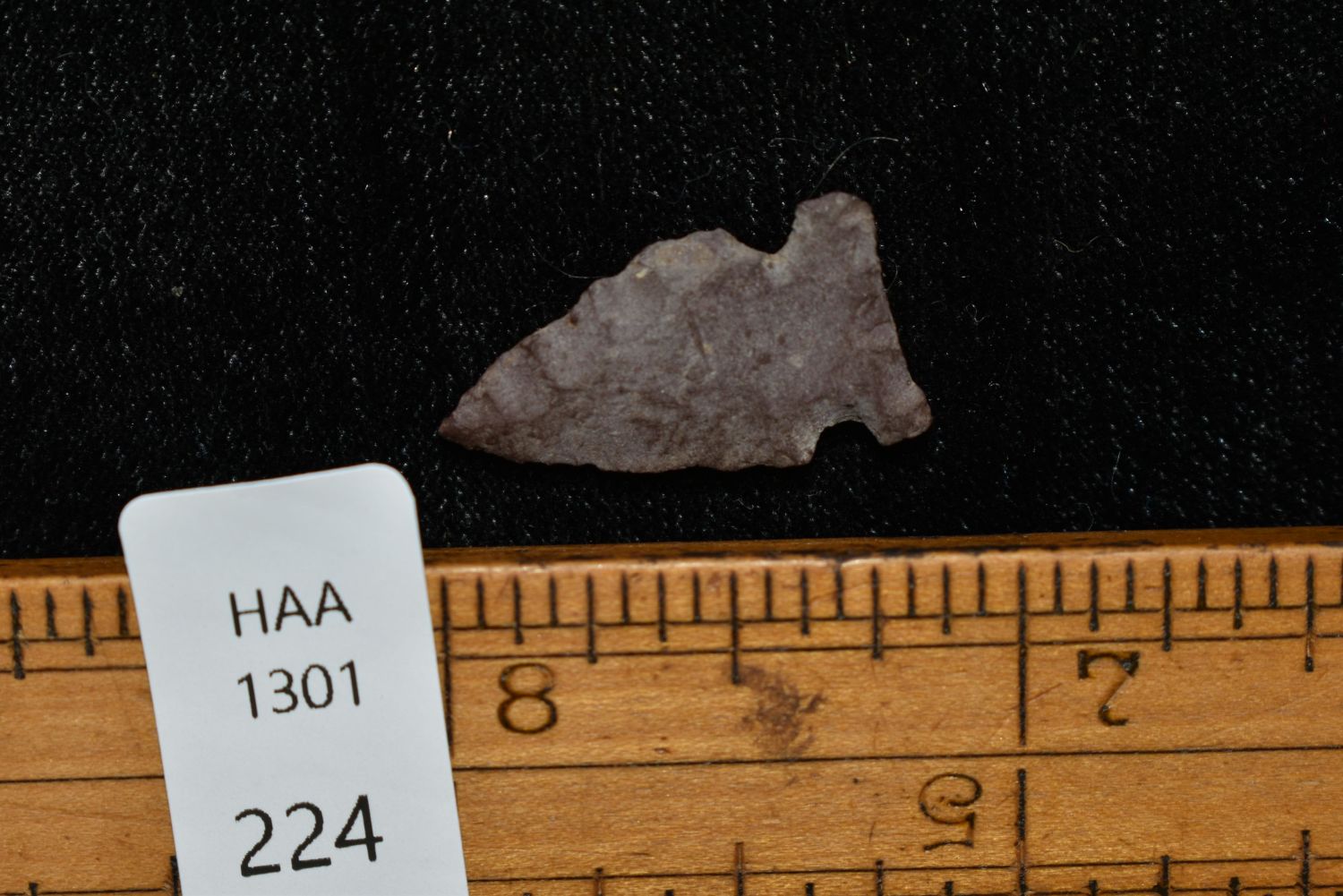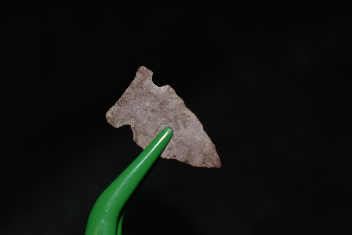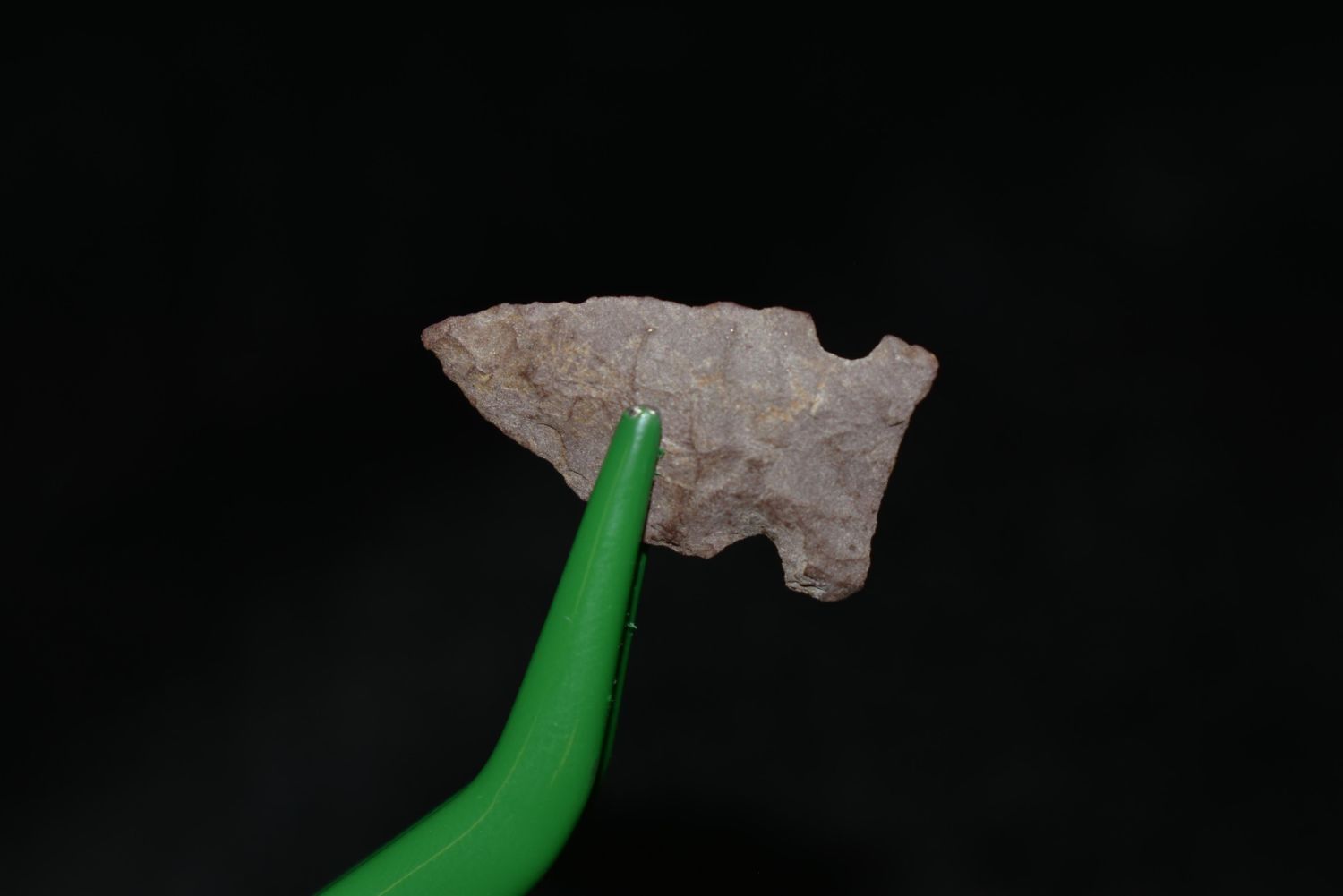 3/4 " Avonlea point, Found in Musselshell, Montana. Creel Poore was born and raised in Musselshell, Montana where he found his first arrowhead at a very early age. This led Creel on a lifetime search for Montana’s prehistoric past. Creel owned a ranch in Musselshell and collected from sites and in and around the Musselshell River and tributaries. Every piece in Creel’s collection is personally found. He did not purchase pieces, nor did he accept pieces as gifts. He took pride in the fact he found every piece. He also made the cedar frames from cedar trees that were cut on his ranch. Many of the pieces were collected from the buffalo jumps which were plentiful nearby