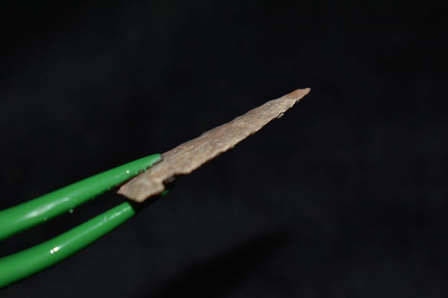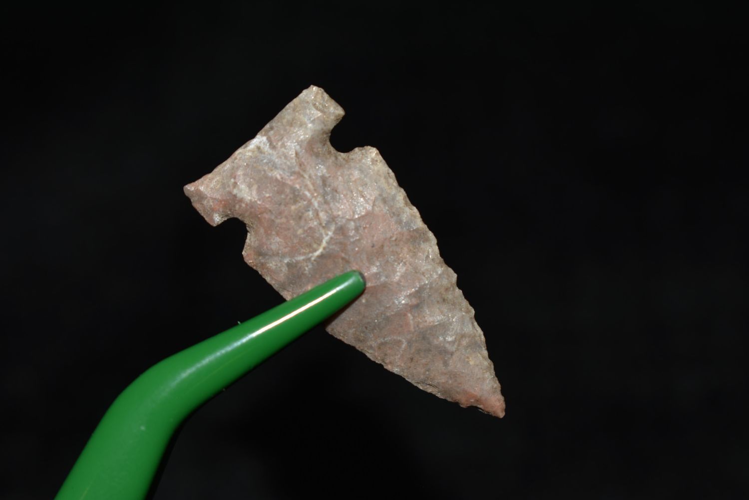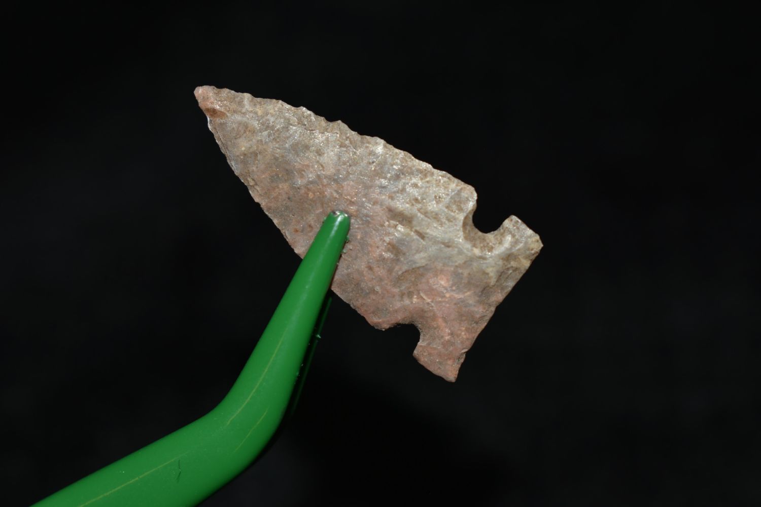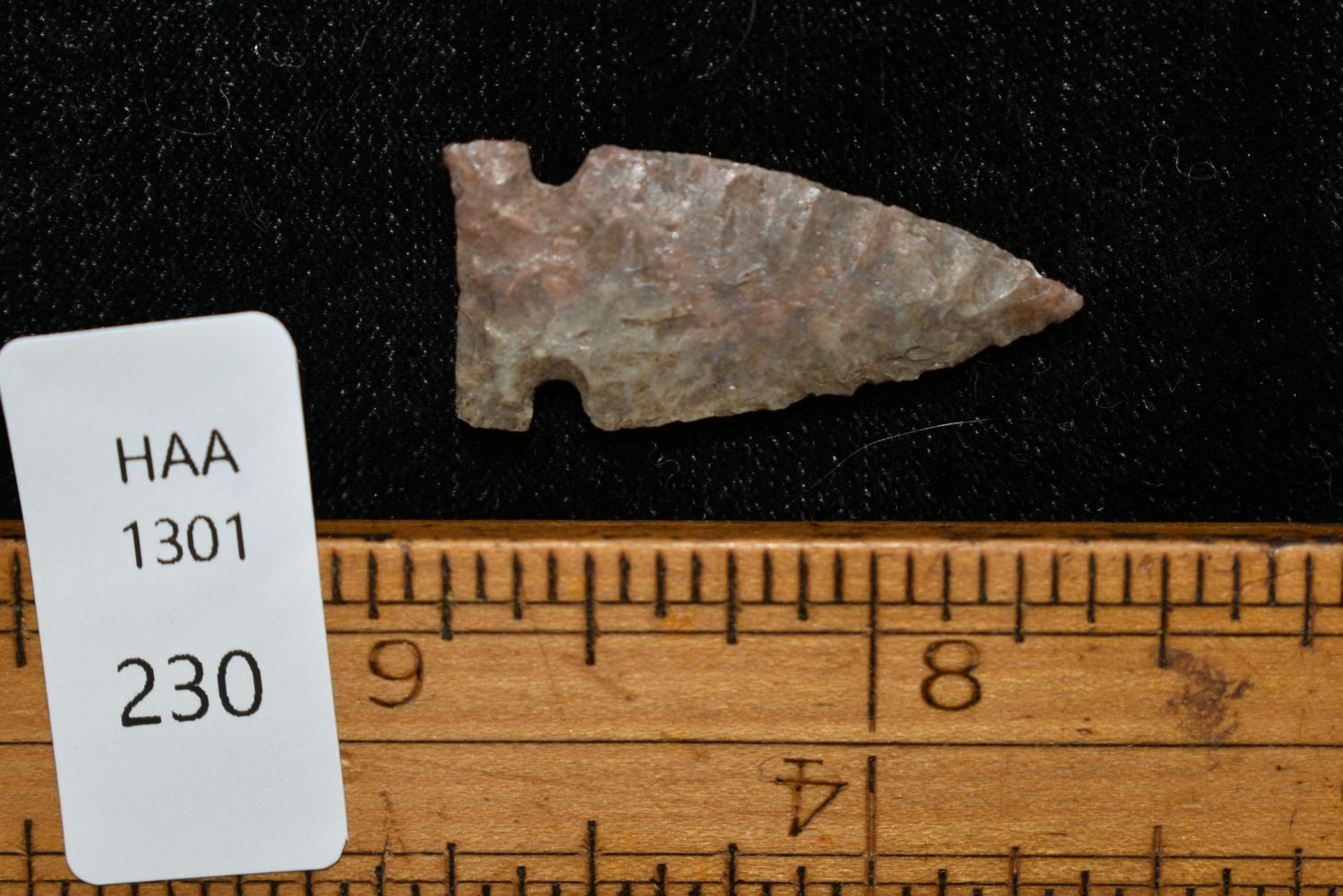 1 1/16" Prarie side notch point, Found in Musselshell, Montana. Creel Poore was born and raised in Musselshell, Montana where he found his first arrowhead at a very early age. This led Creel on a lifetime search for Montana’s prehistoric past. Creel owned a ranch in Musselshell and collected from sites and in and around the Musselshell River and tributaries. Every piece in Creel’s collection is personally found. He did not purchase pieces, nor did he accept pieces as gifts. He took pride in the fact he found every piece. He also made the cedar frames from cedar trees that were cut on his ranch. Many of the pieces were collected from the buffalo jumps which were plentiful nearby