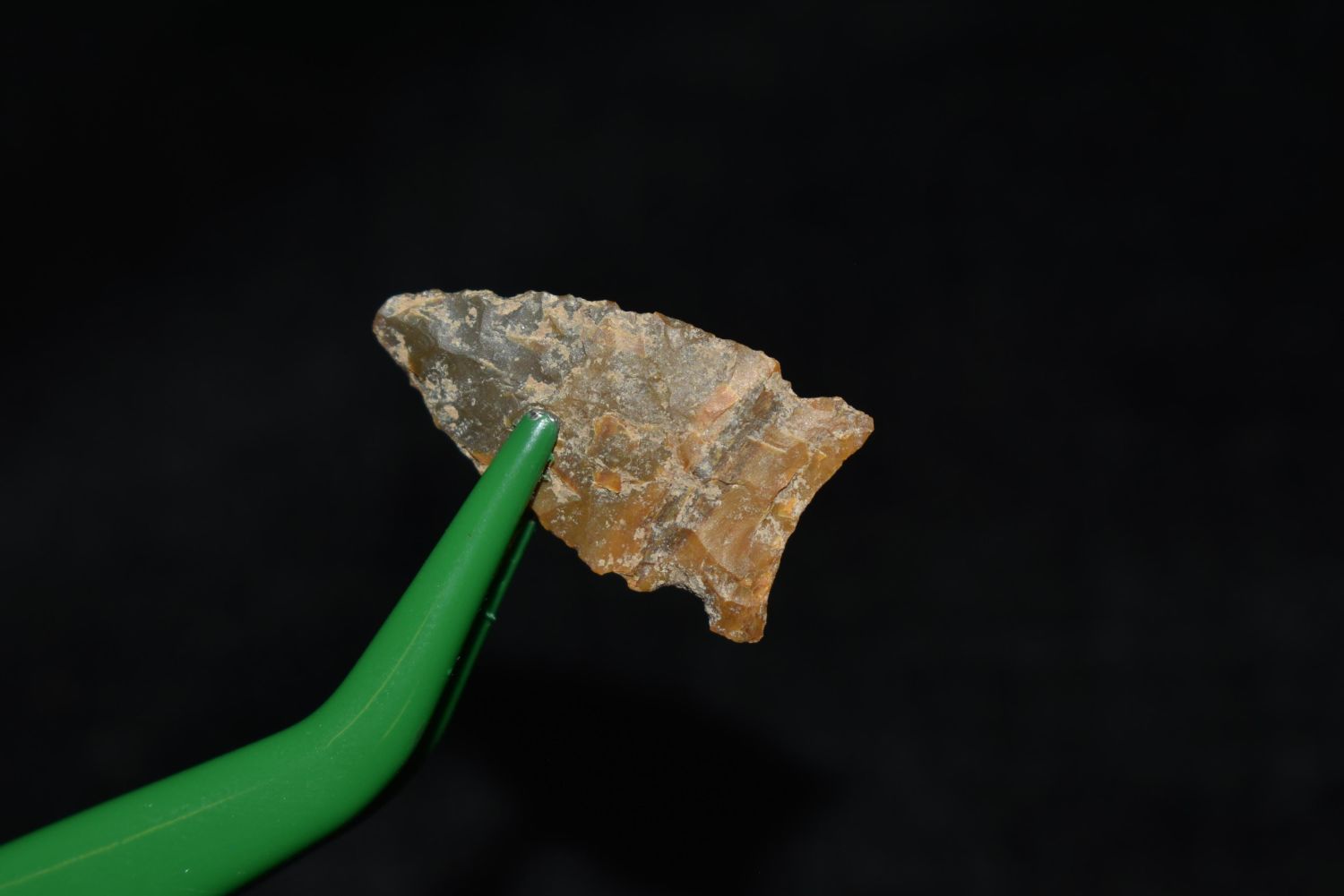 7/8" Besant point, Found in Musselshell, Montana. Creel Poore was born and raised in Musselshell, Montana where he found his first arrowhead at a very early age. This led Creel on a lifetime search for Montana’s prehistoric past. Creel owned a ranch in Musselshell and collected from sites and in and around the Musselshell River and tributaries. Every piece in Creel’s collection is personally found. He did not purchase pieces, nor did he accept pieces as gifts. He took pride in the fact he found every piece. He also made the cedar frames from cedar trees that were cut on his ranch. Many of the pieces were collected from the buffalo jumps which were plentiful nearby
