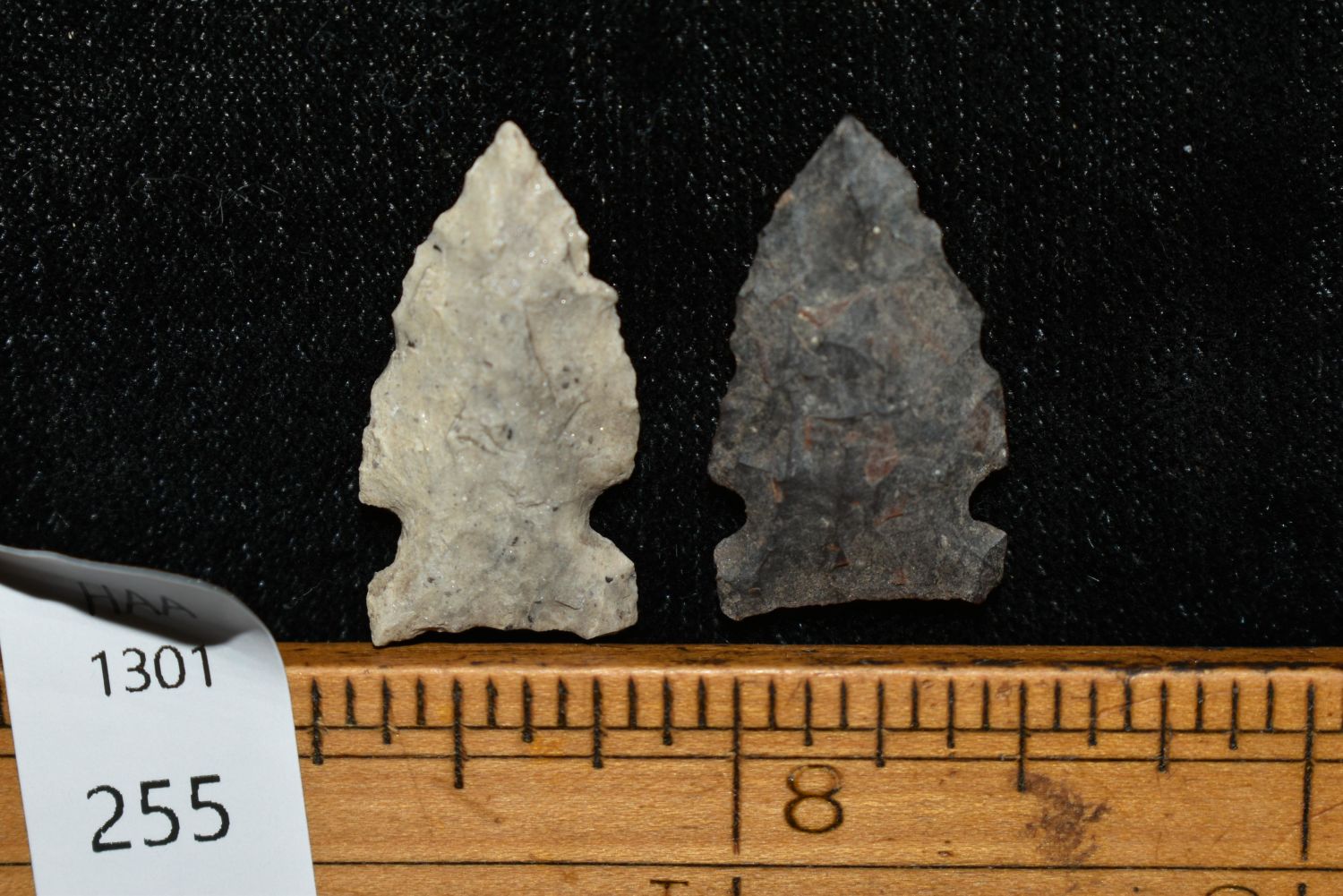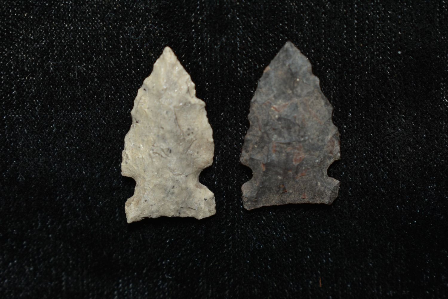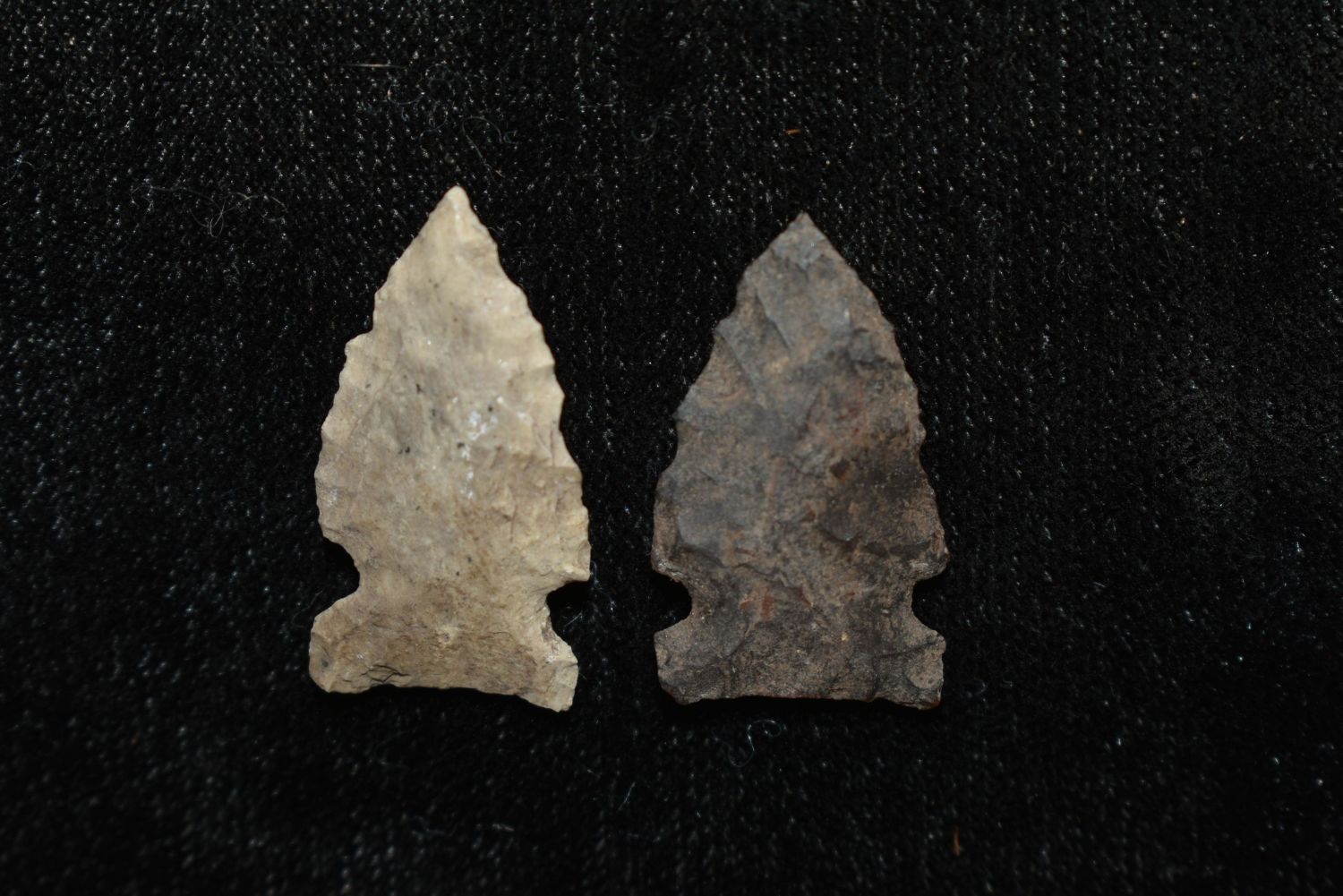 Lot of 2 Prairie Side Notch points, Found in Musselshell, Montana. Creel Poore was born and raised in Musselshell, Montana where he found his first arrowhead at a very early age. This led Creel on a lifetime search for Montana’s prehistoric past. Creel owned a ranch in Musselshell and collected from sites and in and around the Musselshell River and tributaries. Every piece in Creel’s collection is personally found. He did not purchase pieces, nor did he accept pieces as gifts. He took pride in the fact he found every piece. He also made the cedar frames from cedar trees that were cut on his ranch. Many of the pieces were collected from the buffalo jumps which were plentiful nearby