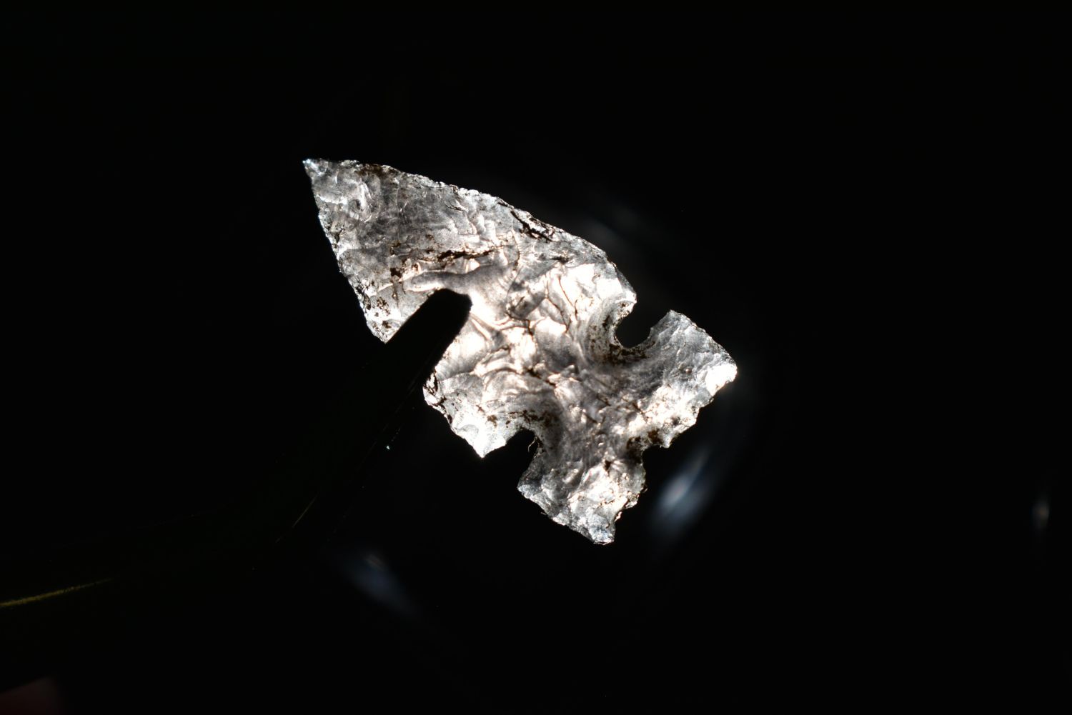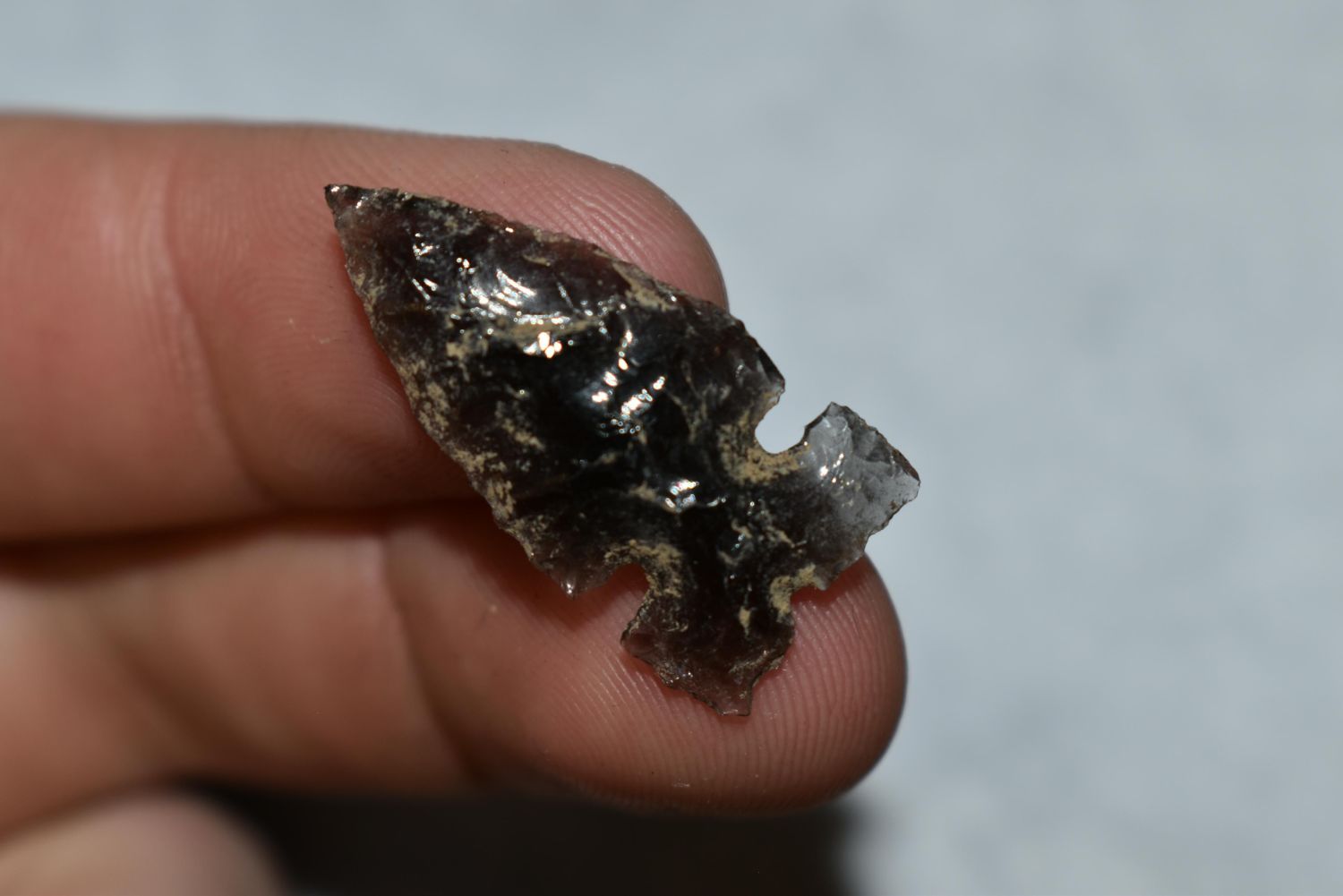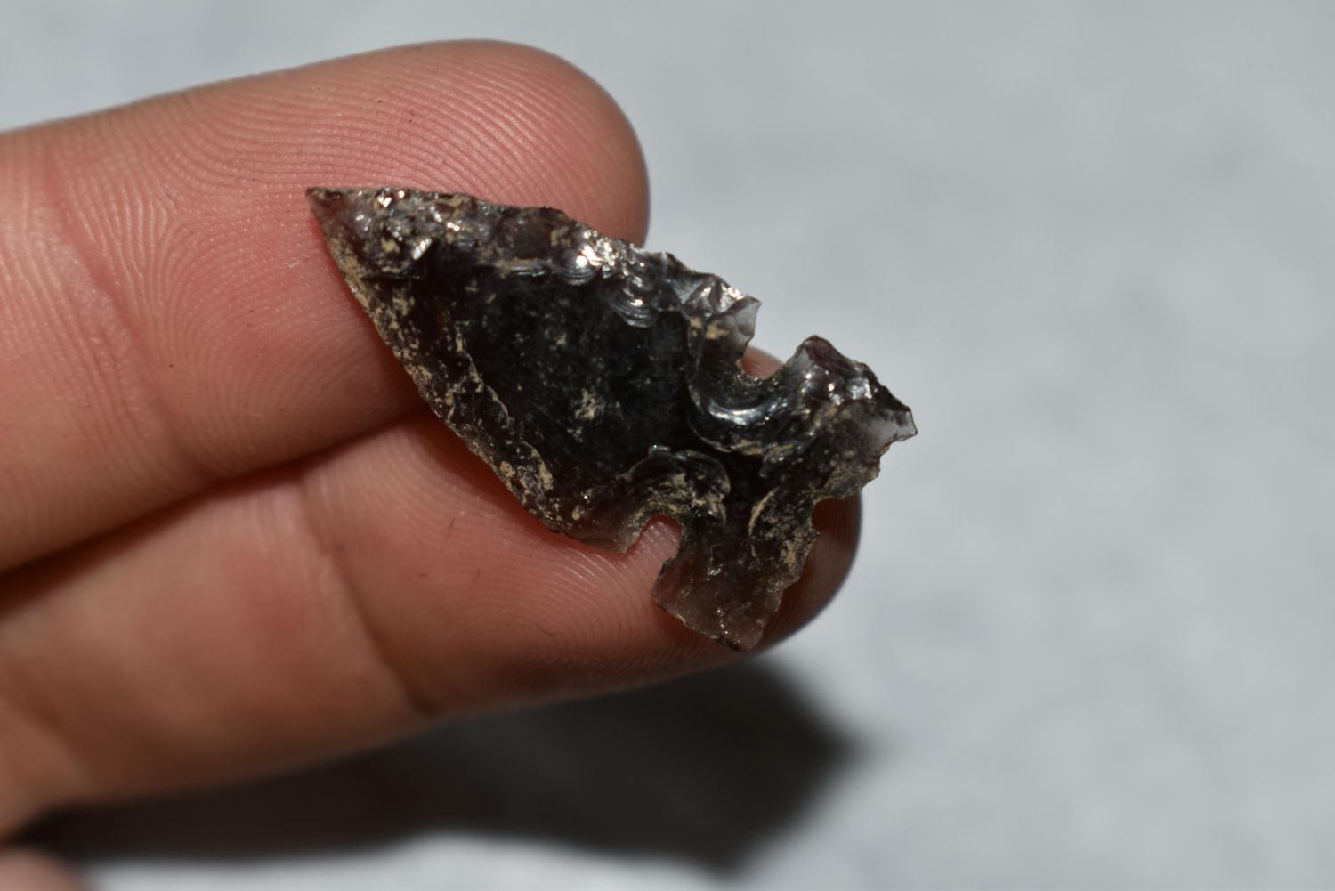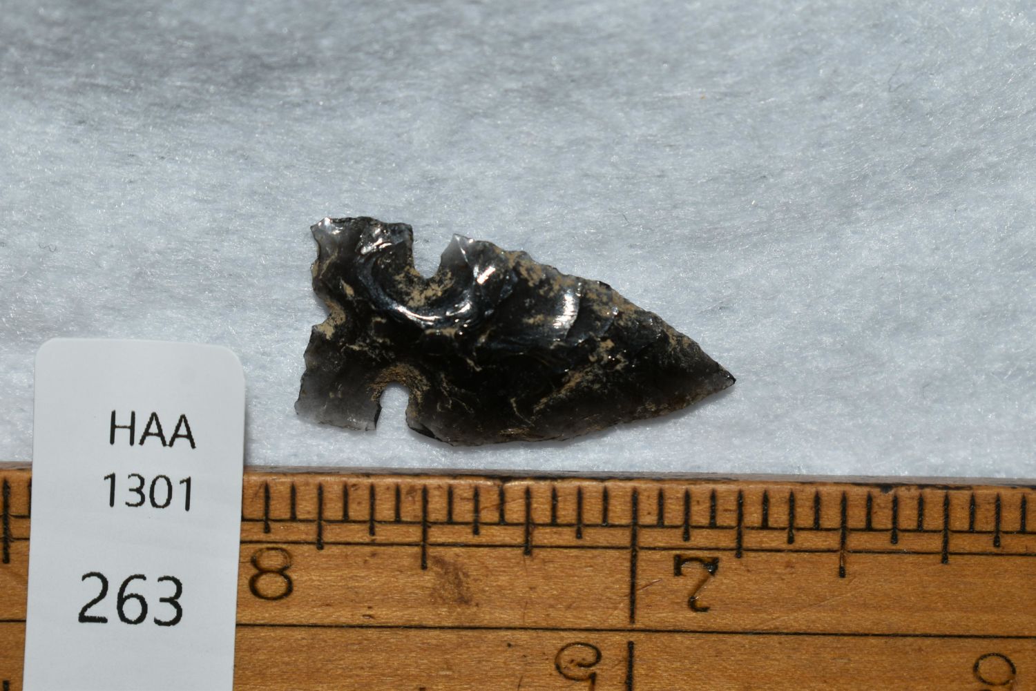 1 1/8" Billings Point, Obsidian, Found in Musselshell, Montana. Creel Poore was born and raised in Musselshell, Montana where he found his first arrowhead at a very early age. This led Creel on a lifetime search for Montana’s prehistoric past. Creel owned a ranch in Musselshell and collected from sites and in and around the Musselshell River and tributaries. Every piece in Creel’s collection is personally found. He did not purchase pieces, nor did he accept pieces as gifts. He took pride in the fact he found every piece. He also made the cedar frames from cedar trees that were cut on his ranch. Many of the pieces were collected from the buffalo jumps which were plentiful nearby