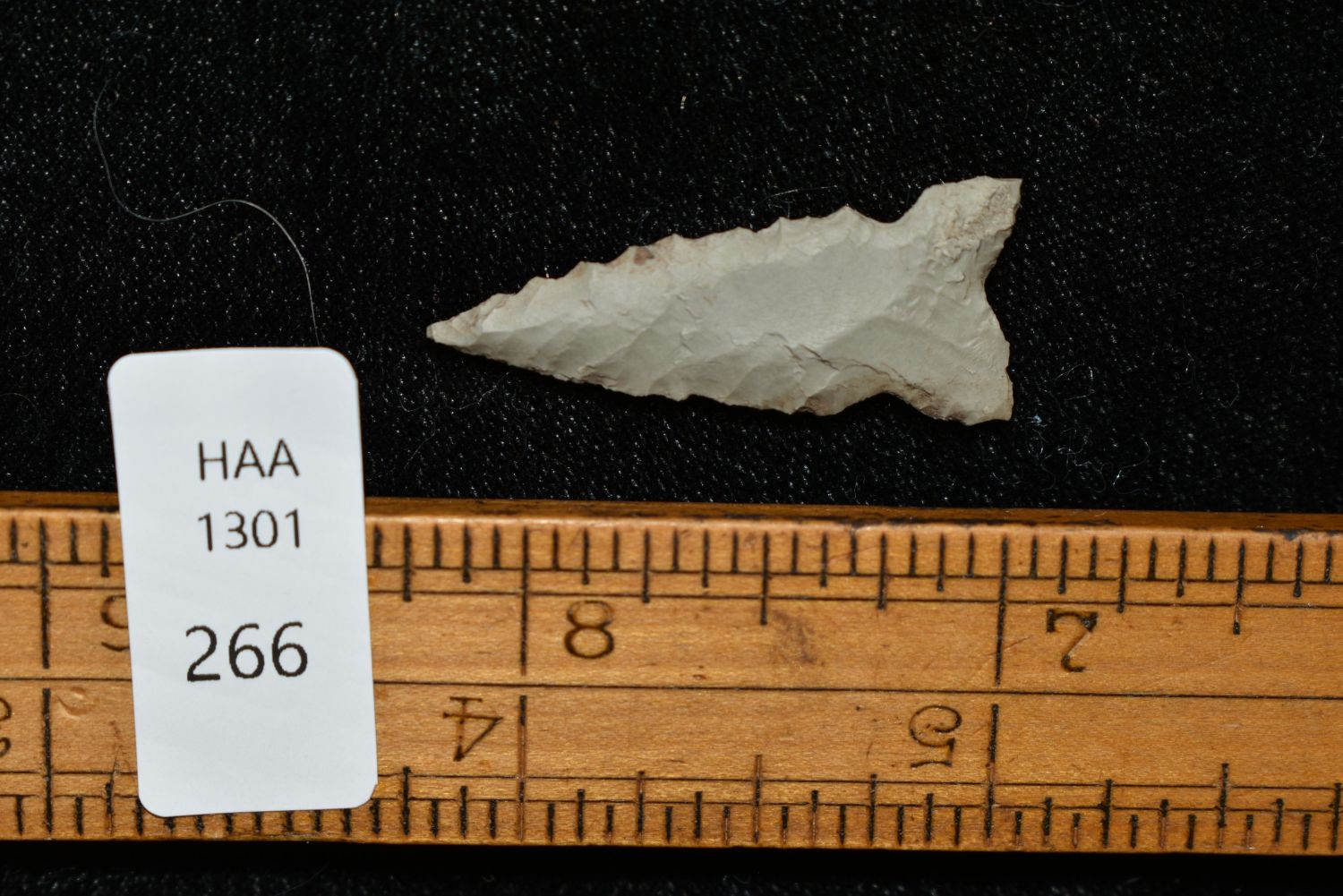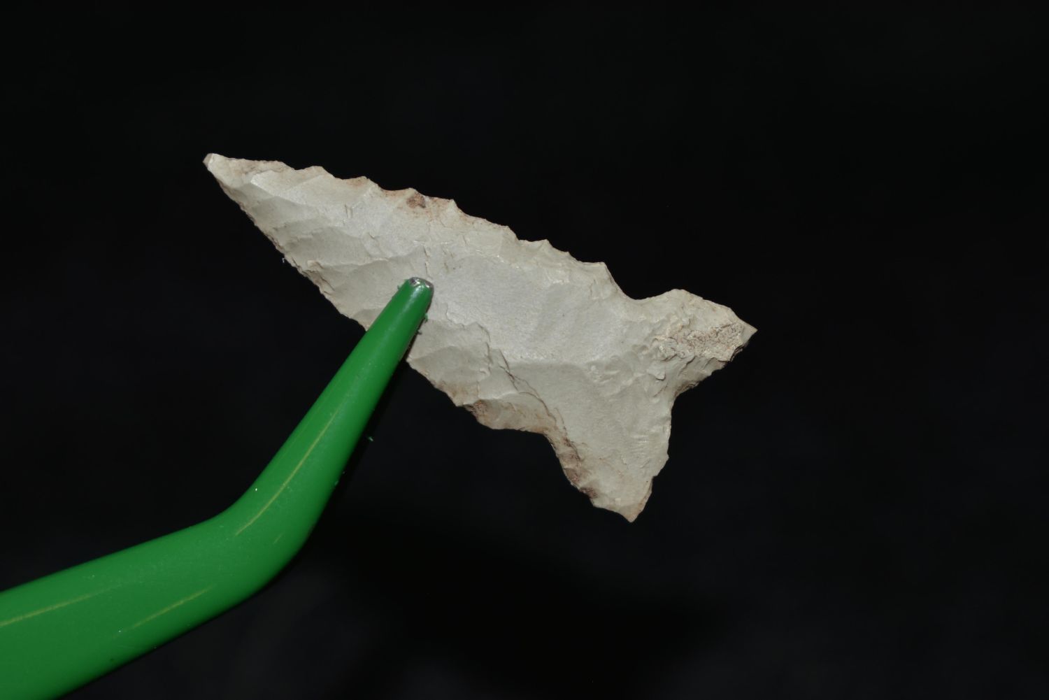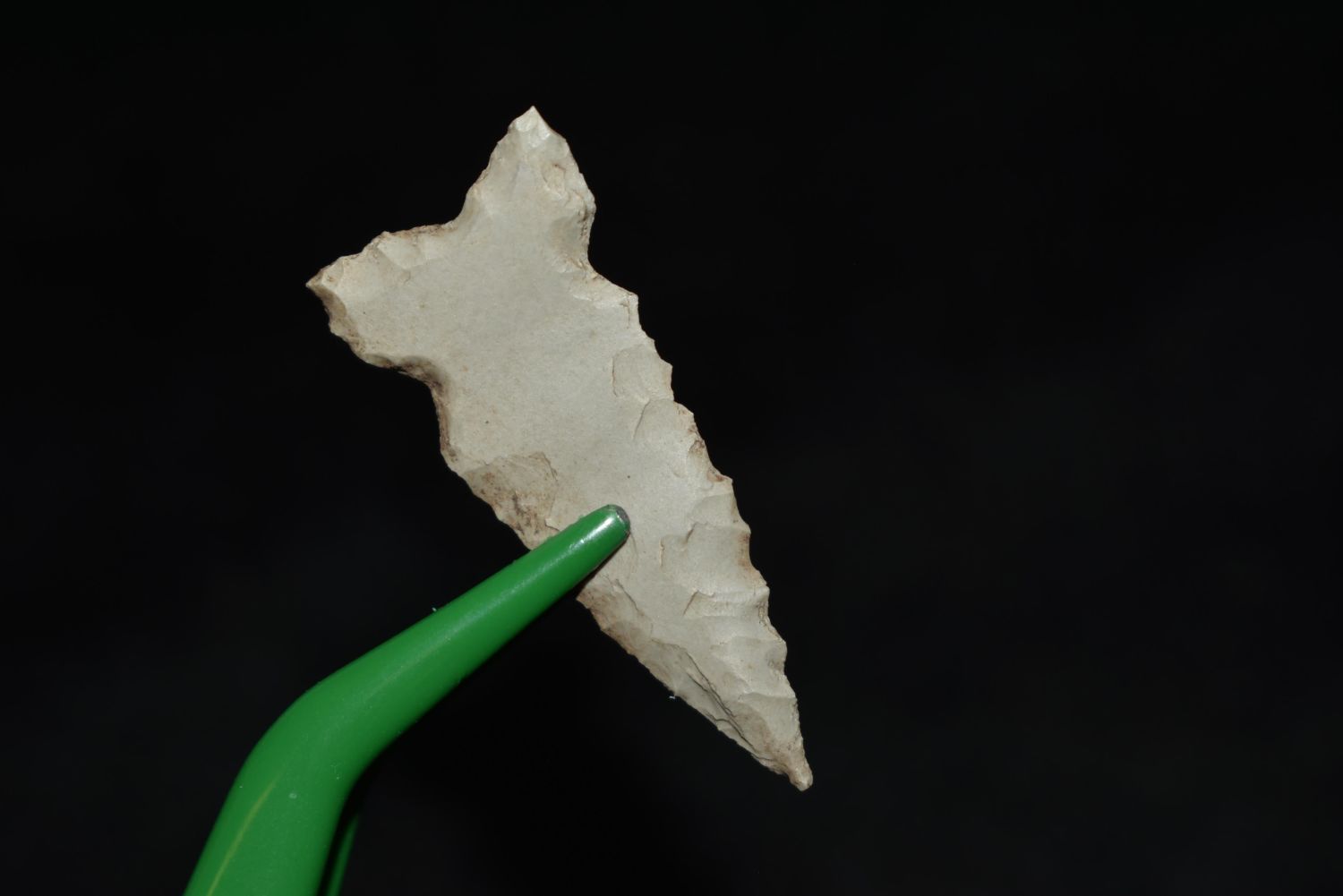 1 1/4" Avonlea point, Found in Musselshell, Montana. Creel Poore was born and raised in Musselshell, Montana where he found his first arrowhead at a very early age. This led Creel on a lifetime search for Montana’s prehistoric past. Creel owned a ranch in Musselshell and collected from sites and in and around the Musselshell River and tributaries. Every piece in Creel’s collection is personally found. He did not purchase pieces, nor did he accept pieces as gifts. He took pride in the fact he found every piece. He also made the cedar frames from cedar trees that were cut on his ranch. Many of the pieces were collected from the buffalo jumps which were plentiful nearby