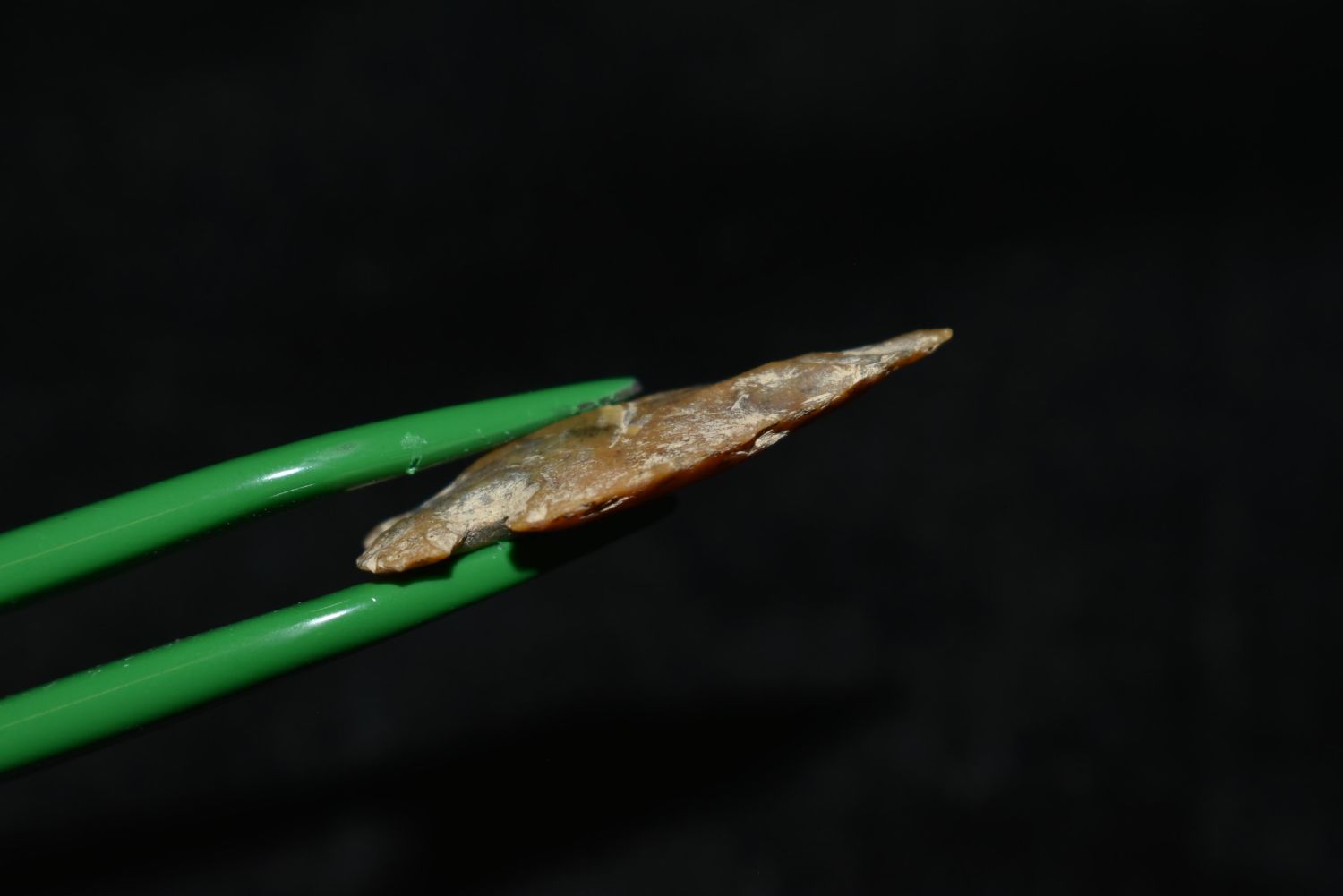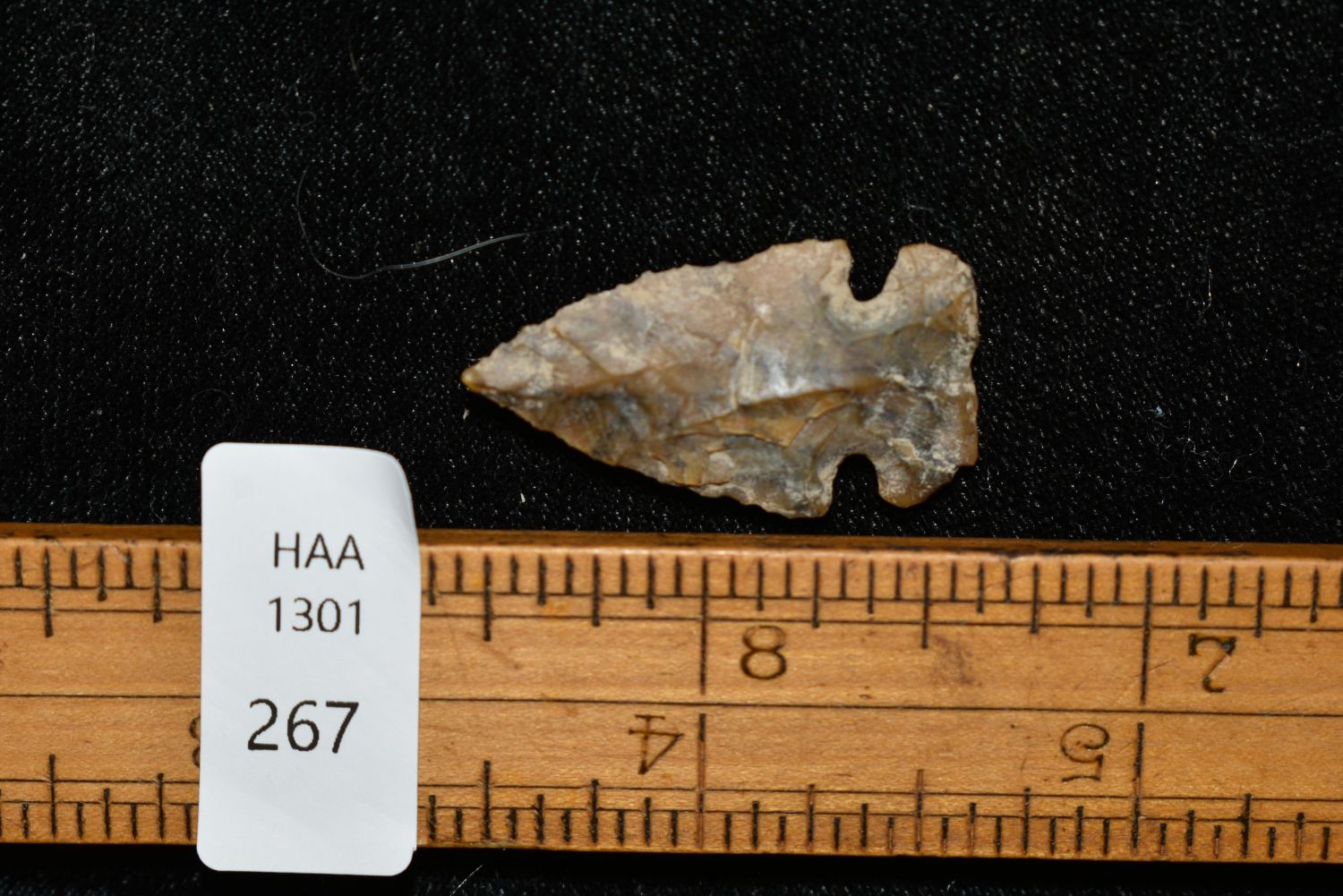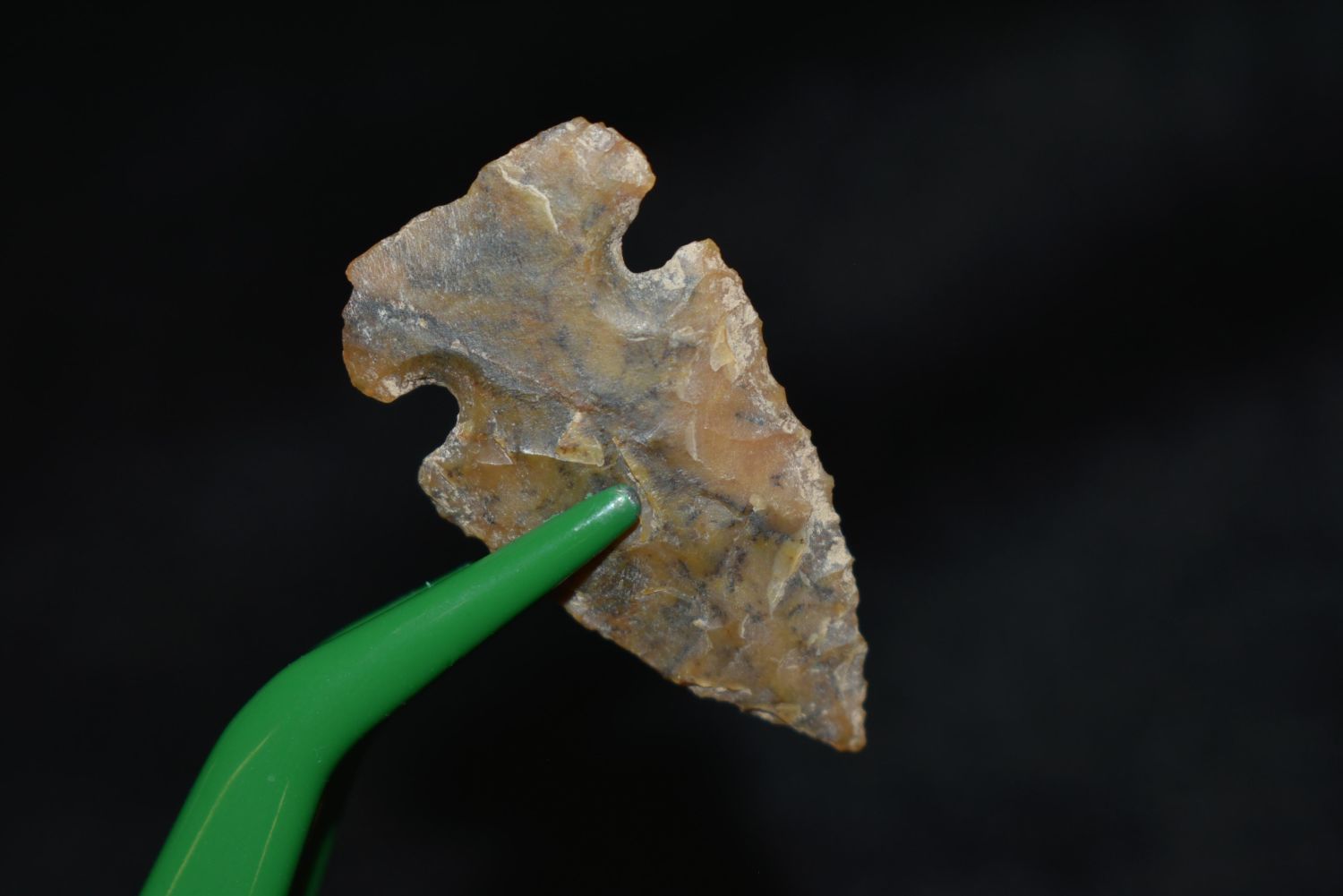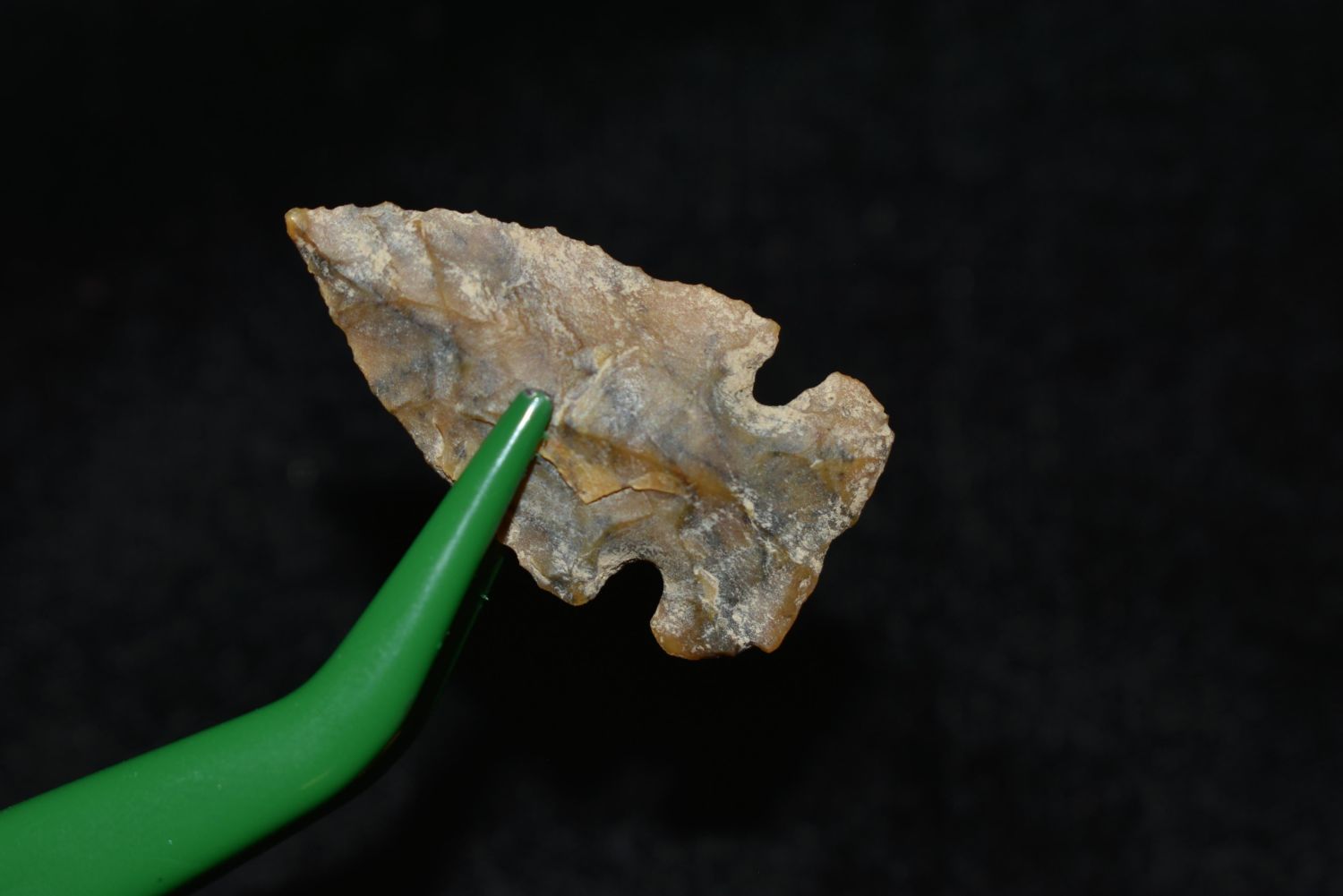 1 1/2" Paskapoo point, Found in Musselshell, Montana. Creel Poore was born and raised in Musselshell, Montana where he found his first arrowhead at a very early age. This led Creel on a lifetime search for Montana’s prehistoric past. Creel owned a ranch in Musselshell and collected from sites and in and around the Musselshell River and tributaries. Every piece in Creel’s collection is personally found. He did not purchase pieces, nor did he accept pieces as gifts. He took pride in the fact he found every piece. He also made the cedar frames from cedar trees that were cut on his ranch. Many of the pieces were collected from the buffalo jumps which were plentiful nearby