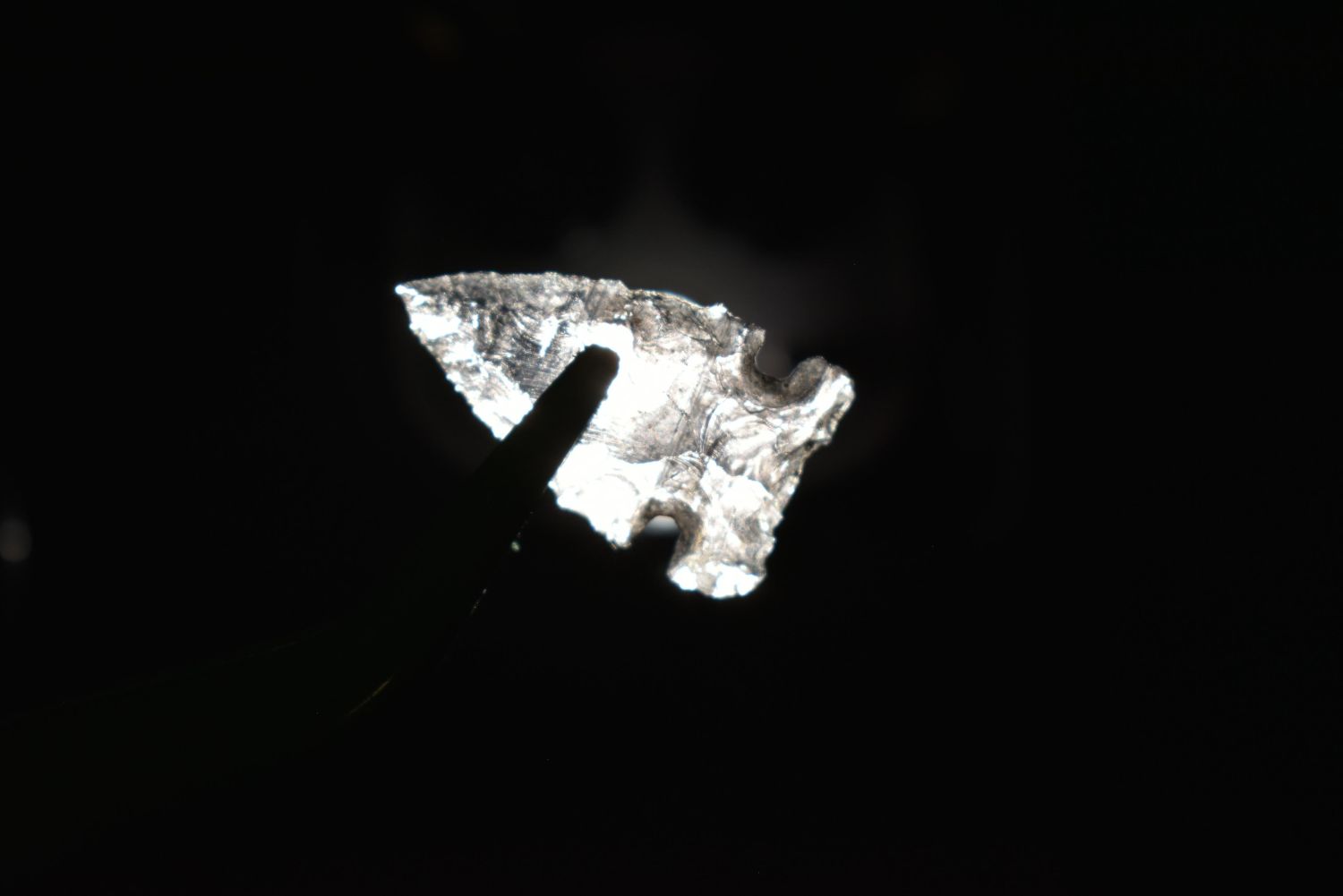 3/4" Prairie side notch, obsidian, Found in Musselshell, Montana. Creel Poore was born and raised in Musselshell, Montana where he found his first arrowhead at a very early age. This led Creel on a lifetime search for Montana’s prehistoric past. Creel