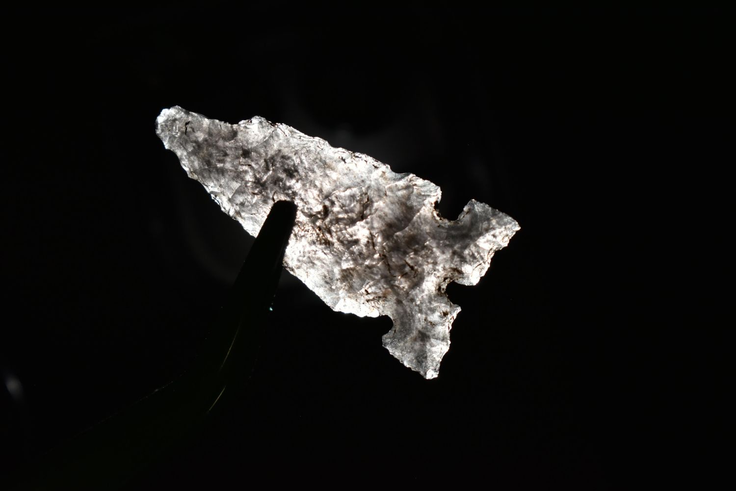 1 1/4" Billings Point, Obsidian, Found in Musselshell, Montana. Creel Poore was born and raised in Musselshell, Montana where he found his first arrowhead at a very early age. This led Creel on a lifetime search for Montana’s prehistoric past. Creel owned a ranch in Musselshell and collected from sites and in and around the Musselshell River and tributaries. Every piece in Creel’s collection is personally found. He did not purchase pieces, nor did he accept pieces as gifts. He took pride in the fact he found every piece. He also made the cedar frames from cedar trees that were cut on his ranch. Many of the pieces were collected from the buffalo jumps which were plentiful nearby
