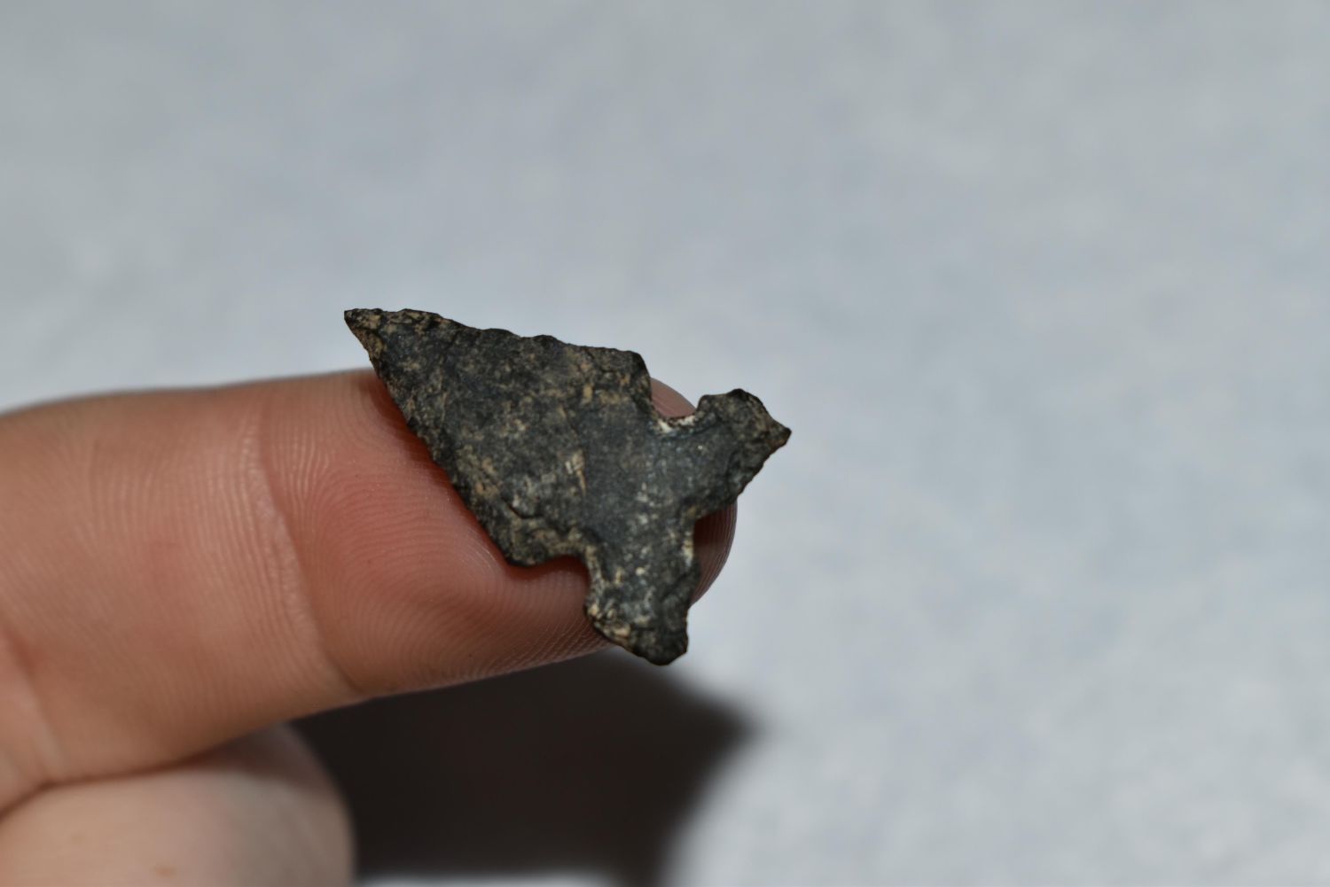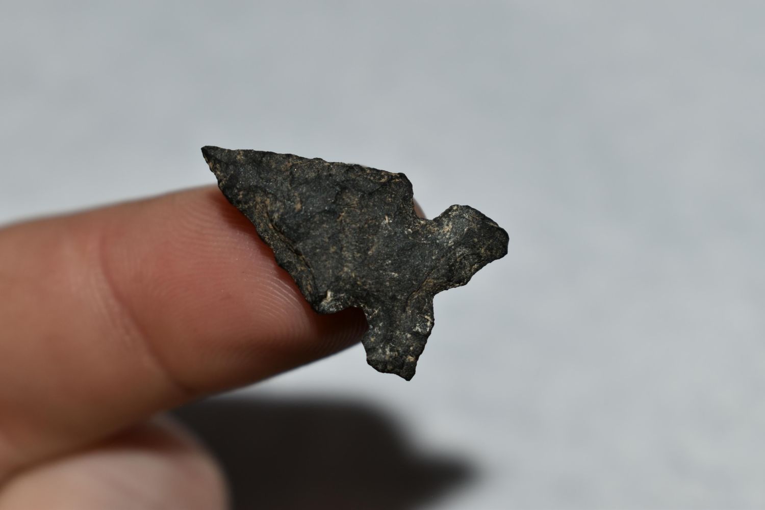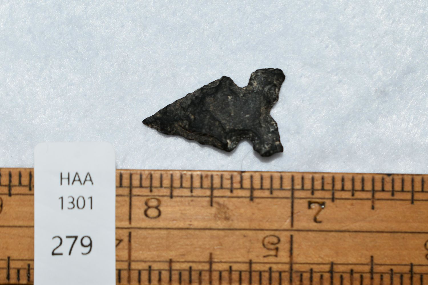 7/8" Billings point, basalt, Found in Musselshell, Montana. Creel Poore was born and raised in Musselshell, Montana where he found his first arrowhead at a very early age. This led Creel on a lifetime search for Montana’s prehistoric past. Creel owned a ranch in Musselshell and collected from sites and in and around the Musselshell River and tributaries. Every piece in Creel’s collection is personally found. He did not purchase pieces, nor did he accept pieces as gifts. He took pride in the fact he found every piece. He also made the cedar frames from cedar trees that were cut on his ranch. Many of the pieces were collected from the buffalo jumps which were plentiful nearby