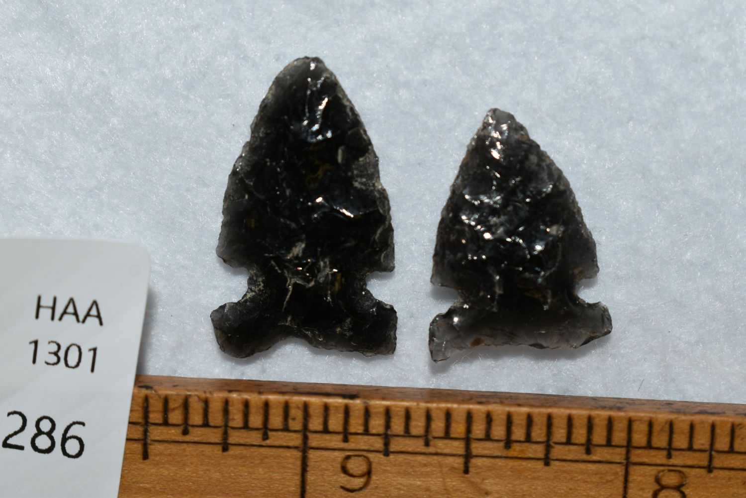Lot of 2 Prairie Side Notch Points, Obsidian, Found in Musselshell, Montana. Creel Poore was born and raised in Musselshell, Montana where he found his first arrowhead at a very early age. This led Creel on a lifetime search for Montana’s prehistoric past. Creel owned a ranch in Musselshell and collected from sites and in and around the Musselshell River and tributaries. Every piece in Creel’s collection is personally found. He did not purchase pieces, nor did he accept pieces as gifts. He took pride in the fact he found every piece. He also made the cedar frames from cedar trees that were cut on his ranch. Many of the pieces were collected from the buffalo jumps which were plentiful nearby
