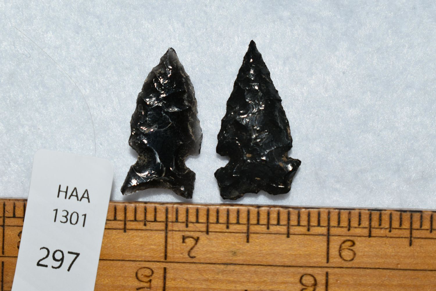 Lot of 2 Plain Side Notch Points, Obsidian, Found in Musselshell, Montana. Creel Poore was born and raised in Musselshell, Montana where he found his first arrowhead at a very early age. This led Creel on a lifetime search for Montana’s prehistoric past. Creel owned a ranch in Musselshell and collected from sites and in and around the Musselshell River and tributaries. Every piece in Creel’s collection is personally found. He did not purchase pieces, nor did he accept pieces as gifts. He took pride in the fact he found every piece. He also made the cedar frames from cedar trees that were cut on his ranch. Many of the pieces were collected from the buffalo jumps which were plentiful nearby