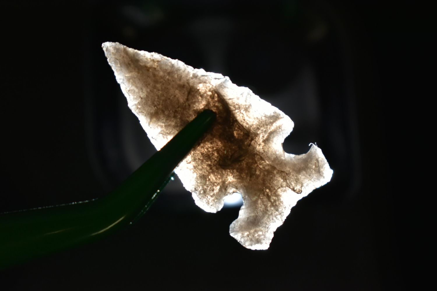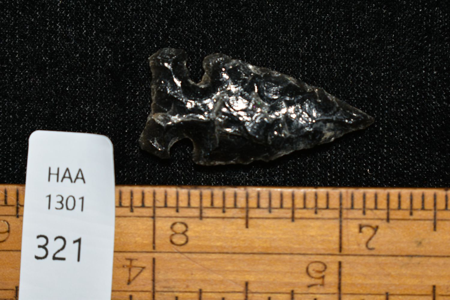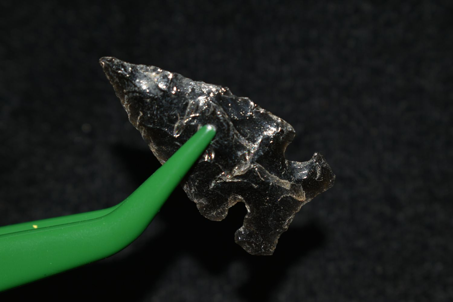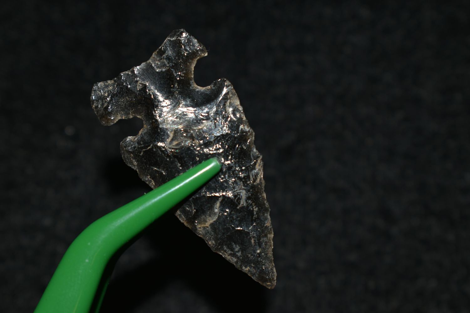 1 1/4" Prairie Side Notch, Obsidian, Found in Musselshell, Montana. Creel Poore was born and raised in Musselshell, Montana where he found his first arrowhead at a very early age. This led Creel on a lifetime search for Montana’s prehistoric past. Creel owned a ranch in Musselshell and collected from sites and in and around the Musselshell River and tributaries. Every piece in Creel’s collection is personally found. He did not purchase pieces, nor did he accept pieces as gifts. He took pride in the fact he found every piece. He also made the cedar frames from cedar trees that were cut on his ranch. Many of the pieces were collected from the buffalo jumps which were plentiful nearby