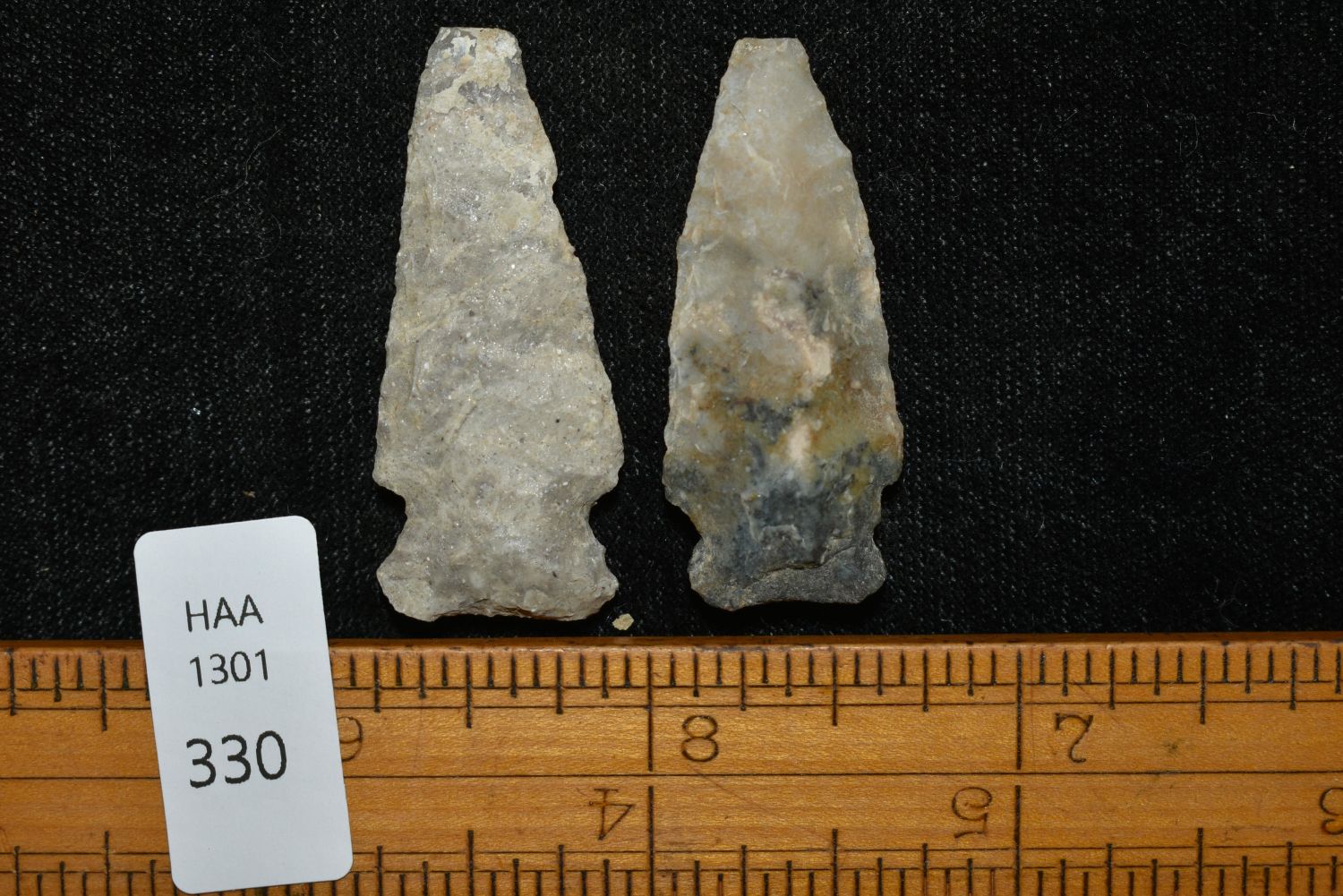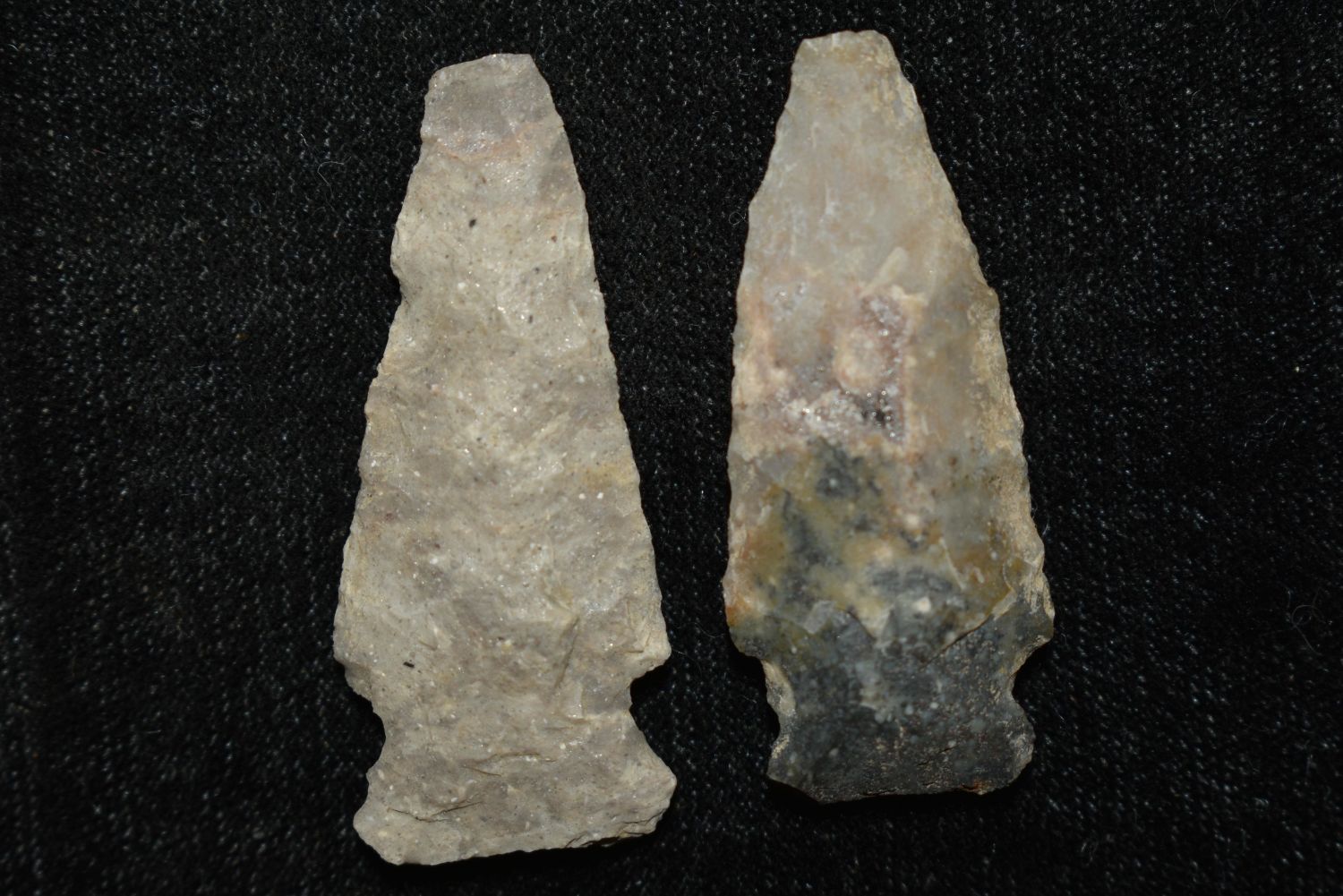 Lot of 2 Besant Points, Found in Musselshell, Montana. Creel Poore was born and raised in Musselshell, Montana where he found his first arrowhead at a very early age. This led Creel on a lifetime search for Montana’s prehistoric past. Creel owned a ranch in Musselshell and collected from sites and in and around the Musselshell River and tributaries. Every piece in Creel’s collection is personally found. He did not purchase pieces, nor did he accept pieces as gifts. He took pride in the fact he found every piece. He also made the cedar frames from cedar trees that were cut on his ranch. Many of the pieces were collected from the buffalo jumps which were plentiful nearby