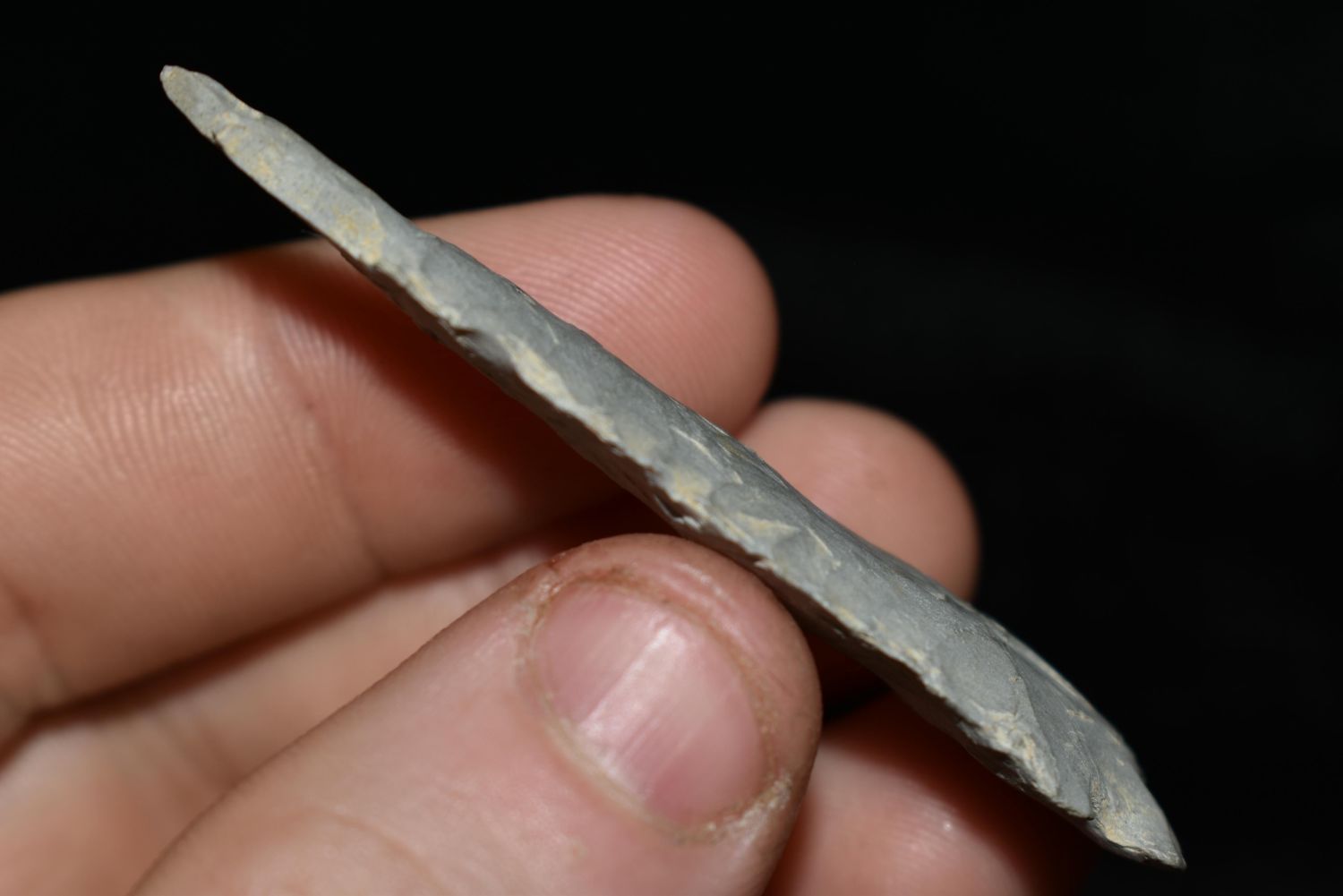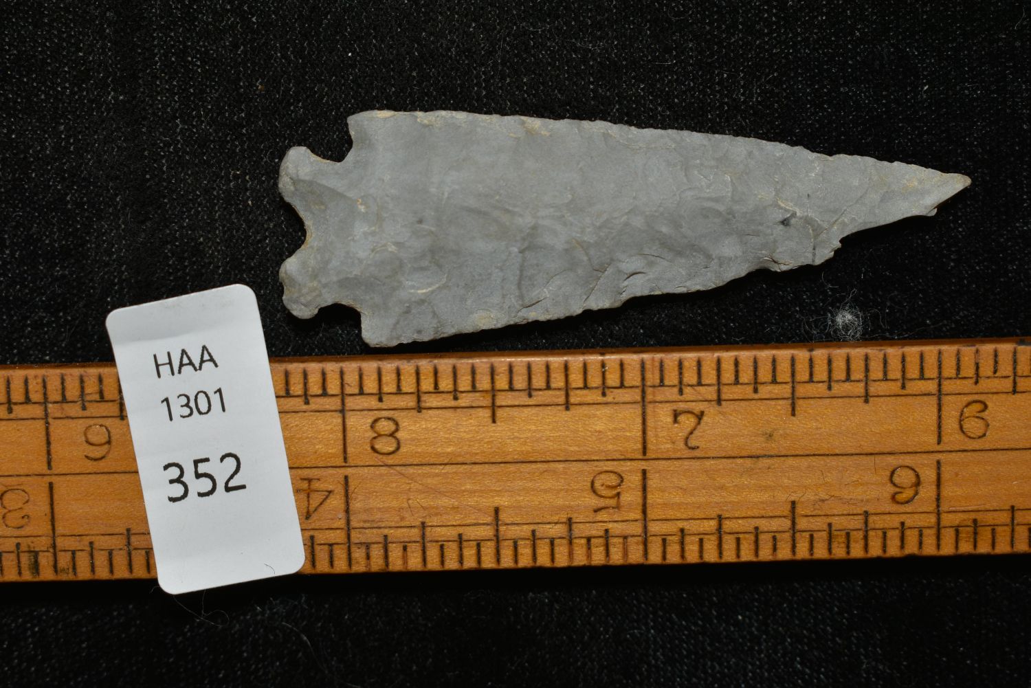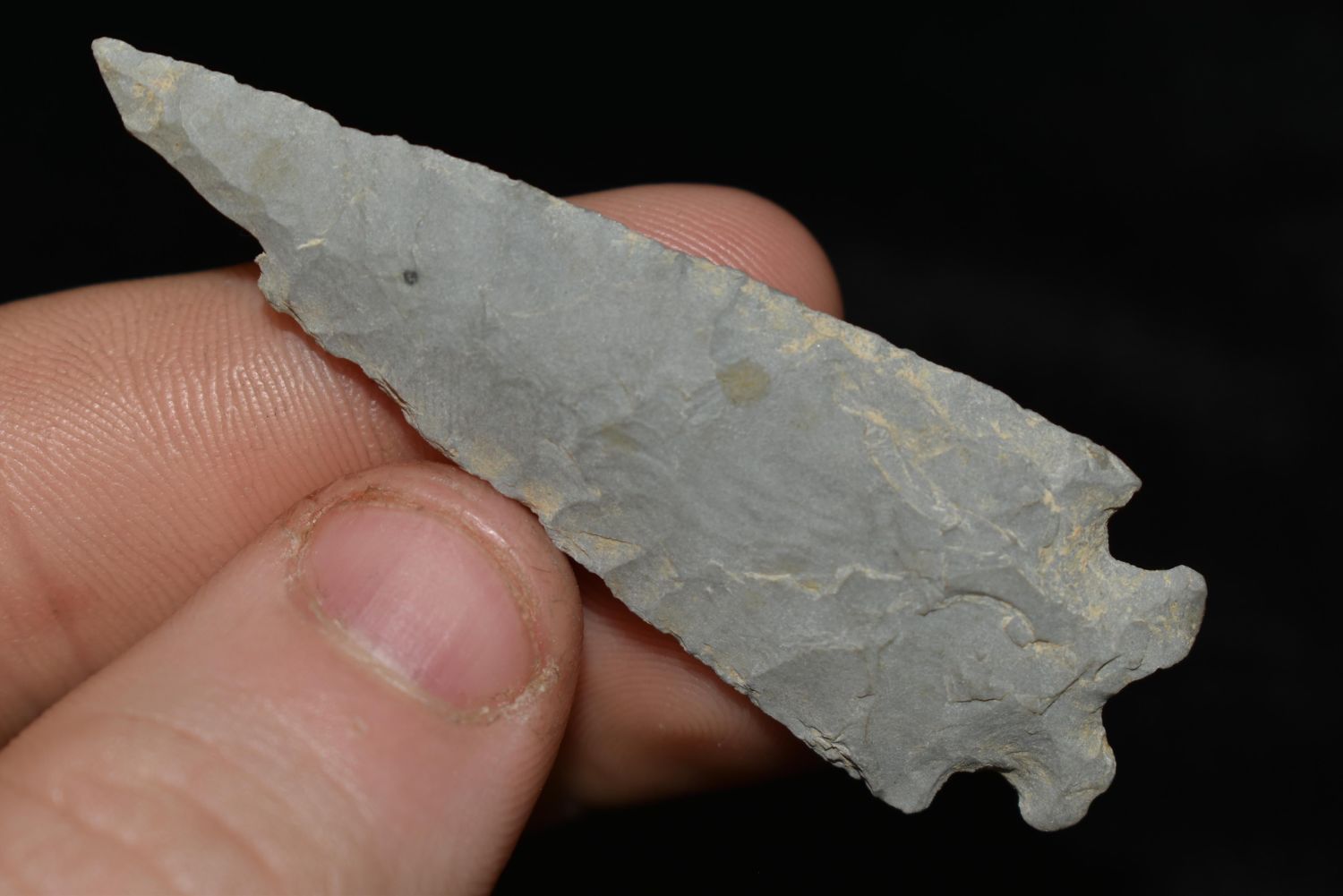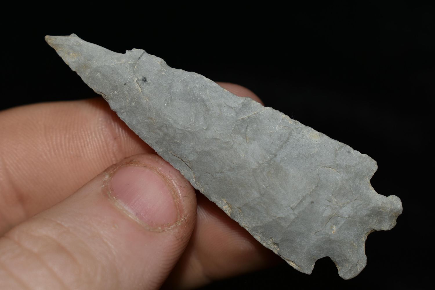 2 3/8" Emigrant Point, Found in Musselshell, Montana. Creel Poore was born and raised in Musselshell, Montana where he found his first arrowhead at a very early age. This led Creel on a lifetime search for Montana’s prehistoric past. Creel owned a ranch in Musselshell and collected from sites and in and around the Musselshell River and tributaries. Every piece in Creel’s collection is personally found. He did not purchase pieces, nor did he accept pieces as gifts. He took pride in the fact he found every piece. He also made the cedar frames from cedar trees that were cut on his ranch. Many of the pieces were collected from the buffalo jumps which were plentiful nearby