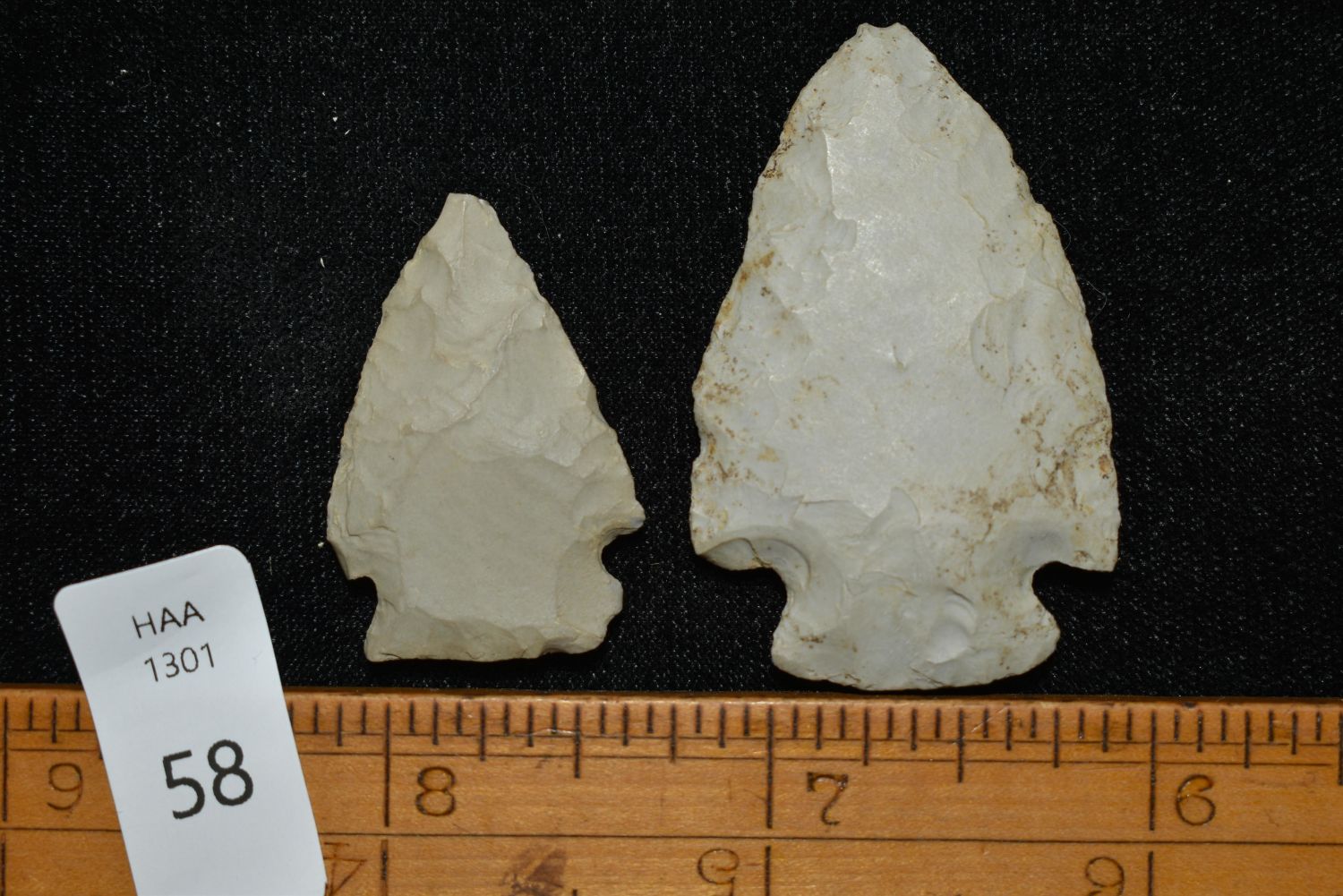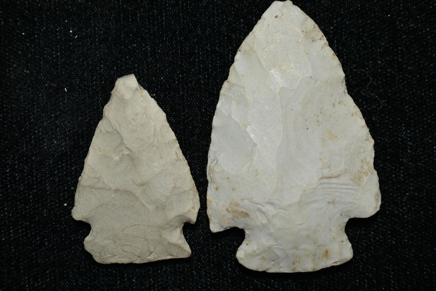 Lot of 2 Besant points, Largest is 1 3/4" Found in Musselshell, Montana. Creel Poore was born and raised in Musselshell, Montana where he found his first arrowhead at a very early age. This led Creel on a lifetime search for Montana’s prehistoric past. Creel owned a ranch in Musselshell and collected from sites and in and around the Musselshell River and tributaries. Every piece in Creel’s collection is personally found. He did not purchase pieces, nor did he accept pieces as gifts. He took pride in the fact he found every piece. He also made the cedar frames from cedar trees that were cut on his ranch. Many of the pieces were collected from the buffalo jumps which were plentiful nearby