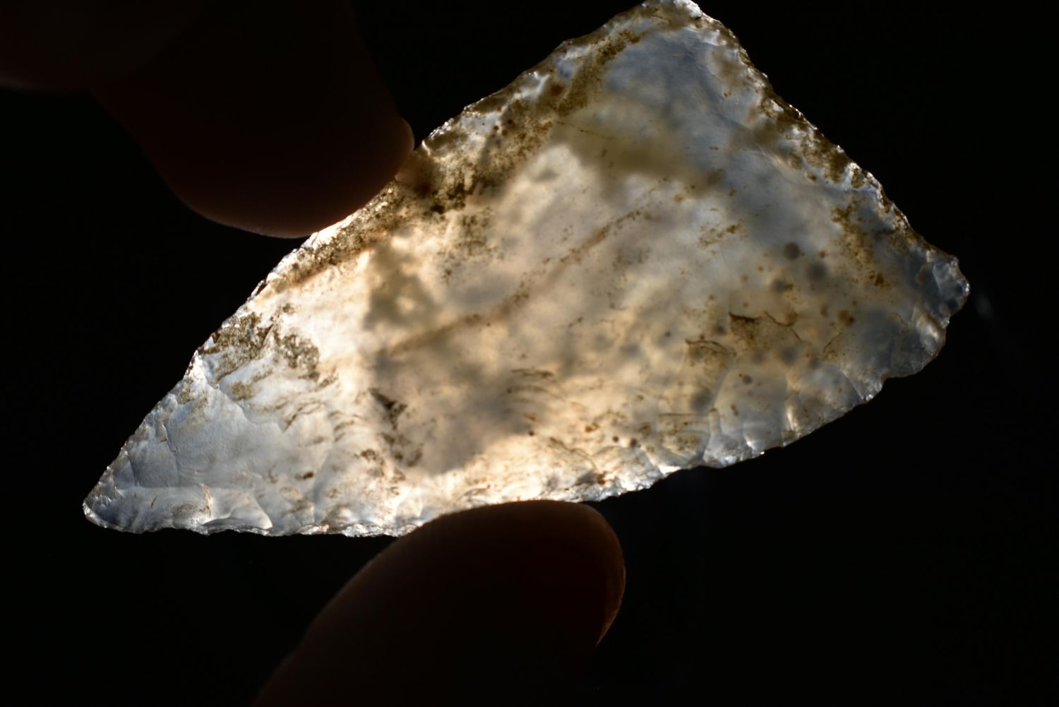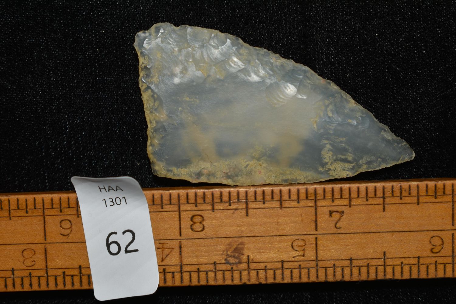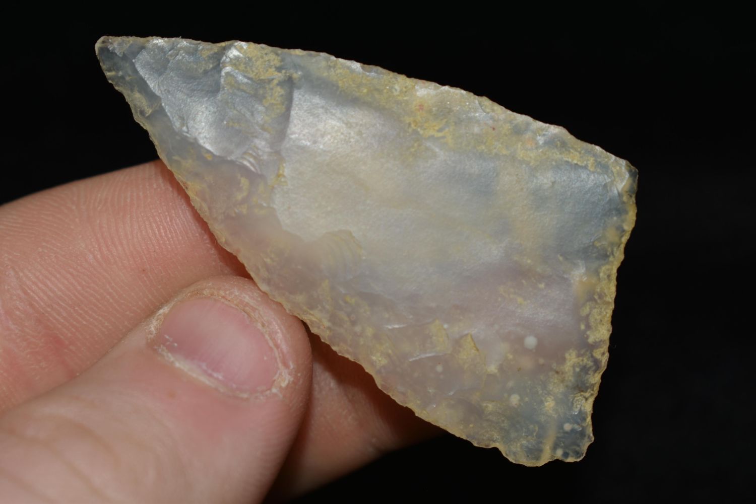2 1/8" Chalcedony Found in Musselshell, Montana. Creel Poore was born and raised in Musselshell, Montana where he found his first arrowhead at a very early age. This led Creel on a lifetime search for Montana’s prehistoric past. Creel owned a ranch in Musselshell and collected from sites and in and around the Musselshell River and tributaries. Every piece in Creel’s collection is personally found. He did not purchase pieces, nor did he accept pieces as gifts. He took pride in the fact he found every piece. He also made the cedar frames from cedar trees that were cut on his ranch. Many of the pieces were collected from the buffalo jumps which were plentiful nearby