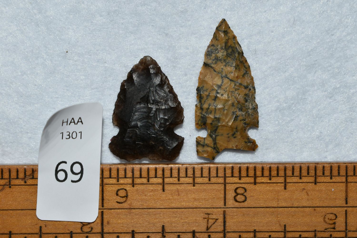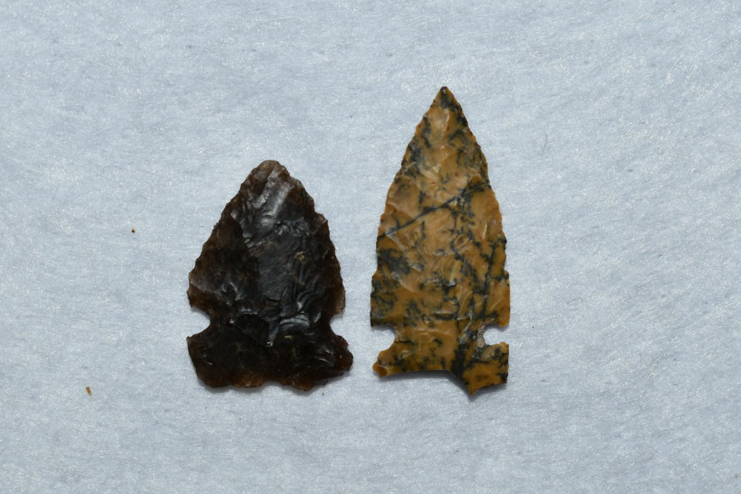 Lot of 2 Avonlea points – made out of agate Found in Musselshell, Montana. Creel Poore was born and raised in Musselshell, Montana where he found his first arrowhead at a very early age. This led Creel on a lifetime search for Montana’s prehistoric past. Creel owned a ranch in Musselshell and collected from sites and in and around the Musselshell River and tributaries. Every piece in Creel’s collection is personally found. He did not purchase pieces, nor did he accept pieces as gifts. He took pride in the fact he found every piece. He also made the cedar frames from cedar trees that were cut on his ranch. Many of the pieces were collected from the buffalo jumps which were plentiful nearby