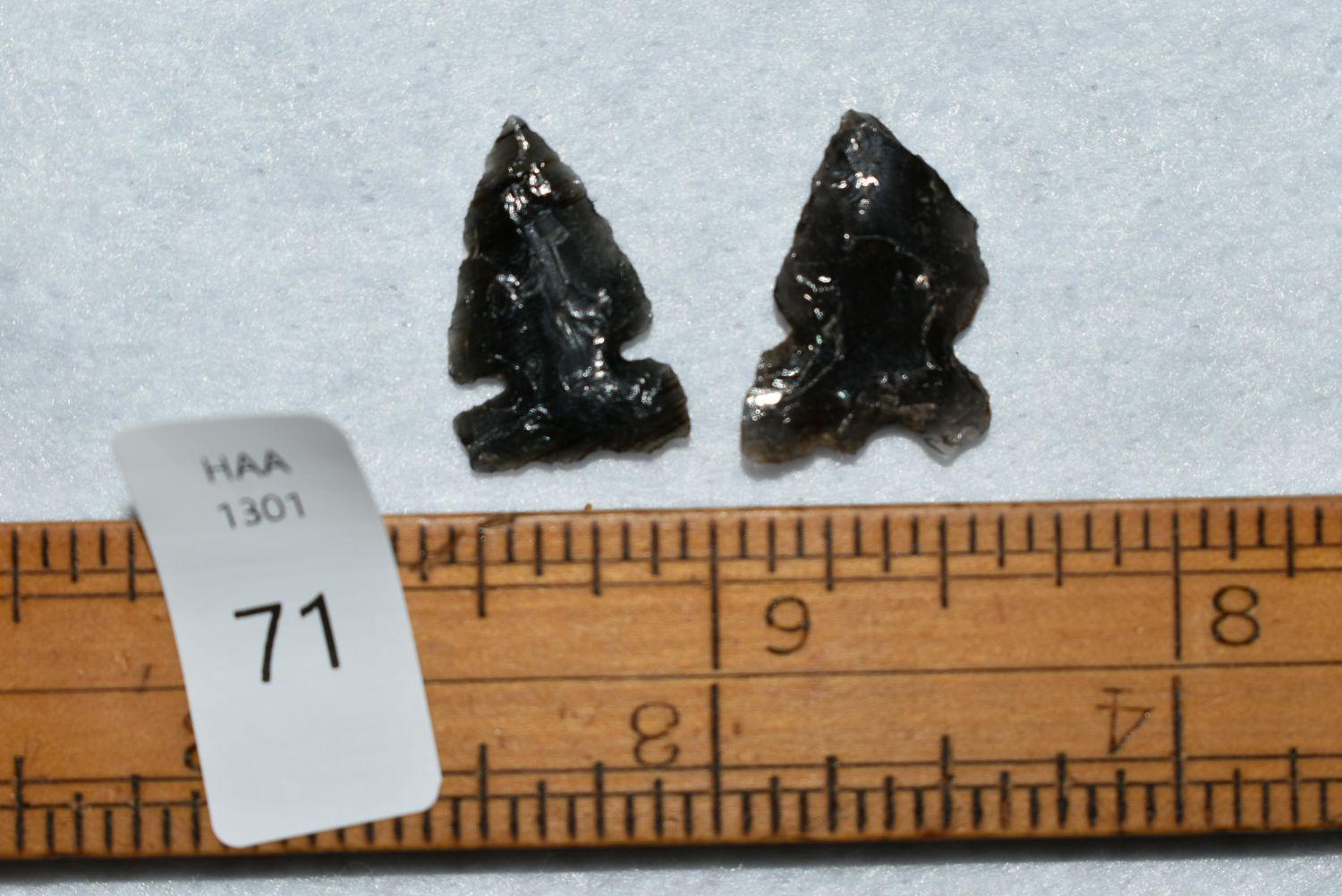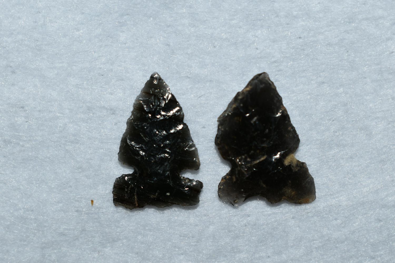 Lot of 2 Nothern points, made out of obsidian, largest is 7/8" Found in Musselshell, Montana. Creel Poore was born and raised in Musselshell, Montana where he found his first arrowhead at a very early age. This led Creel on a lifetime search for Montana’s prehistoric past. Creel owned a ranch in Musselshell and collected from sites and in and around the Musselshell River and tributaries. Every piece in Creel’s collection is personally found. He did not purchase pieces, nor did he accept pieces as gifts. He took pride in the fact he found every piece. He also made the cedar frames from cedar trees that were cut on his ranch. Many of the pieces were collected from the buffalo jumps which were plentiful nearby