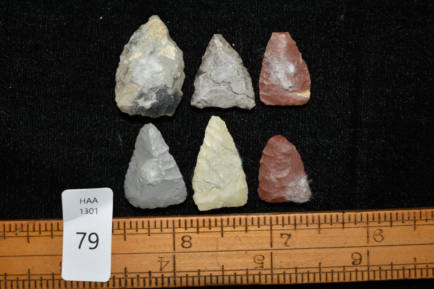 Lot of 6 Triangular Bird points Found in Musselshell, Montana. Creel Poore was born and raised in Musselshell, Montana where he found his first arrowhead at a very early age. This led Creel on a lifetime search for Montana’s prehistoric past. Creel owned a ranch in Musselshell and collected from sites and in and around the Musselshell River and tributaries. Every piece in Creel’s collection is personally found. He did not purchase pieces, nor did he accept pieces as gifts. He took pride in the fact he found every piece. He also made the cedar frames from cedar trees that were cut on his ranch. Many of the pieces were collected from the buffalo jumps which were plentiful nearby