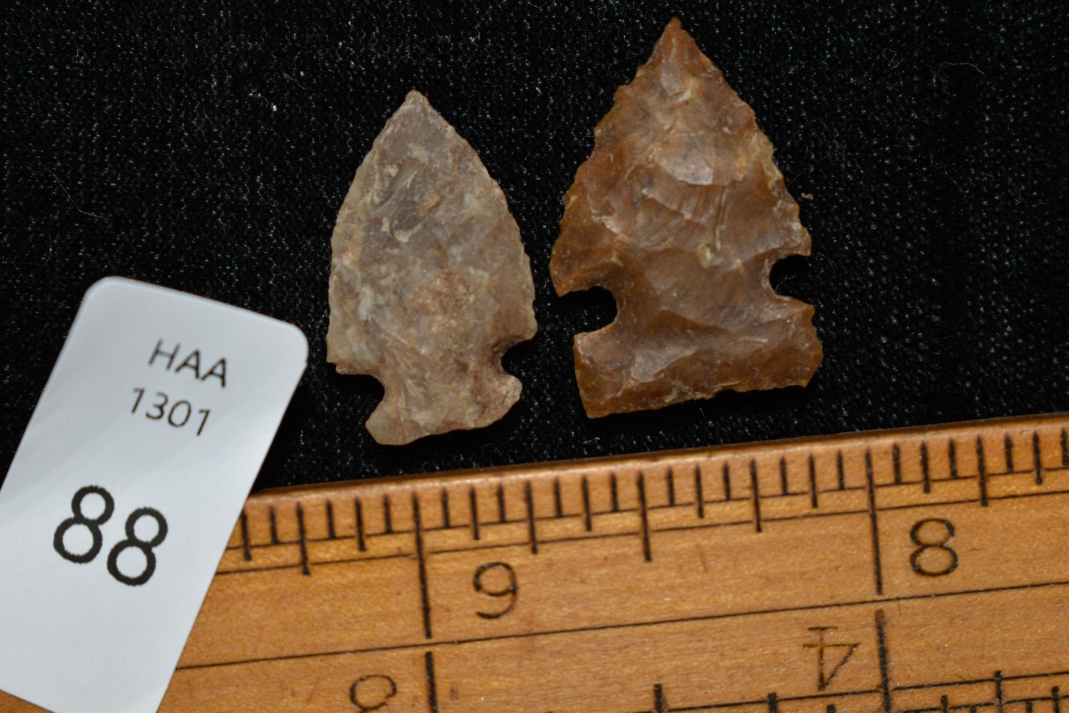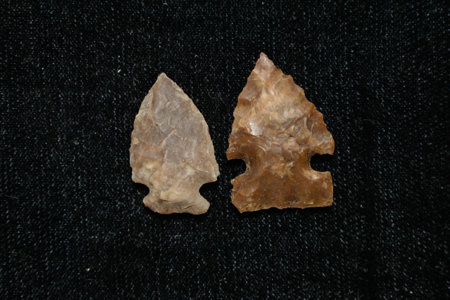 Lot of 2 Nothern Points – made of agate, Largest is 1" Found in Musselshell, Montana. Creel Poore was born and raised in Musselshell, Montana where he found his first arrowhead at a very early age. This led Creel on a lifetime search for Montana’s prehistoric past. Creel owned a ranch in Musselshell and collected from sites and in and around the Musselshell River and tributaries. Every piece in Creel’s collection is personally found. He did not purchase pieces, nor did he accept pieces as gifts. He took pride in the fact he found every piece. He also made the cedar frames from cedar trees that were cut on his ranch. Many of the pieces were collected from the buffalo jumps which were plentiful nearby
