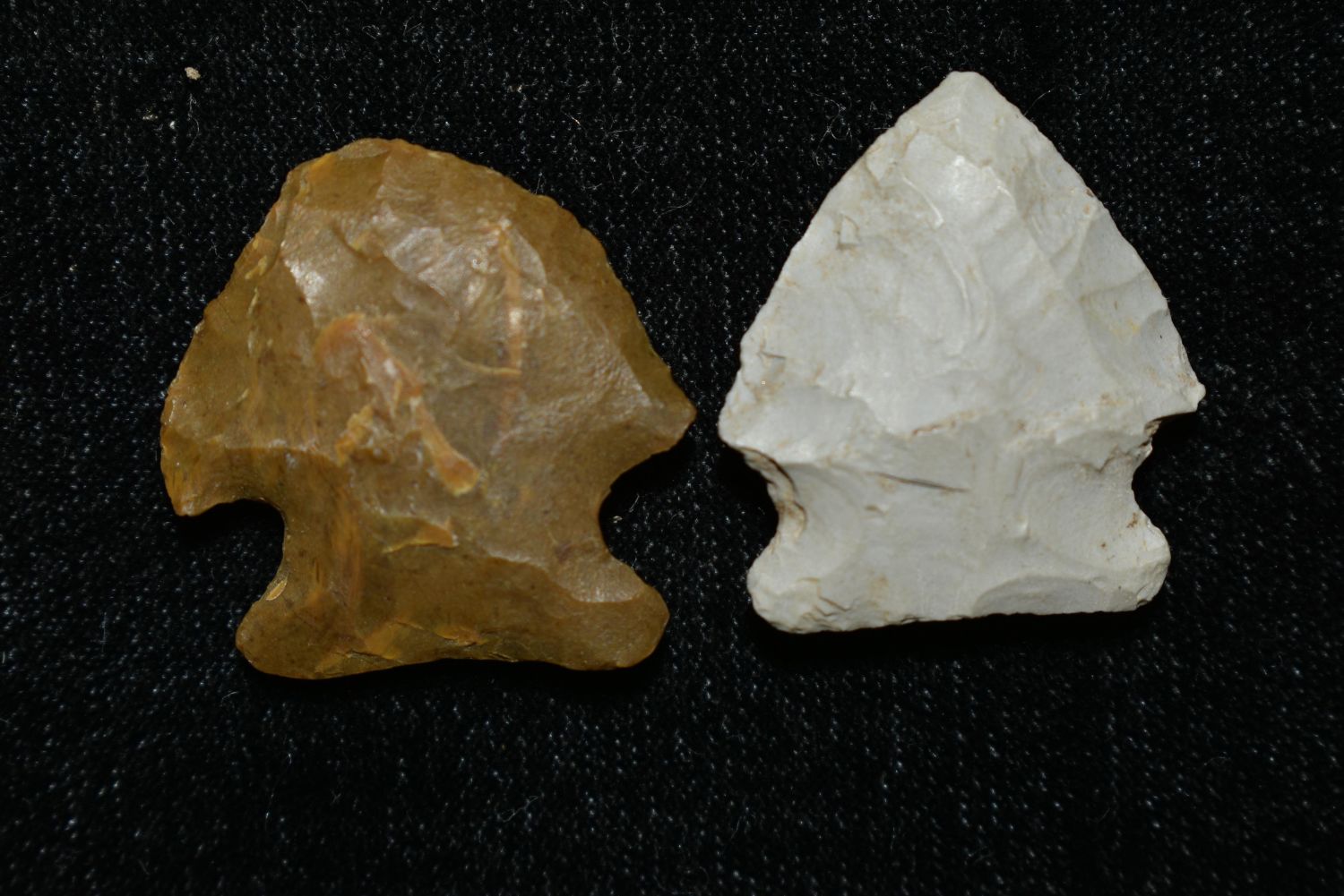Lot of 2 Besant points, Largest is 1" Found in Musselshell, Montana. Creel Poore was born and raised in Musselshell, Montana where he found his first arrowhead at a very early age. This led Creel on a lifetime search for Montana’s prehistoric past. Creel owned a ranch in Musselshell and collected from sites and in and around the Musselshell River and tributaries. Every piece in Creel’s collection is personally found. He did not purchase pieces, nor did he accept pieces as gifts. He took pride in the fact he found every piece. He also made the cedar frames from cedar trees that were cut on his ranch. Many of the pieces were collected from the buffalo jumps which were plentiful nearby