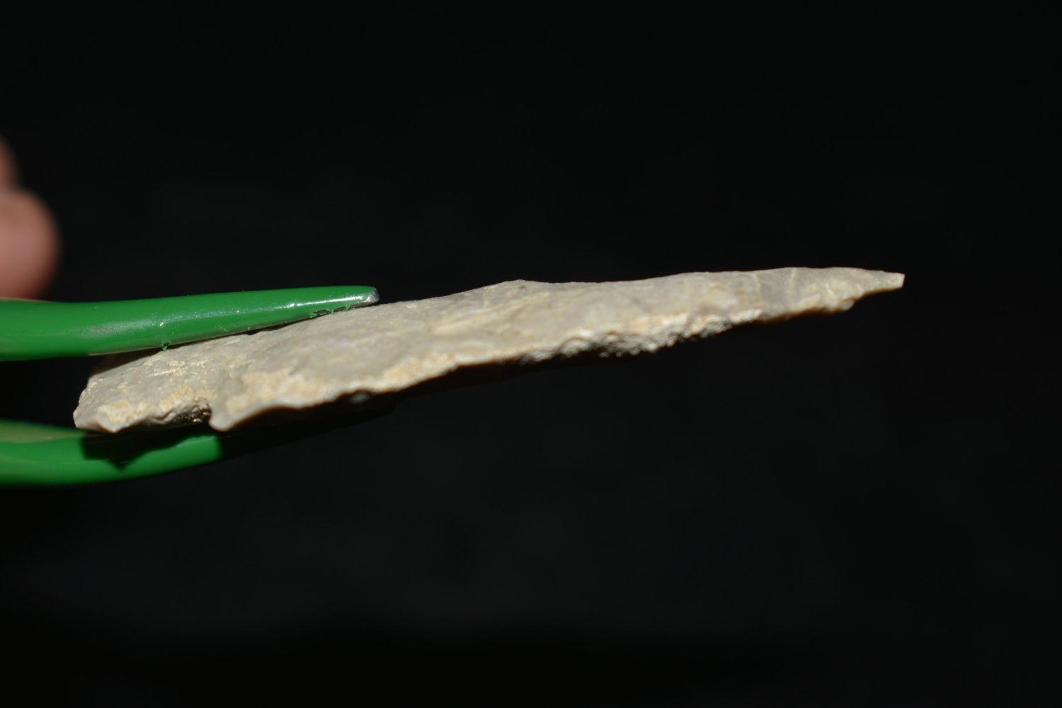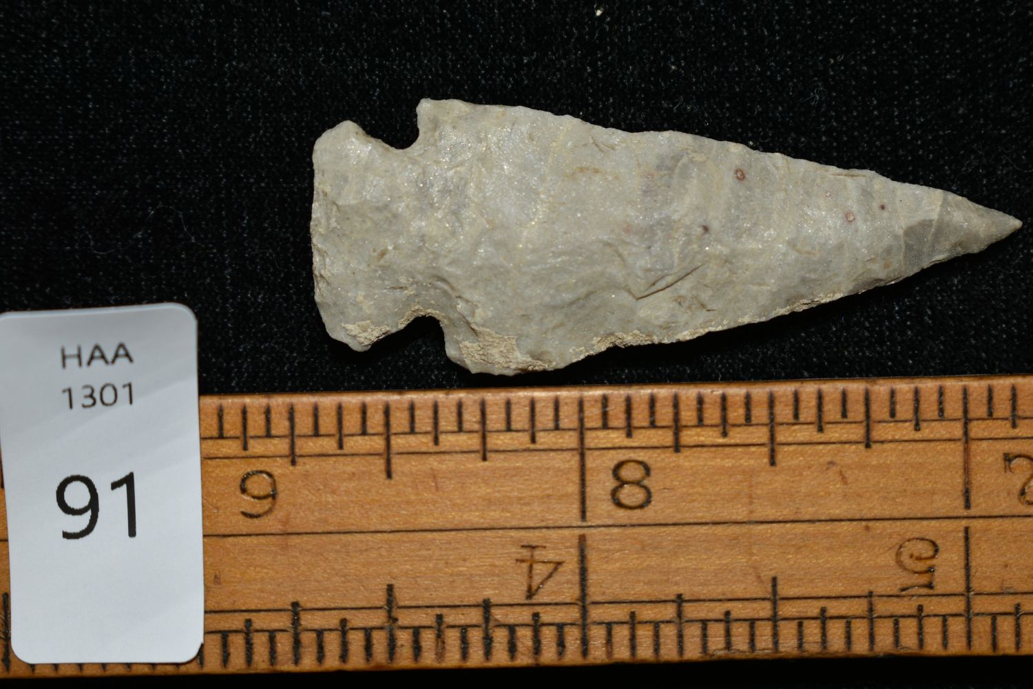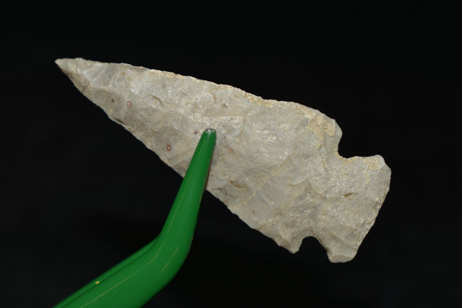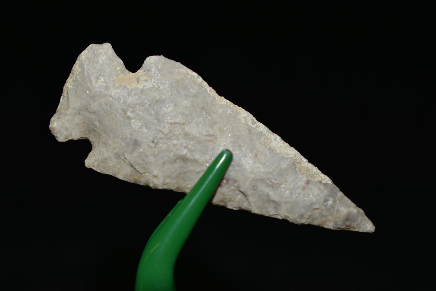 1 7/8" Besant point Found in Musselshell, Montana. Creel Poore was born and raised in Musselshell, Montana where he found his first arrowhead at a very early age. This led Creel on a lifetime search for Montana’s prehistoric past. Creel owned a ranch in Musselshell and collected from sites and in and around the Musselshell River and tributaries. Every piece in Creel’s collection is personally found. He did not purchase pieces, nor did he accept pieces as gifts. He took pride in the fact he found every piece. He also made the cedar frames from cedar trees that were cut on his ranch. Many of the pieces were collected from the buffalo jumps which were plentiful nearby