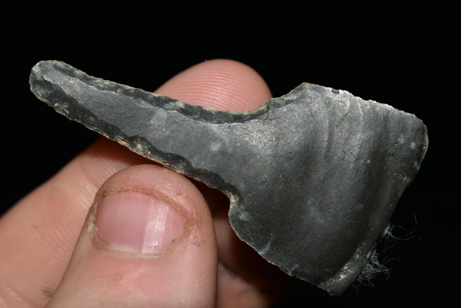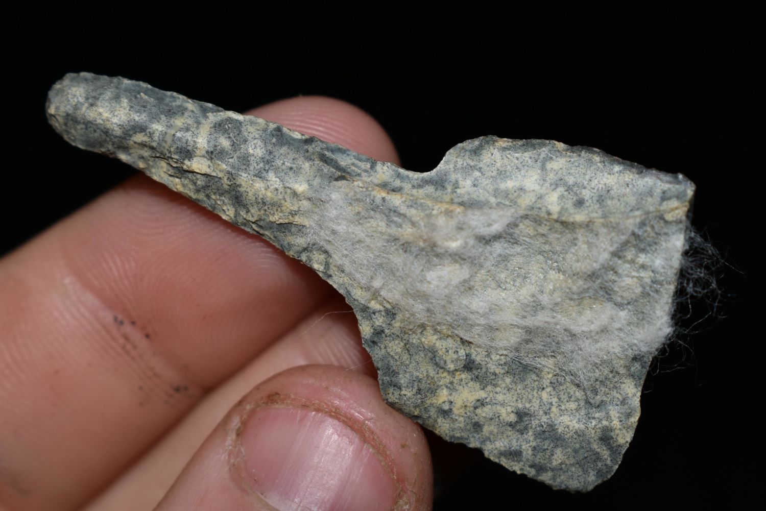 1 7/8" Drill, made of agate, great patination Found in Musselshell, Montana. Creel Poore was born and raised in Musselshell, Montana where he found his first arrowhead at a very early age. This led Creel on a lifetime search for Montana’s prehistoric past. Creel owned a ranch in Musselshell and collected from sites and in and around the Musselshell River and tributaries. Every piece in Creel’s collection is personally found. He did not purchase pieces, nor did he accept pieces as gifts. He took pride in the fact he found every piece. He also made the cedar frames from cedar trees that were cut on his ranch. Many of the pieces were collected from the buffalo jumps which were plentiful nearby