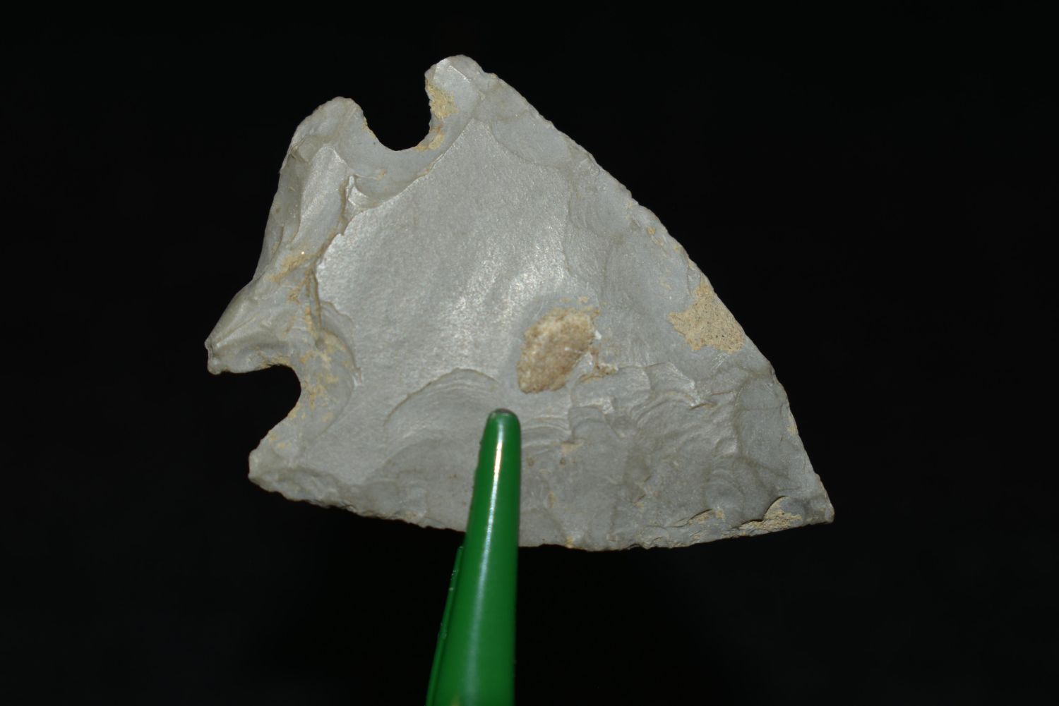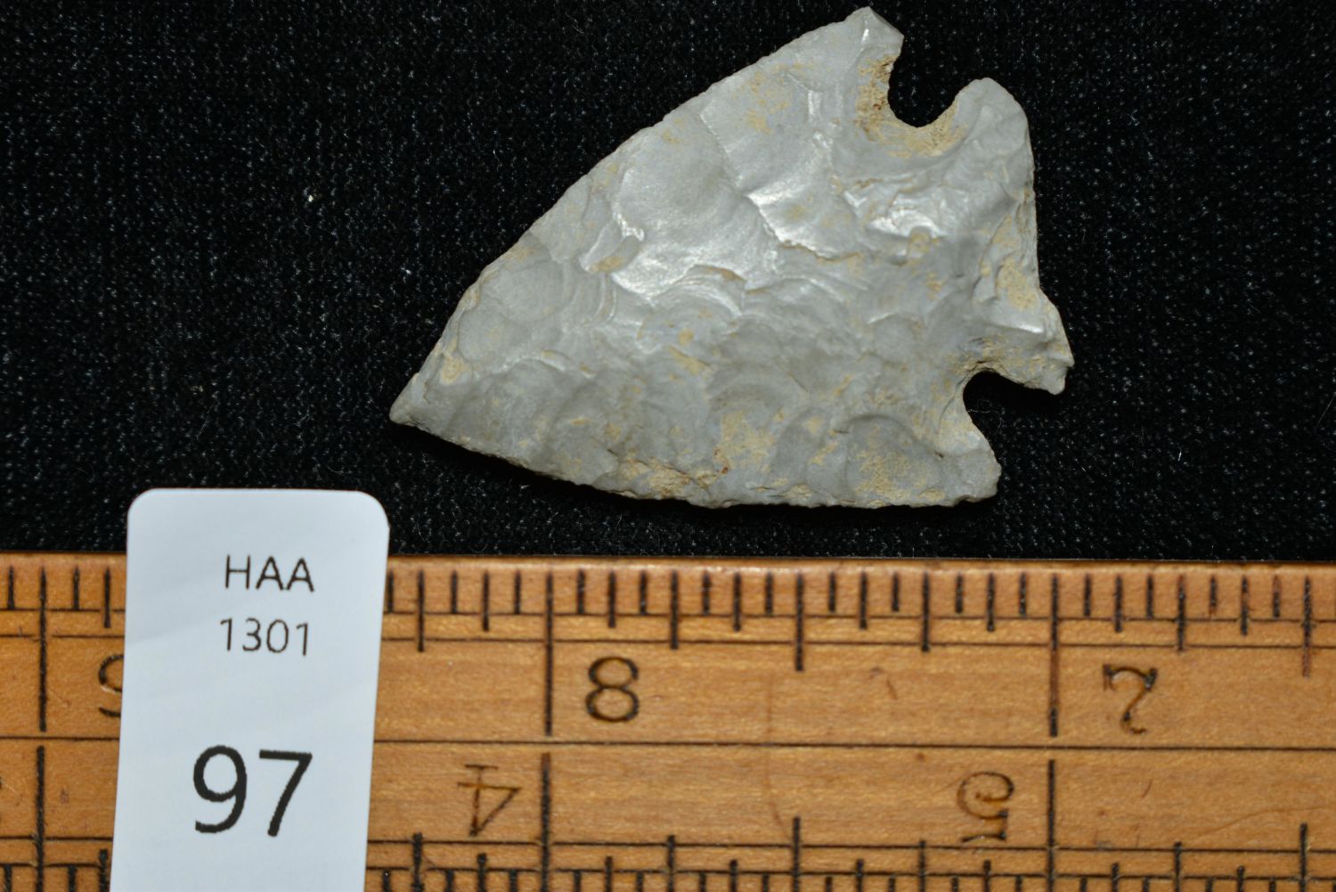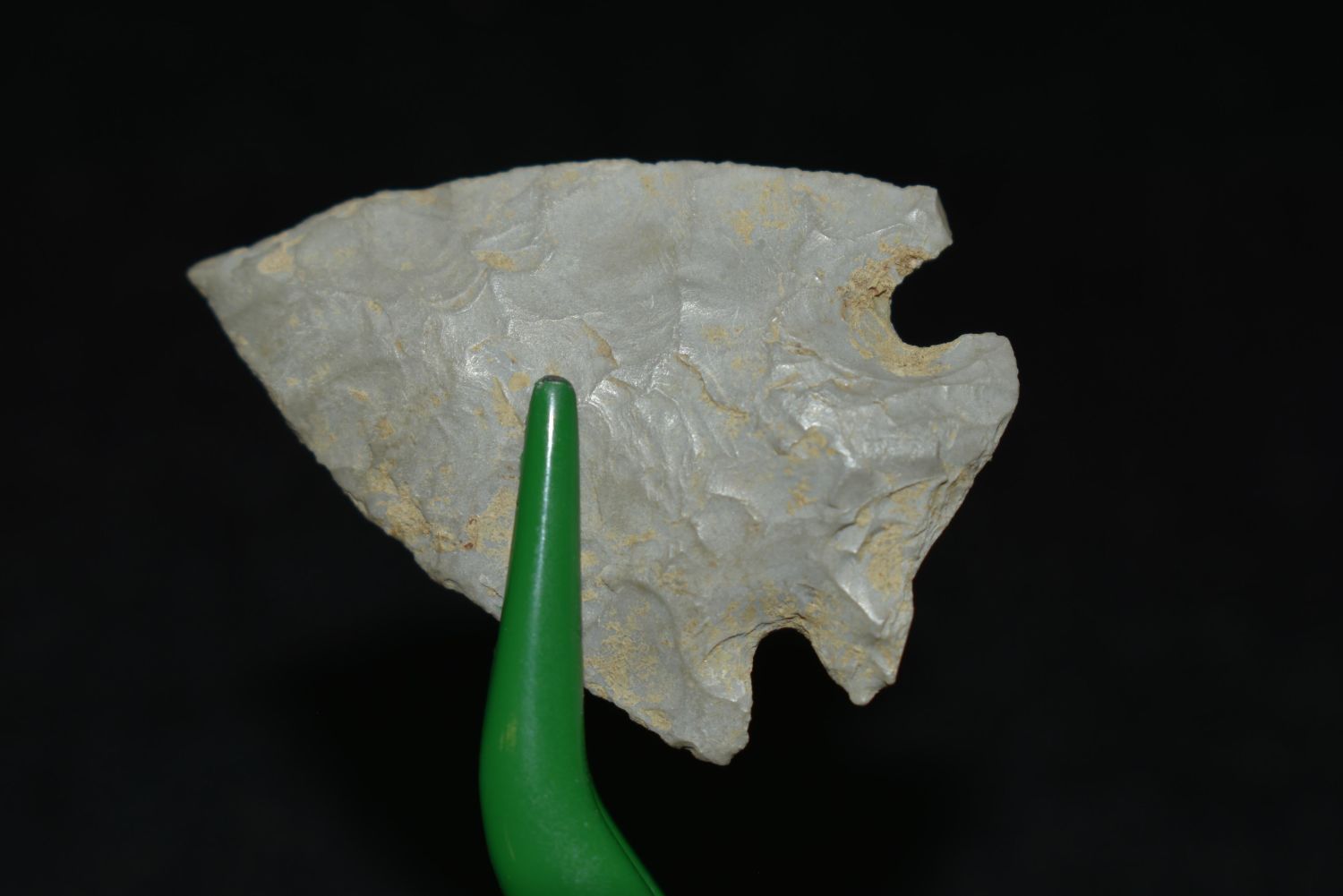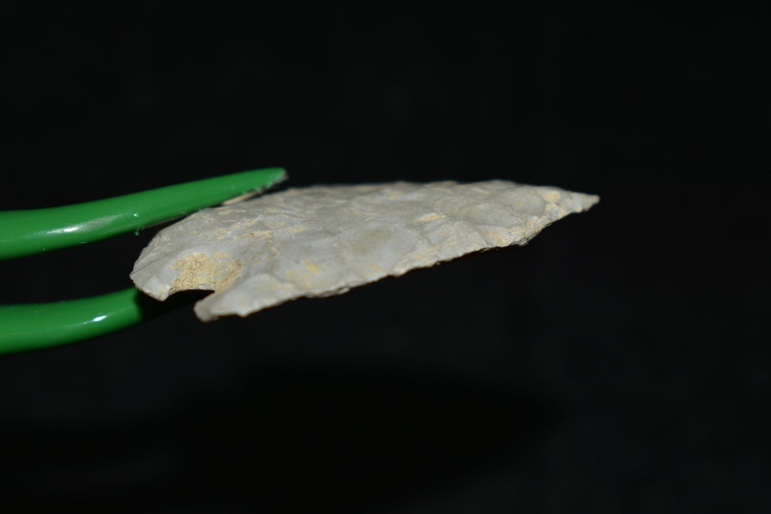 1 3/8" Avonlea point Found in Musselshell, Montana. Creel Poore was born and raised in Musselshell, Montana where he found his first arrowhead at a very early age. This led Creel on a lifetime search for Montana’s prehistoric past. Creel owned a ranch in Musselshell and collected from sites and in and around the Musselshell River and tributaries. Every piece in Creel’s collection is personally found. He did not purchase pieces, nor did he accept pieces as gifts. He took pride in the fact he found every piece. He also made the cedar frames from cedar trees that were cut on his ranch. Many of the pieces were collected from the buffalo jumps which were plentiful nearby