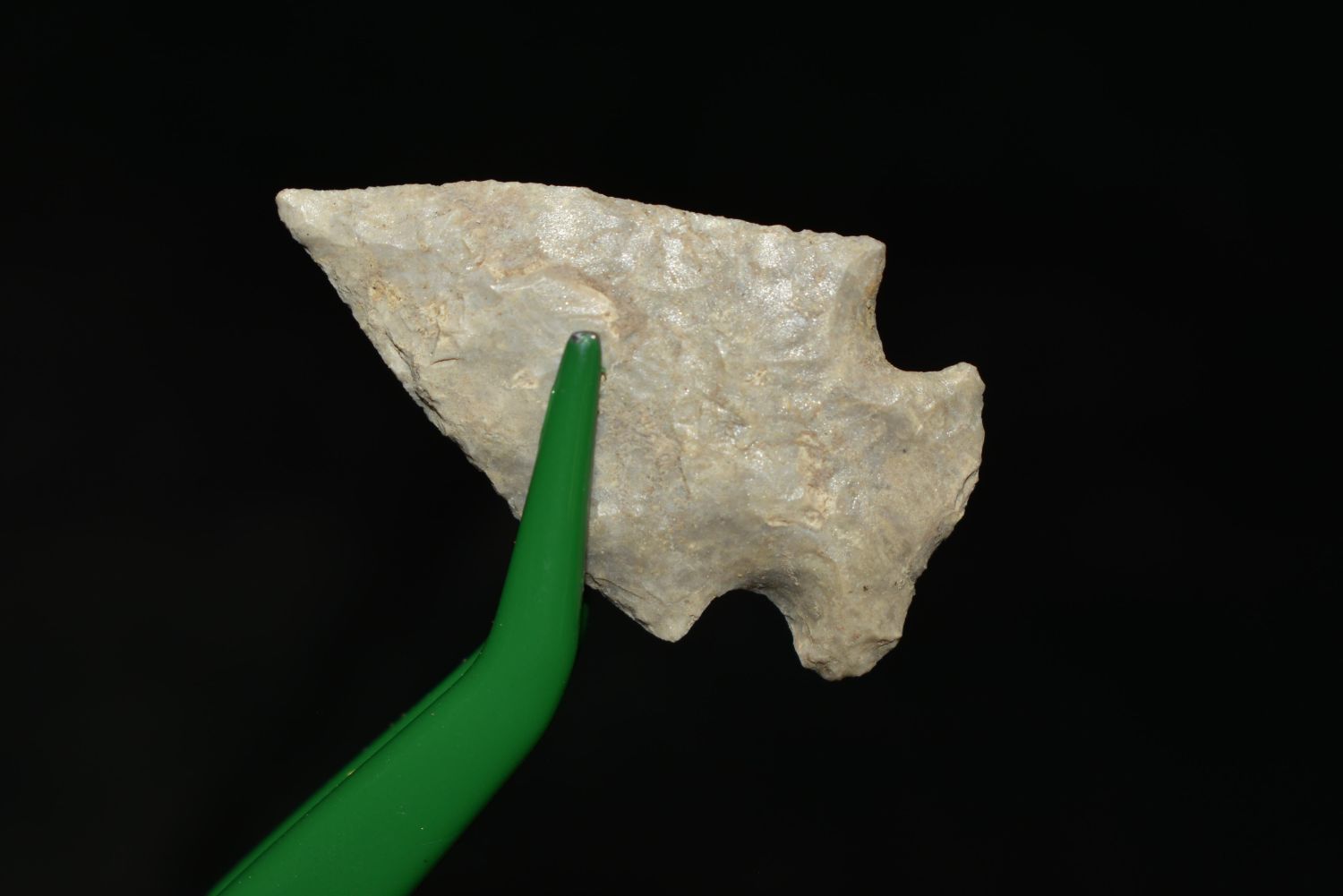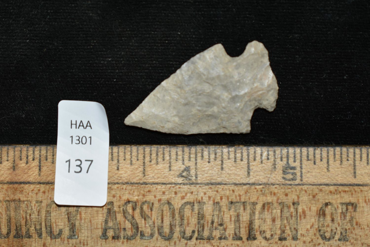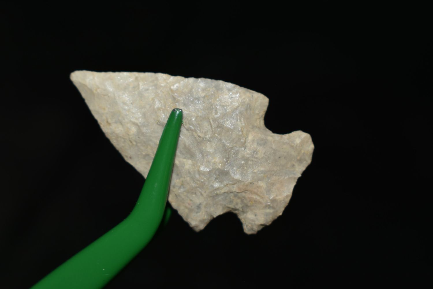 1 1/2" Glendo Arrow, Musselshell, MT, Creel Poore was born and raised in Musselshell, Montana where he found his first arrowhead at a very early age. This led Creel on a lifetime search for Montana’s prehistoric past. Creel owned a ranch in Musselshell and collected from sites and in and around the Musselshell River and tributaries. Every piece in Creel’s collection is personally found. He did not purchase pieces, nor did he accept pieces as gifts. He took pride in the fact he found every piece. He also made the cedar frames from cedar trees that were cut on his ranch. Many of the pieces were collected from the buffalo jumps which were plentiful nearby