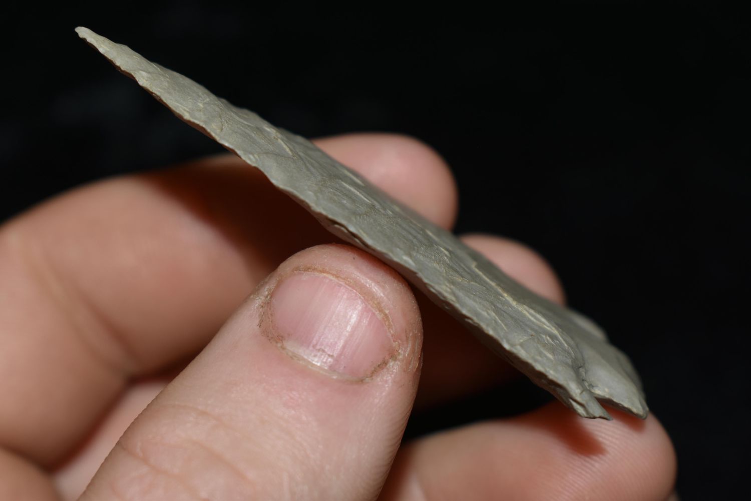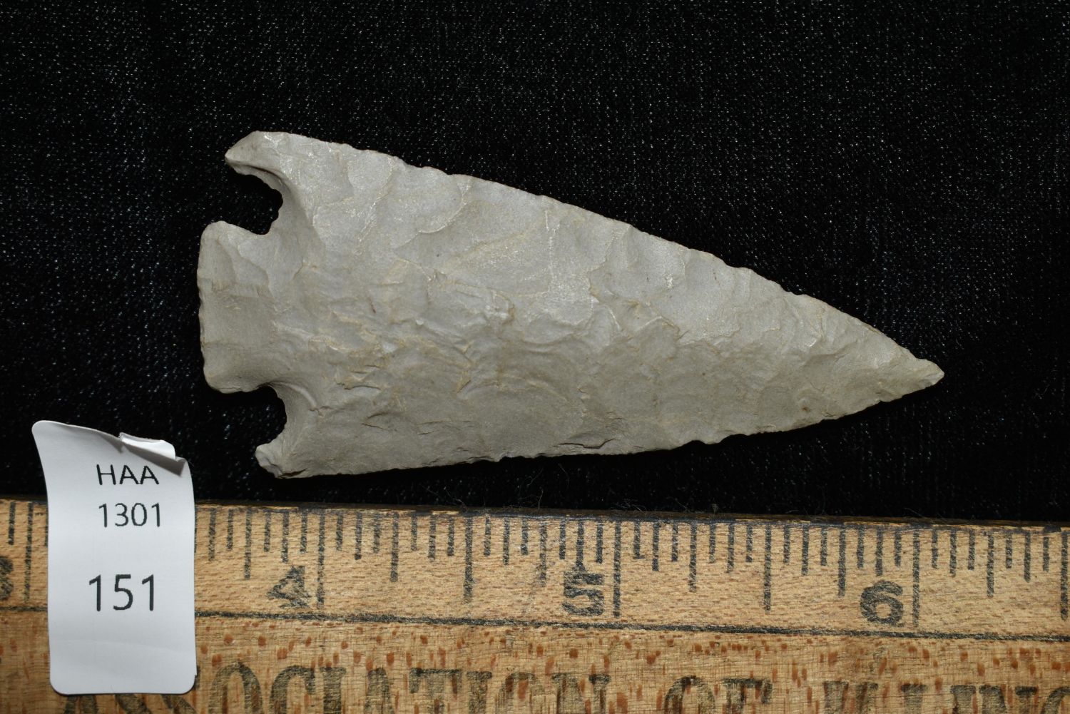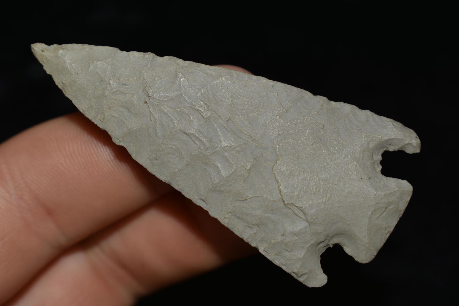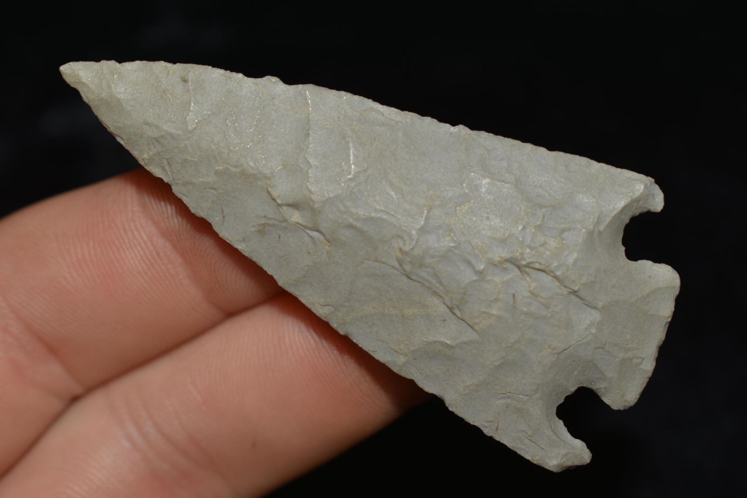 2 1/2" Wray, Musselshell, MT, Creel Poore was born and raised in Musselshell, Montana where he found his first arrowhead at a very early age. This led Creel on a lifetime search for Montana’s prehistoric past. Creel owned a ranch in Musselshell and collected from sites and in and around the Musselshell River and tributaries. Every piece in Creel’s collection is personally found. He did not purchase pieces, nor did he accept pieces as gifts. He took pride in the fact he found every piece. He also made the cedar frames from cedar trees that were cut on his ranch. Many of the pieces were collected from the buffalo jumps which were plentiful nearby