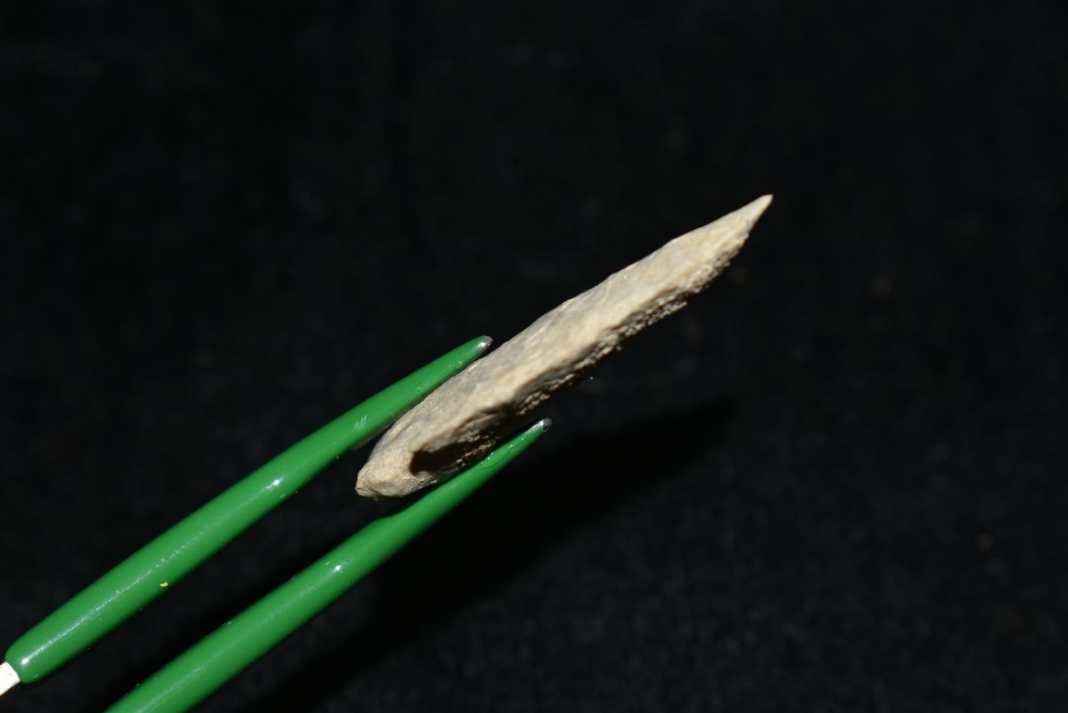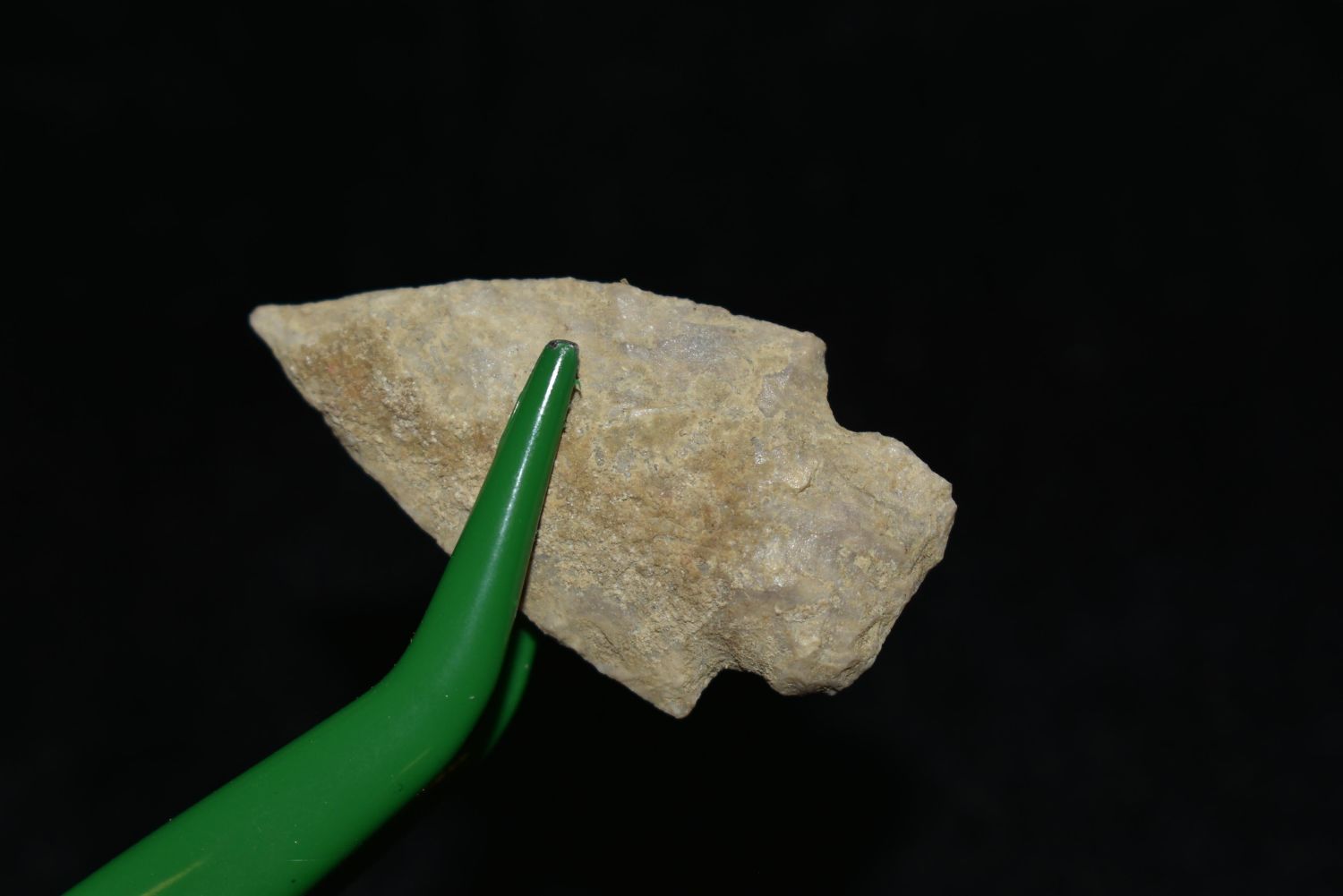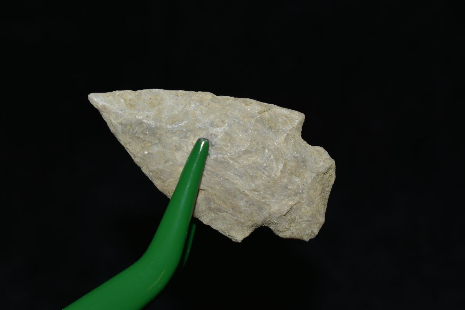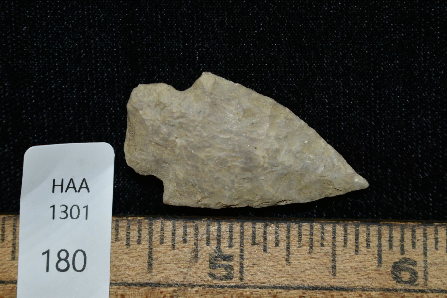 1 3/8" Lewis, Musselshell, MT, Creel Poore was born and raised in Musselshell, Montana where he found his first arrowhead at a very early age. This led Creel on a lifetime search for Montana’s prehistoric past. Creel owned a ranch in Musselshell and collected from sites and in and around the Musselshell River and tributaries. Every piece in Creel’s collection is personally found. He did not purchase pieces, nor did he accept pieces as gifts. He took pride in the fact he found every piece. He also made the cedar frames from cedar trees that were cut on his ranch. Many of the pieces were collected from the buffalo jumps which were plentiful nearby