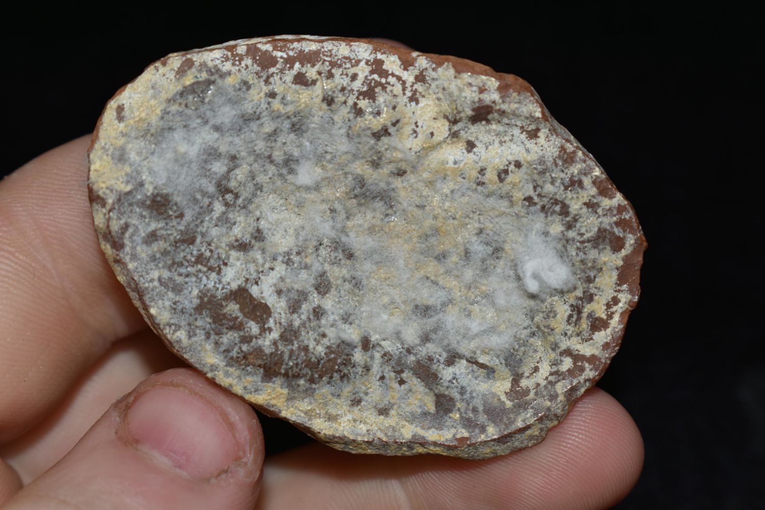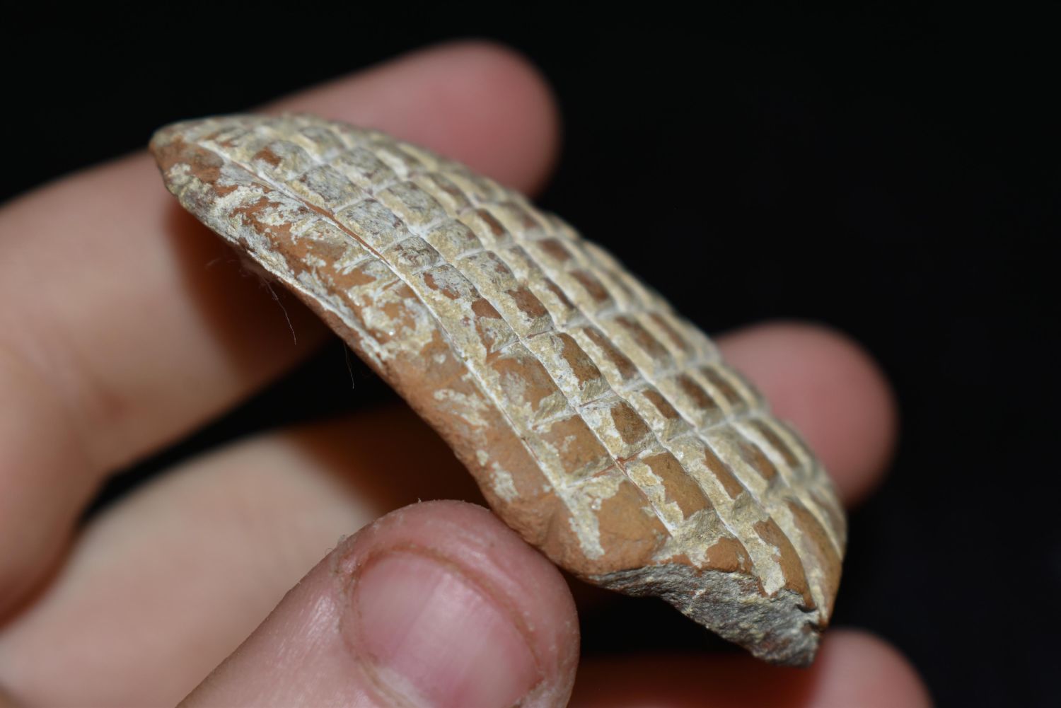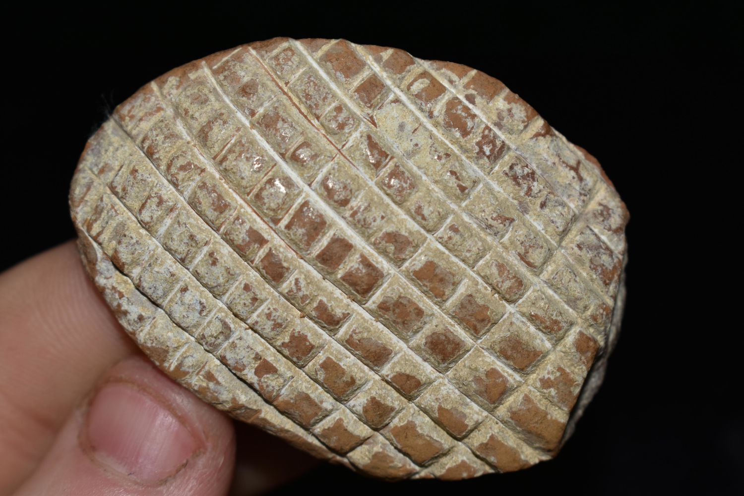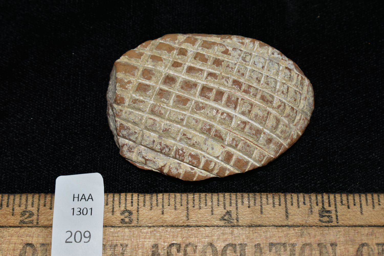 2 1/4" Cross-Hatched, Engraved Ornament, Great Patination made of Pottery, Musselshell, MT, Creel Poore was born and raised in Musselshell, Montana where he found his first arrowhead at a very early age. This led Creel on a lifetime search for Montana’s prehistoric past. Creel owned a ranch in Musselshell and collected from sites and in and around the Musselshell River and tributaries. Every piece in Creel’s collection is personally found. He did not purchase pieces, nor did he accept pieces as gifts. He took pride in the fact he found every piece. He also made the cedar frames from cedar trees that were cut on his ranch. Many of the pieces were collected from the buffalo jumps which were plentiful nearby