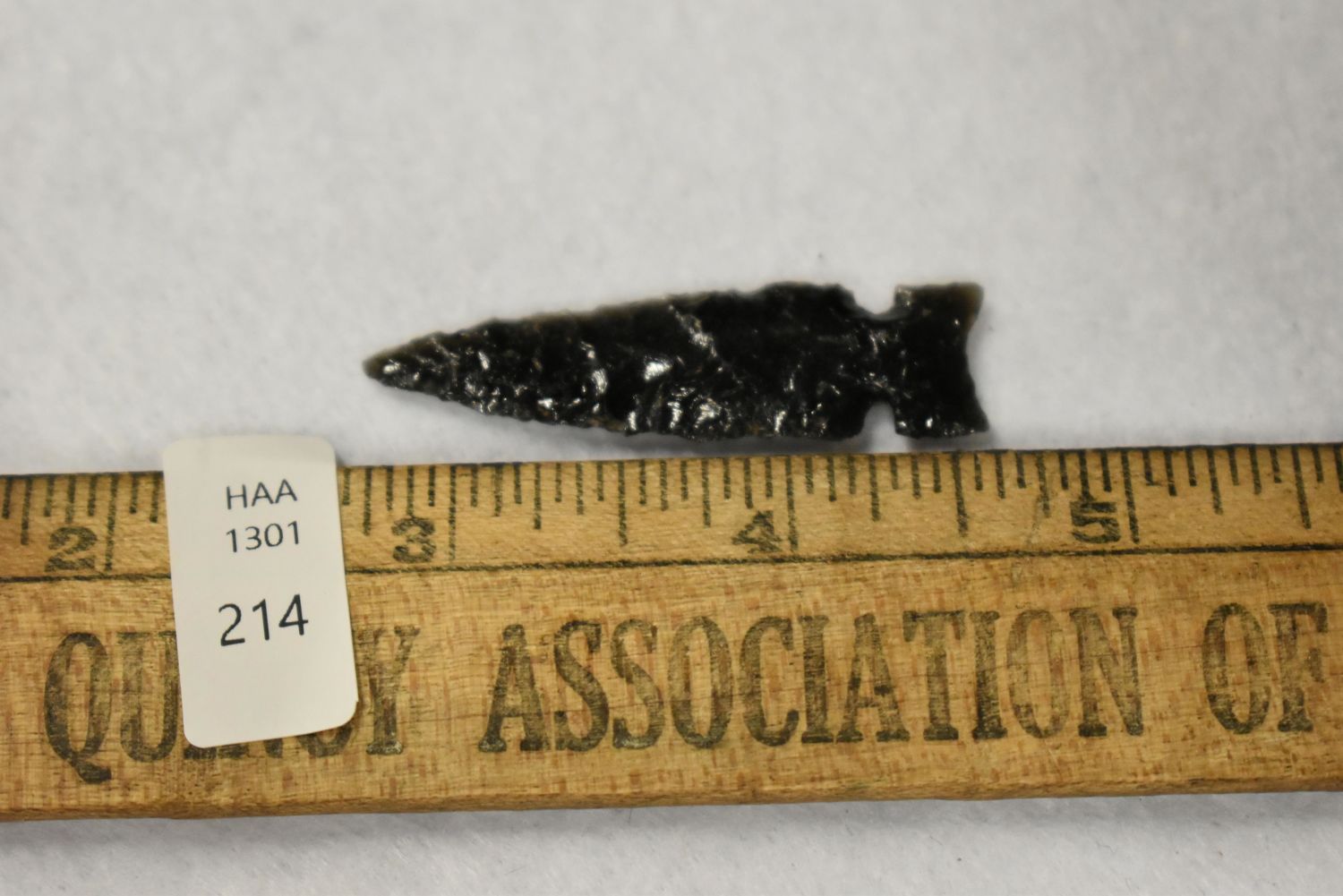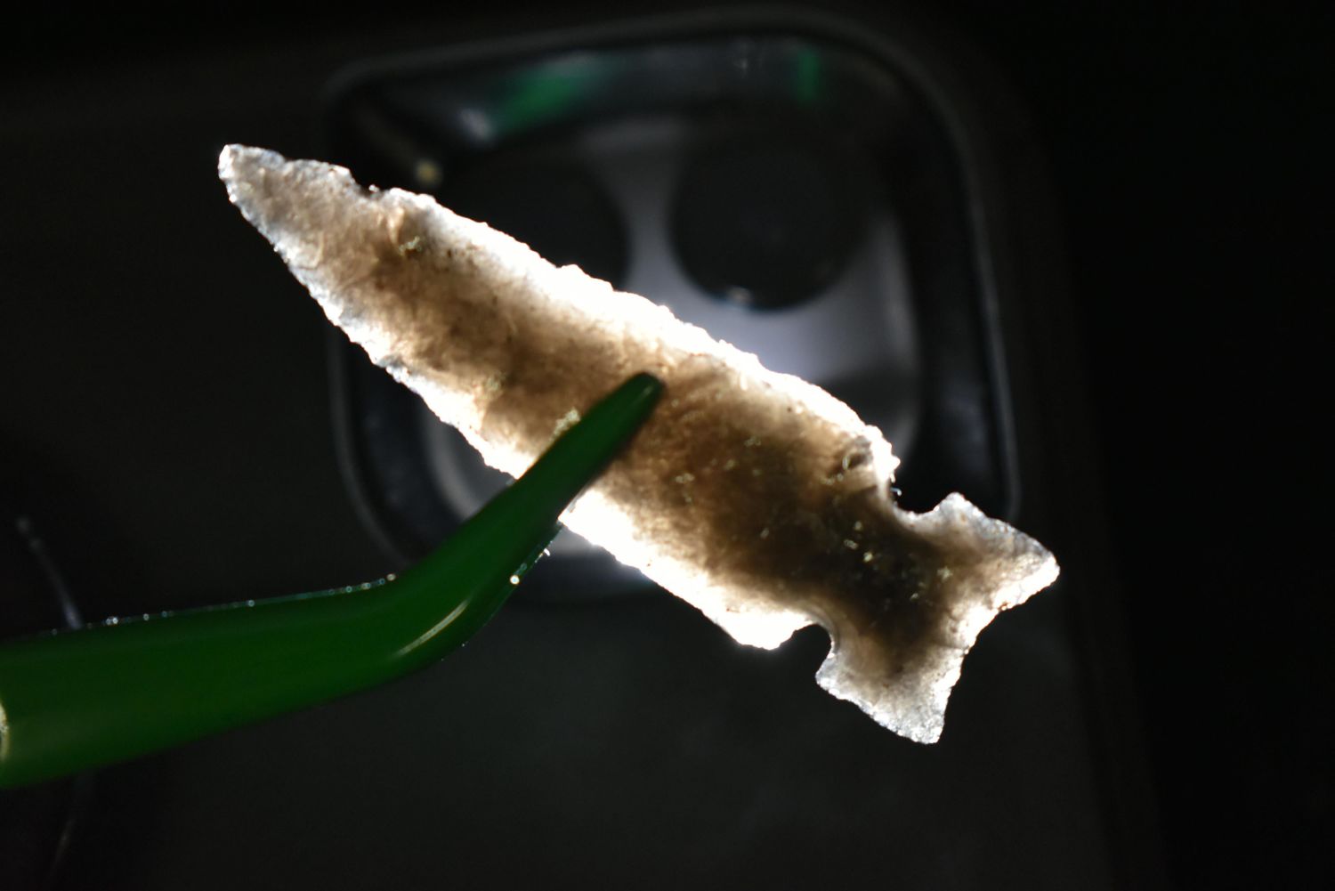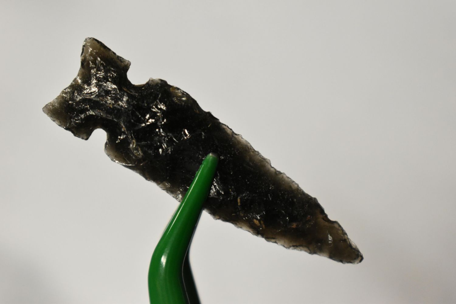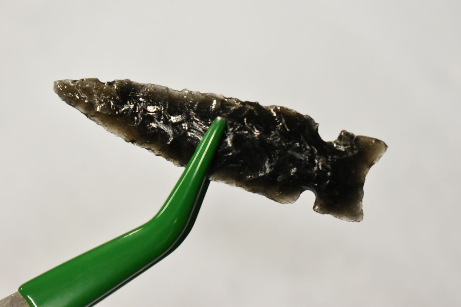 1 7/8" Cut Bank Jaw Notched, Obsidian, Semi-translucent, Musselshell, MT, Creel Poore was born and raised in Musselshell, Montana where he found his first arrowhead at a very early age. This led Creel on a lifetime search for Montana’s prehistoric past. Creel owned a ranch in Musselshell and collected from sites and in and around the Musselshell River and tributaries. Every piece in Creel’s collection is personally found. He did not purchase pieces, nor did he accept pieces as gifts. He took pride in the fact he found every piece. He also made the cedar frames from cedar trees that were cut on his ranch. Many of the pieces were collected from the buffalo jumps which were plentiful nearby