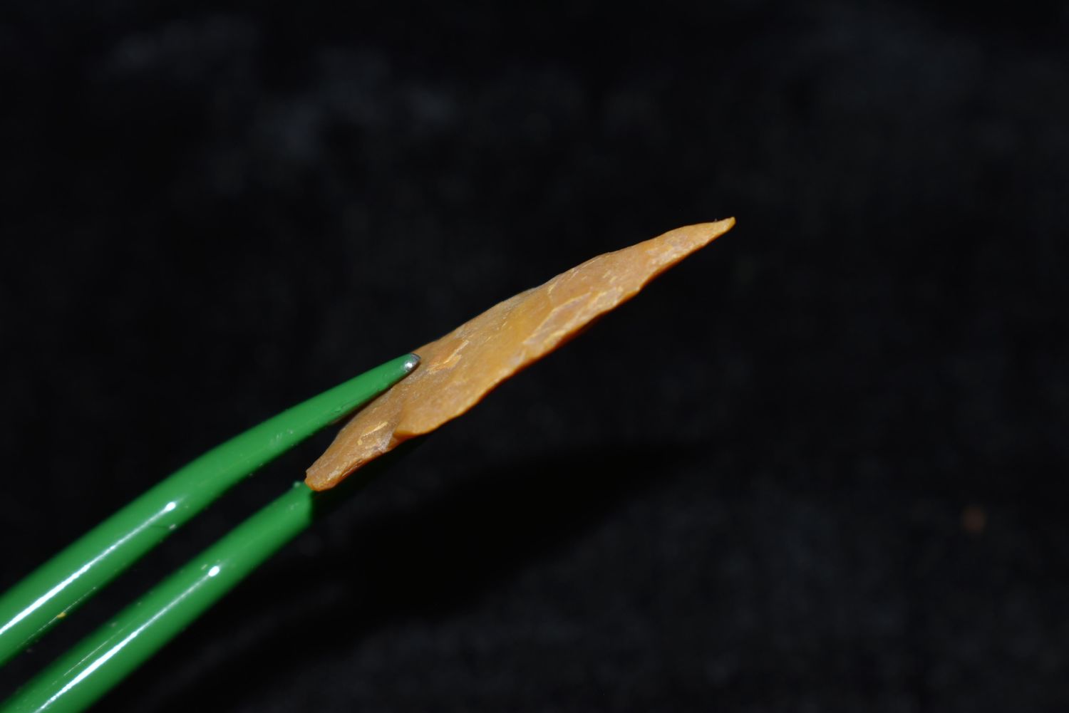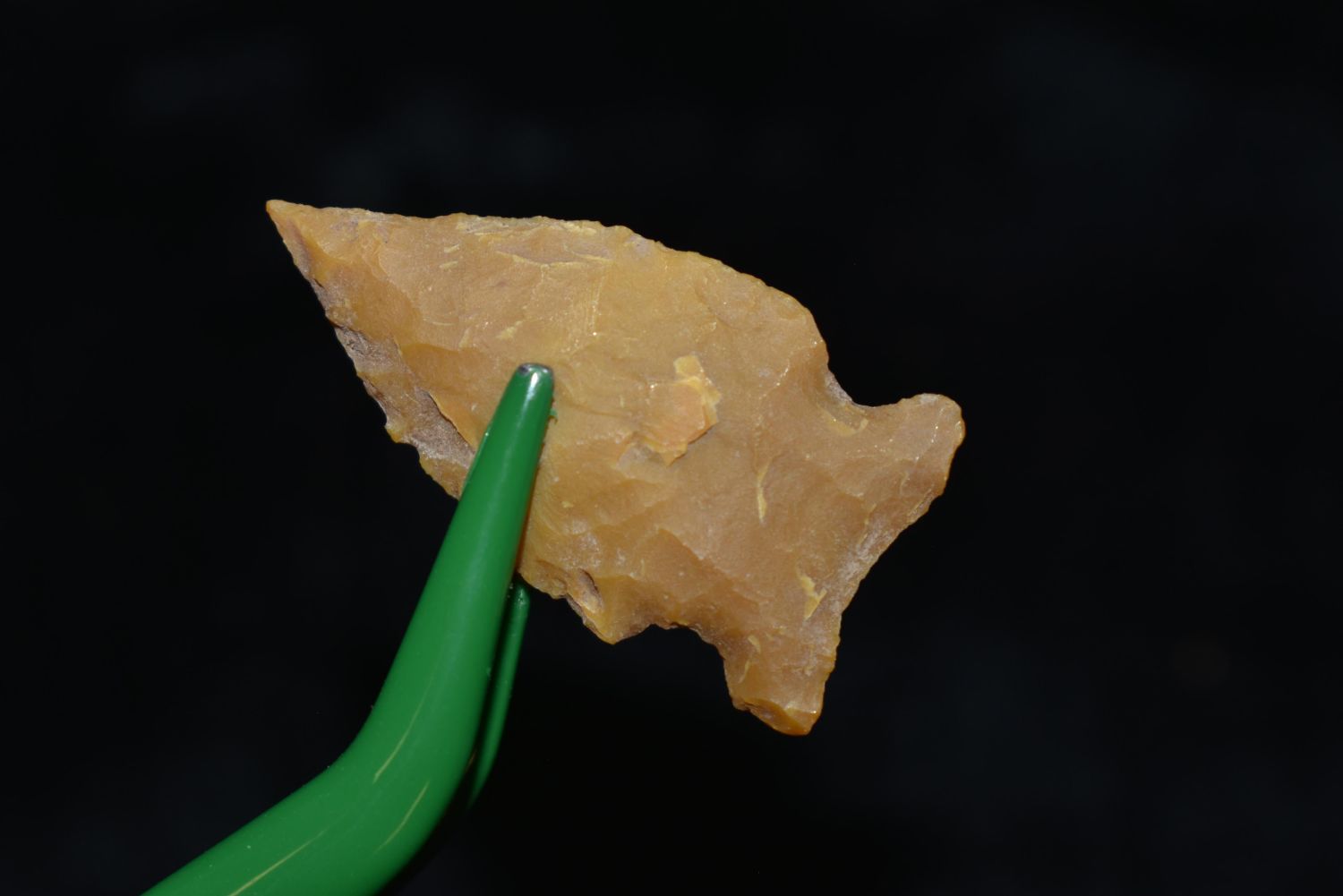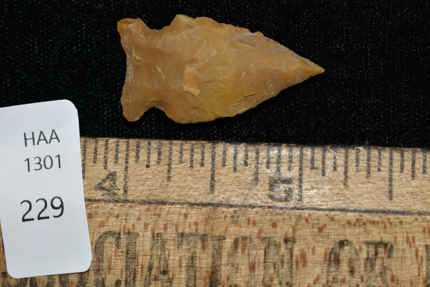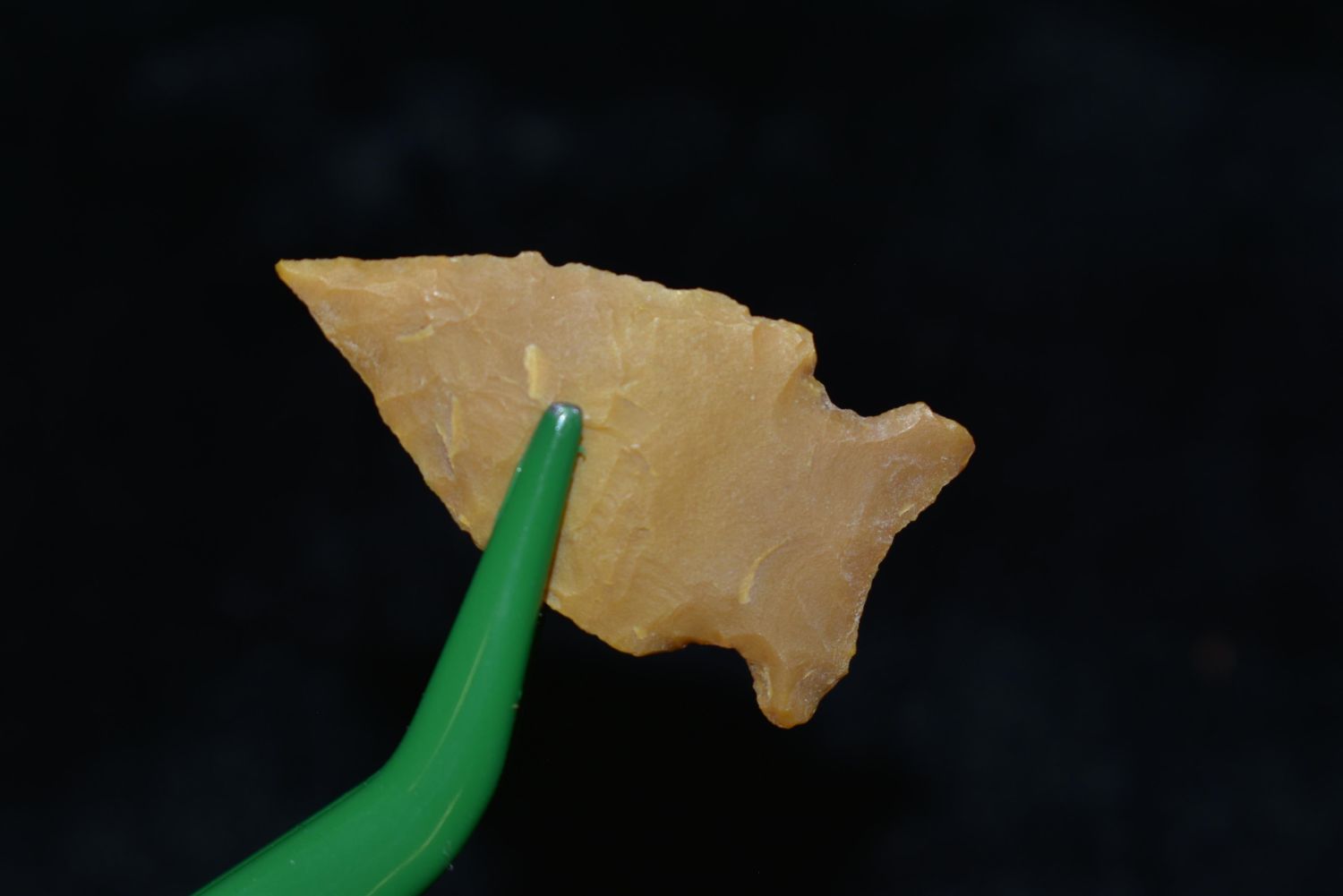 1 1/4" Logan Creek, Musselshell, MT, Creel Poore was born and raised in Musselshell, Montana where he found his first arrowhead at a very early age. This led Creel on a lifetime search for Montana’s prehistoric past. Creel owned a ranch in Musselshell and collected from sites and in and around the Musselshell River and tributaries. Every piece in Creel’s collection is personally found. He did not purchase pieces, nor did he accept pieces as gifts. He took pride in the fact he found every piece. He also made the cedar frames from cedar trees that were cut on his ranch. Many of the pieces were collected from the buffalo jumps which were plentiful nearby