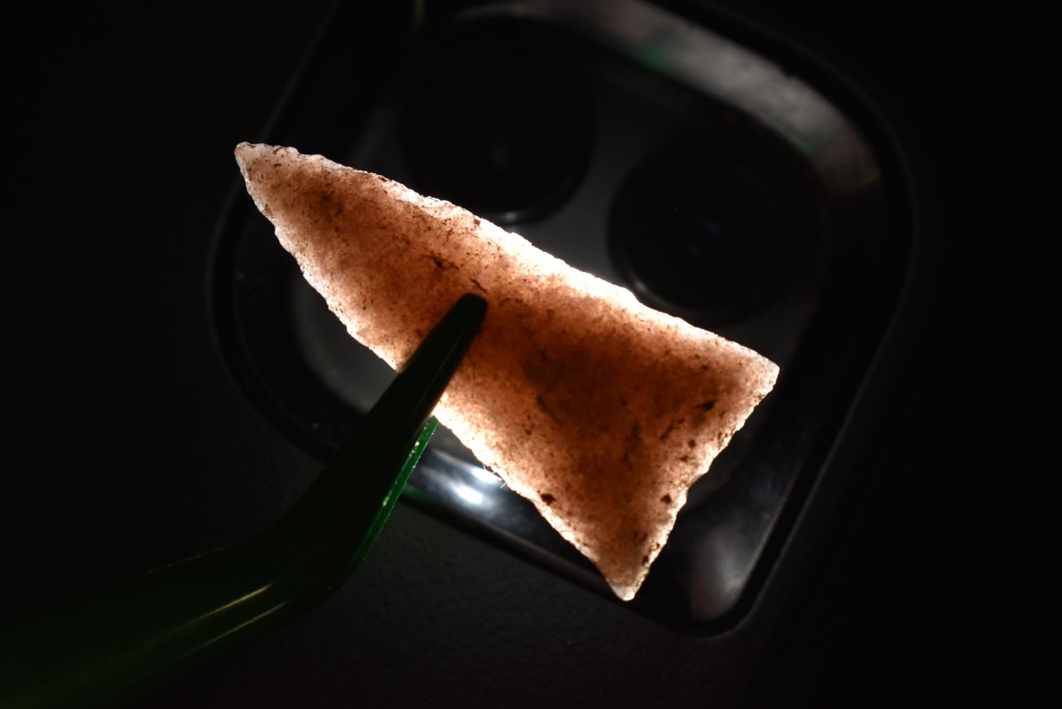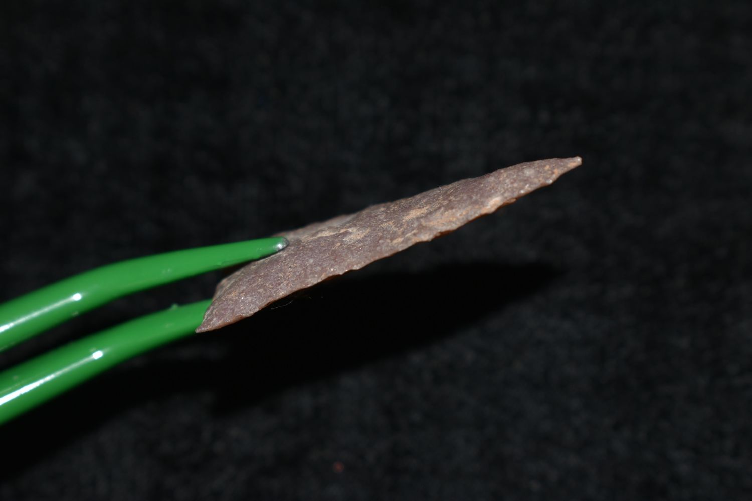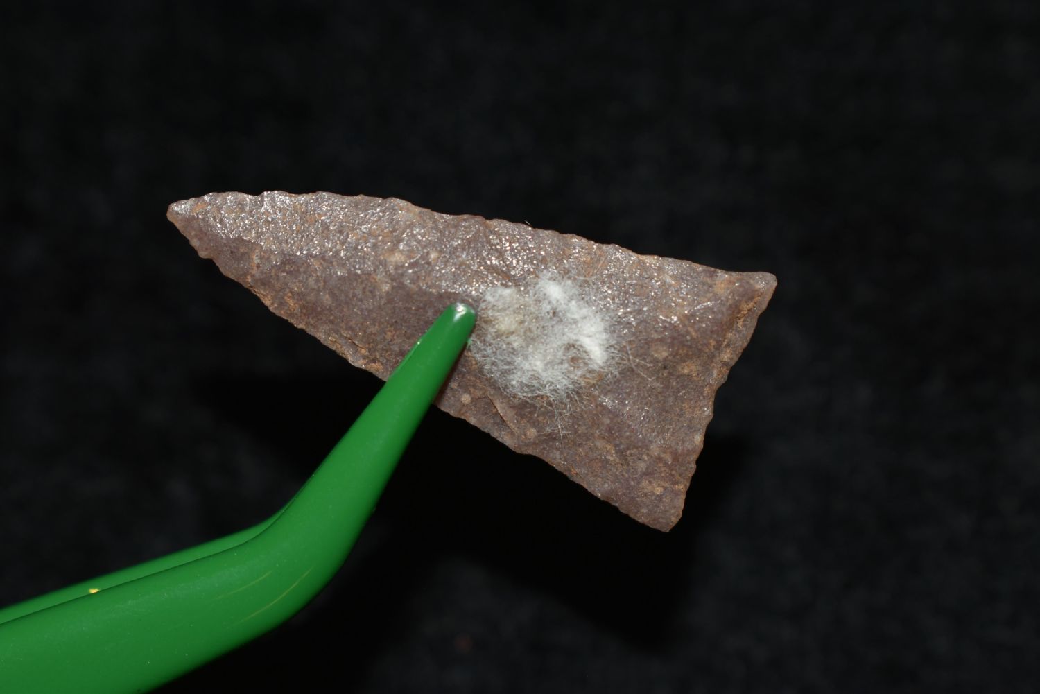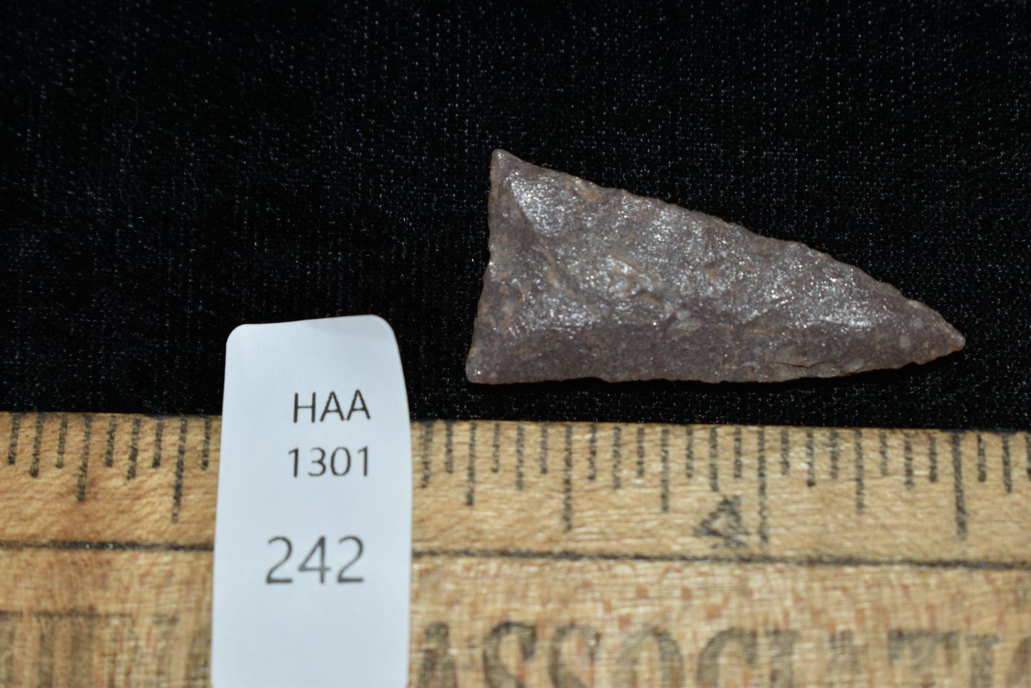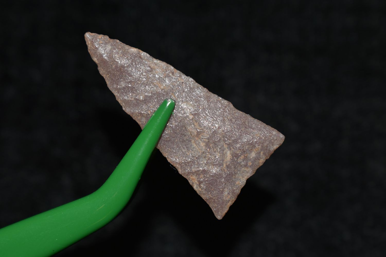 1 1/4" Plains Triangular found in Musselshell, Montana, Creel Poore was born and raised in Musselshell, Montana where he found his first arrowhead at a very early age. This led Creel on a lifetime search for Montana’s prehistoric past. Creel owned a ranch in Musselshell and collected from sites and in and around the Musselshell River and tributaries. Every piece in Creel’s collection is personally found. He did not purchase pieces, nor did he accept pieces as gifts. He took pride in the fact he found every piece. He also made the cedar frames from cedar trees that were cut on his ranch. Many of the pieces were collected from the buffalo jumps which were plentiful nearby