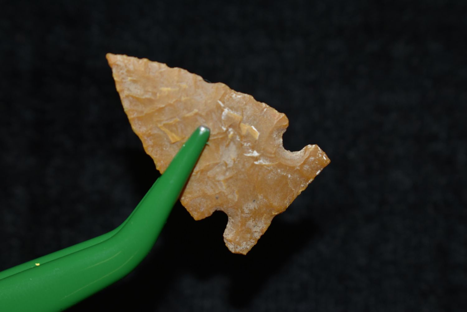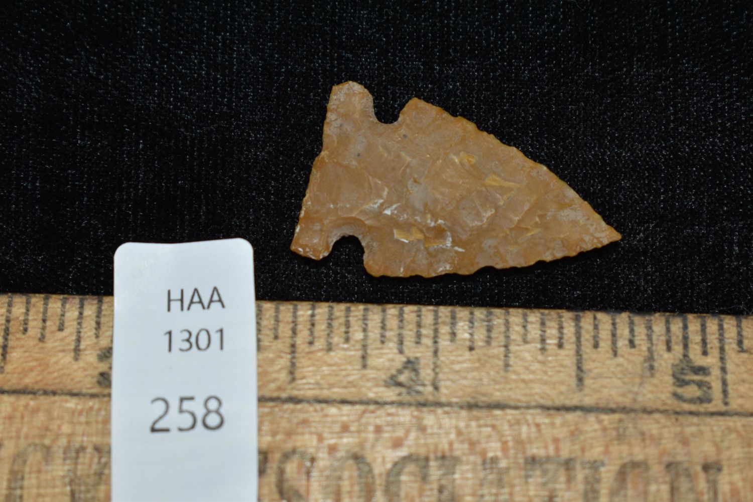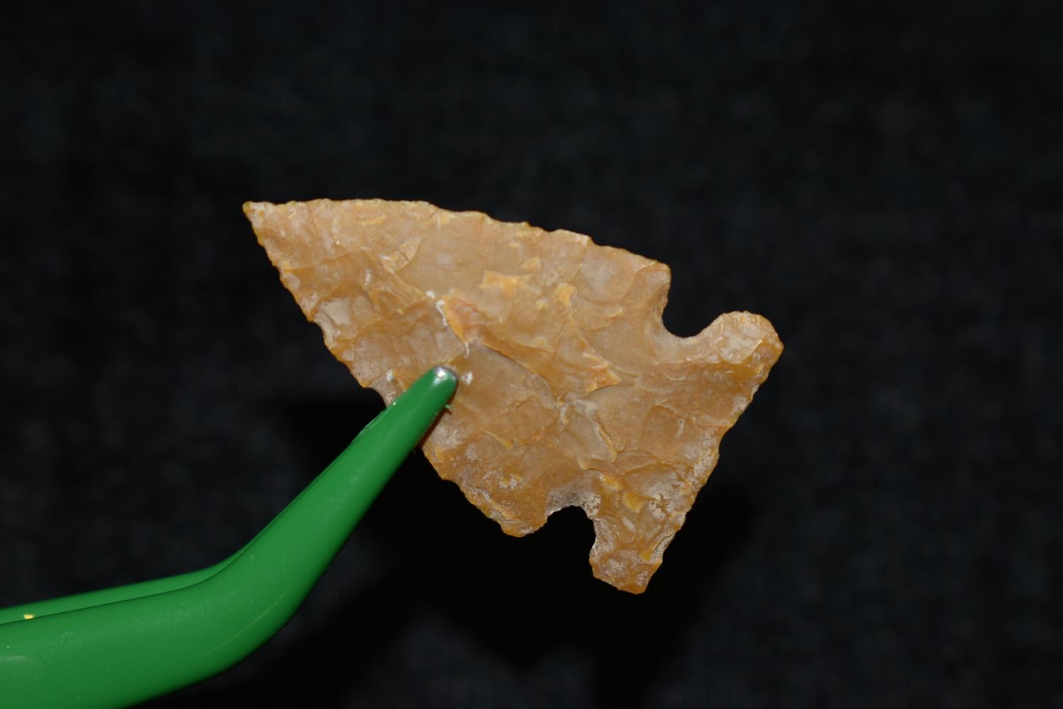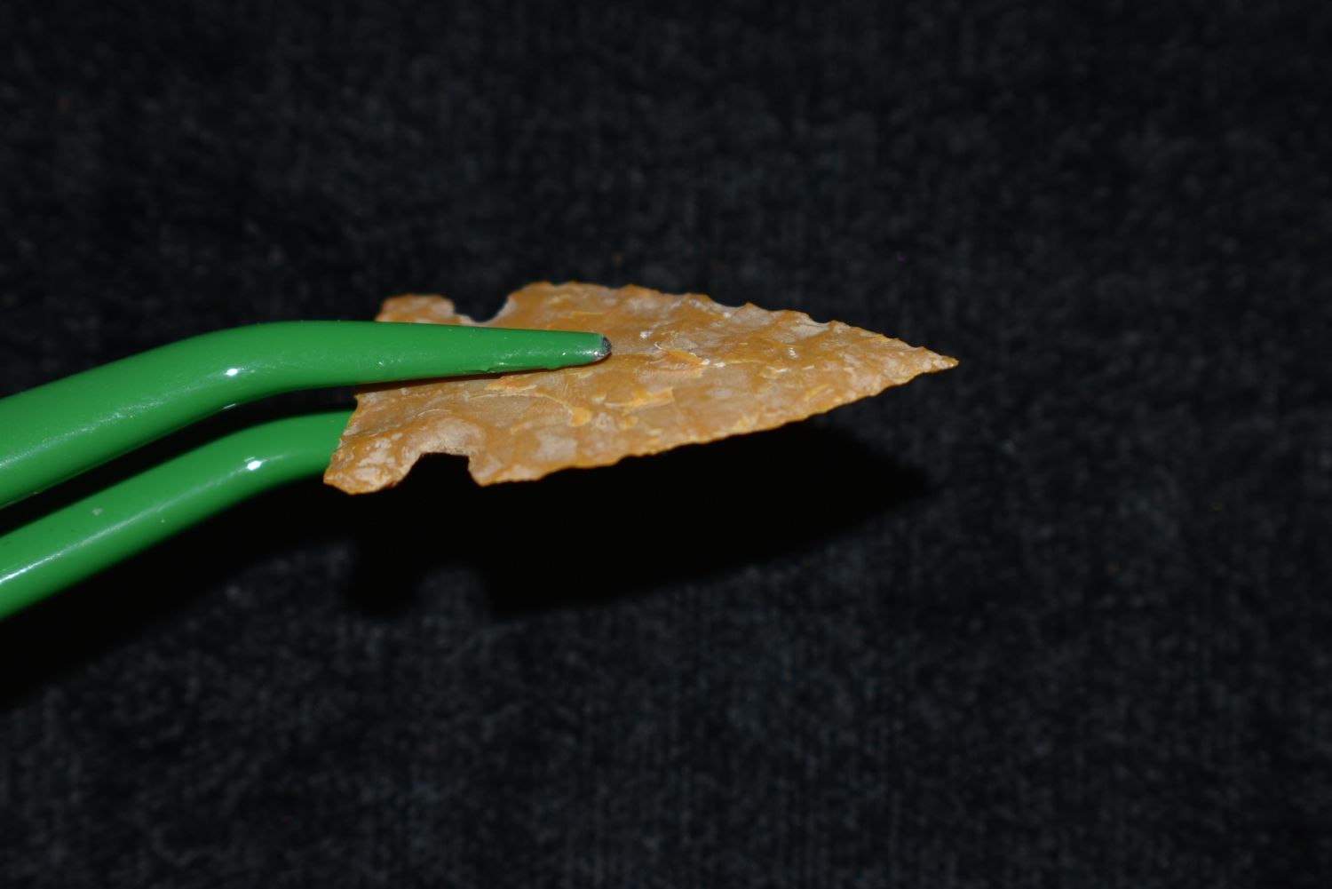 1 1/8" Plains Side Notched, Musselshell, MT, Creel Poore was born and raised in Musselshell, Montana where he found his first arrowhead at a very early age. This led Creel on a lifetime search for Montana’s prehistoric past. Creel owned a ranch in Musselshell and collected from sites and in and around the Musselshell River and tributaries. Every piece in Creel’s collection is personally found. He did not purchase pieces, nor did he accept pieces as gifts. He took pride in the fact he found every piece. He also made the cedar frames from cedar trees that were cut on his ranch. Many of the pieces were collected from the buffalo jumps which were plentiful nearby