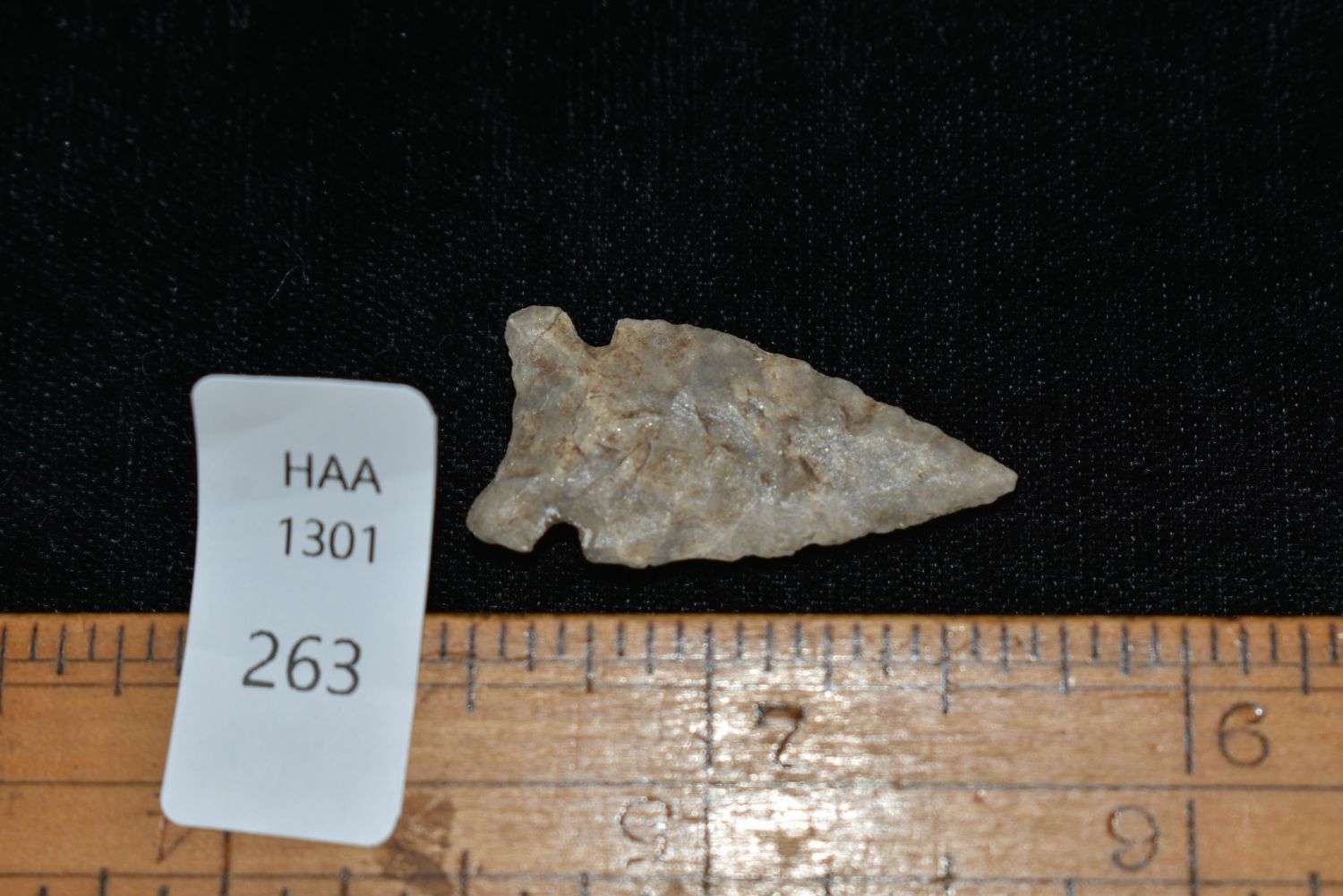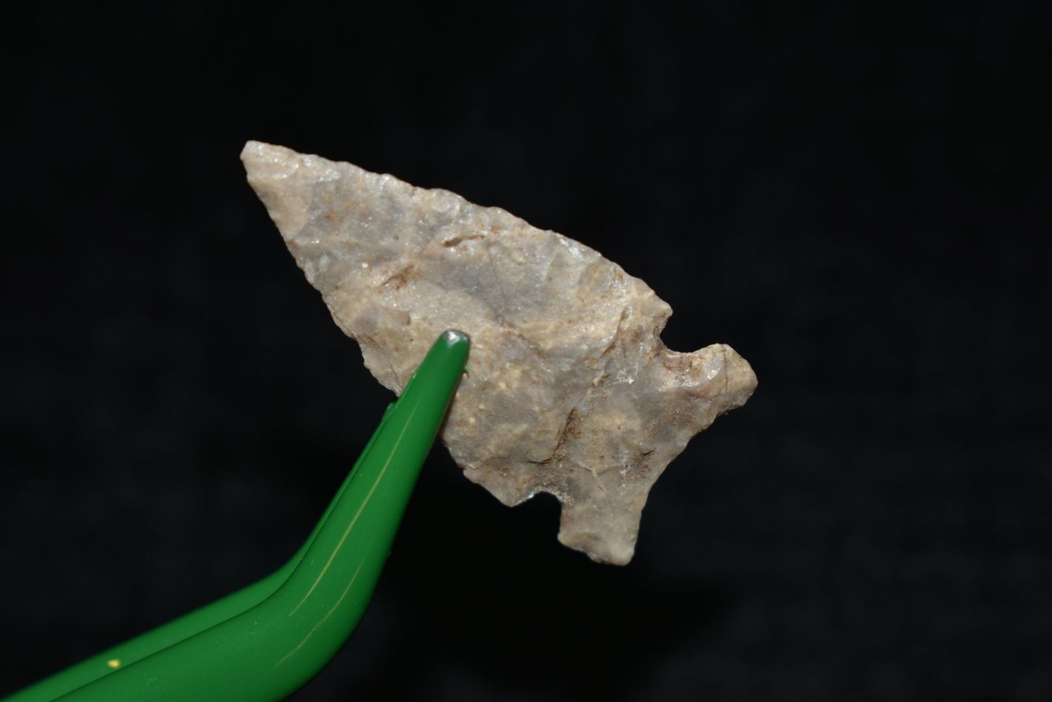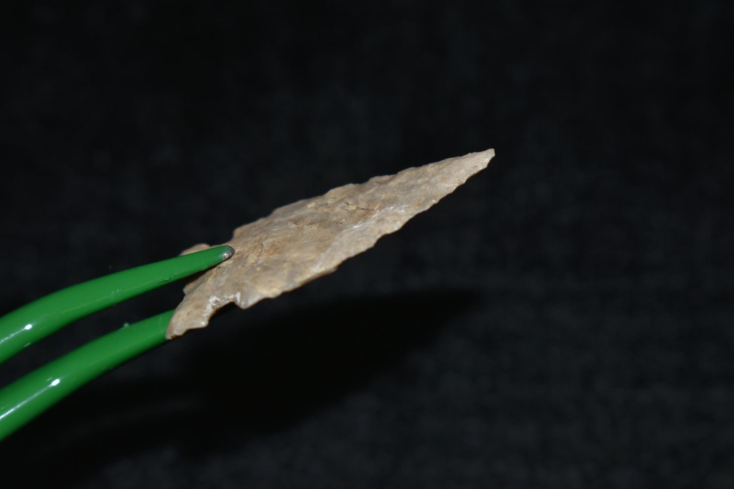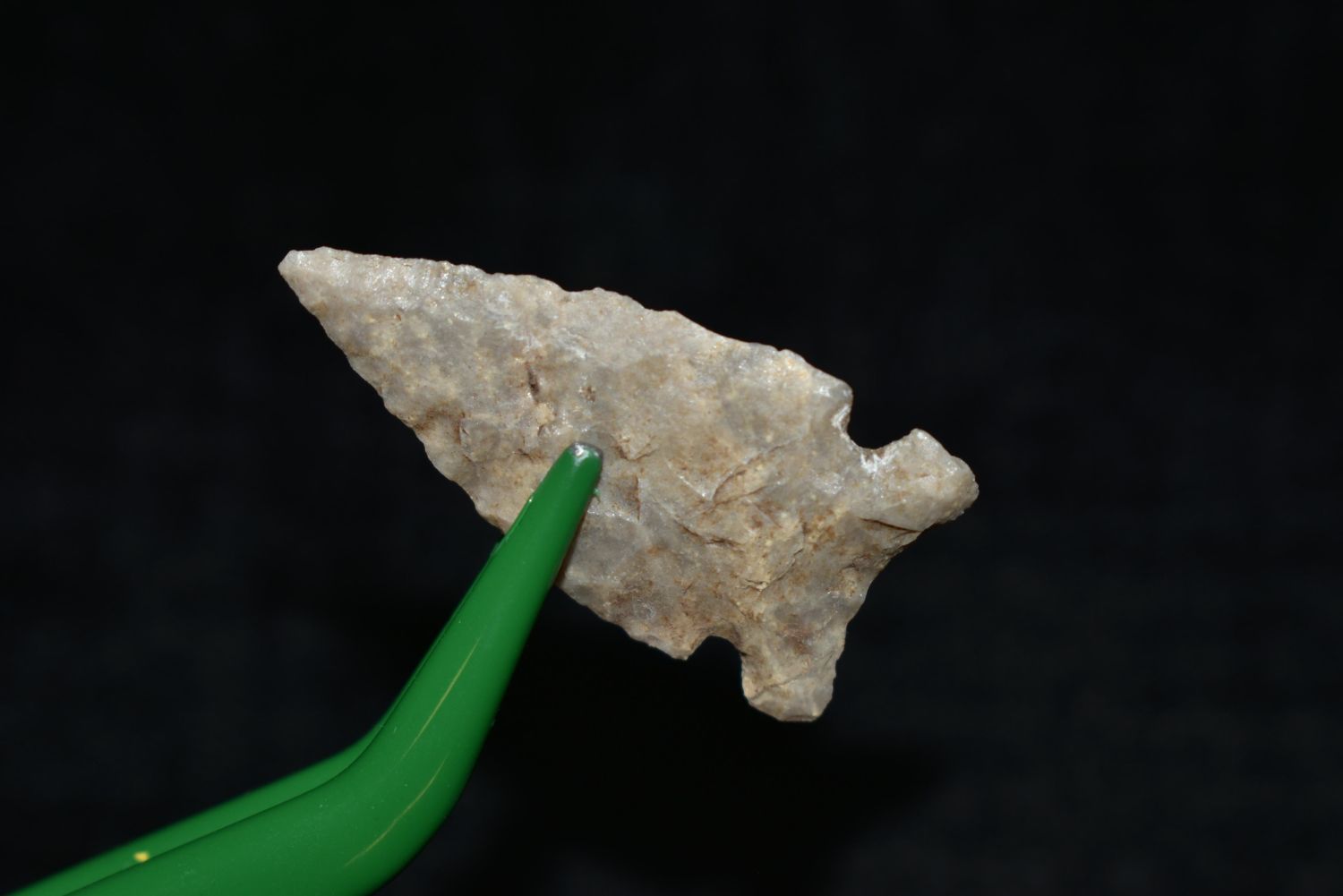 1 1/8" Plains Side Notched, Musselshell, MT, Creel Poore was born and raised in Musselshell, Montana where he found his first arrowhead at a very early age. This led Creel on a lifetime search for Montana’s prehistoric past. Creel owned a ranch in Musselshell and collected from sites and in and around the Musselshell River and tributaries. Every piece in Creel’s collection is personally found. He did not purchase pieces, nor did he accept pieces as gifts. He took pride in the fact he found every piece. He also made the cedar frames from cedar trees that were cut on his ranch. Many of the pieces were collected from the buffalo jumps which were plentiful nearby