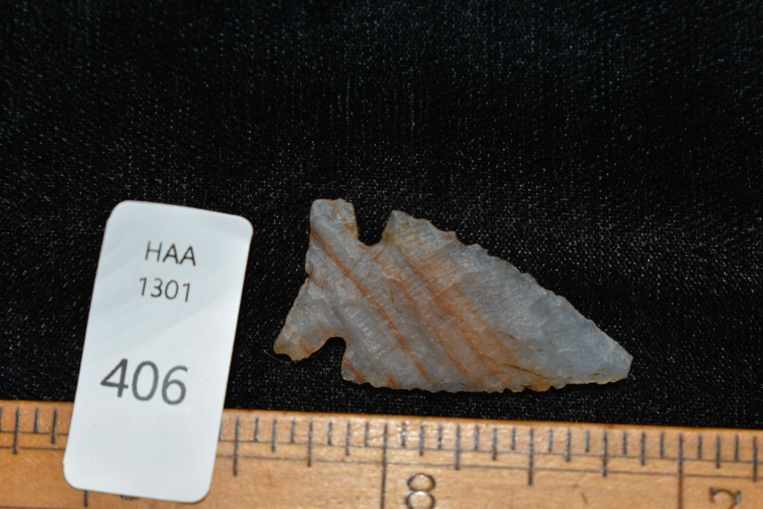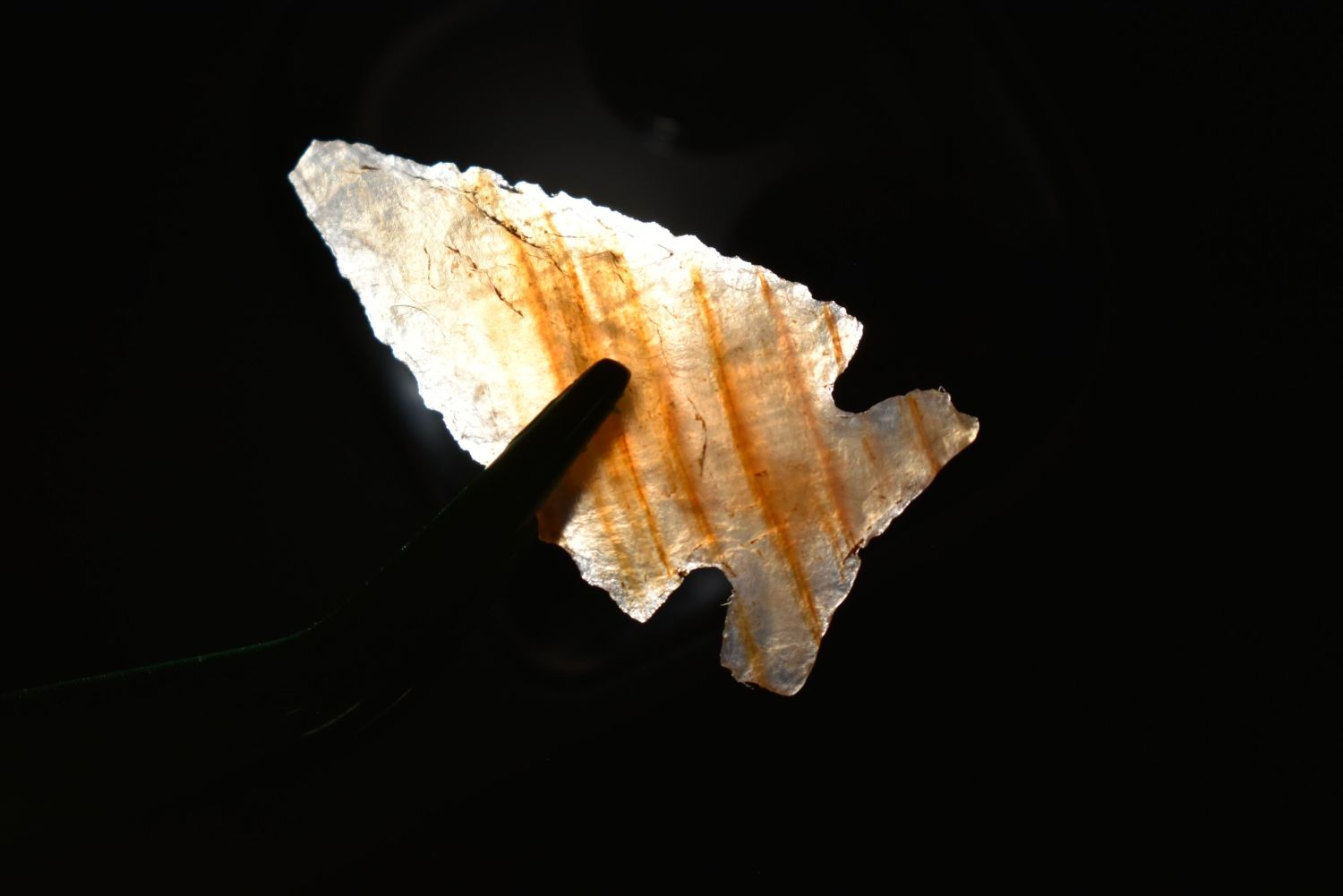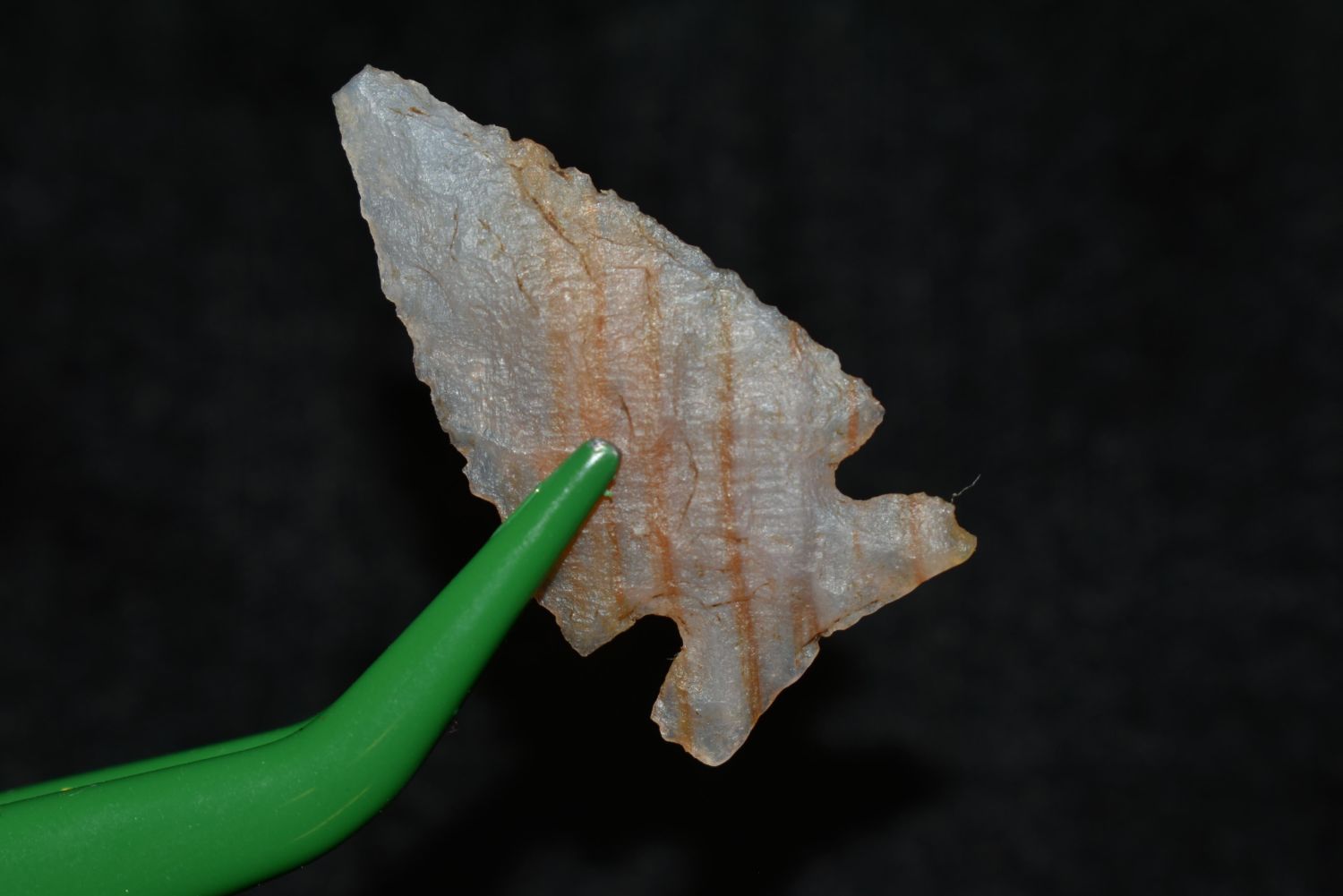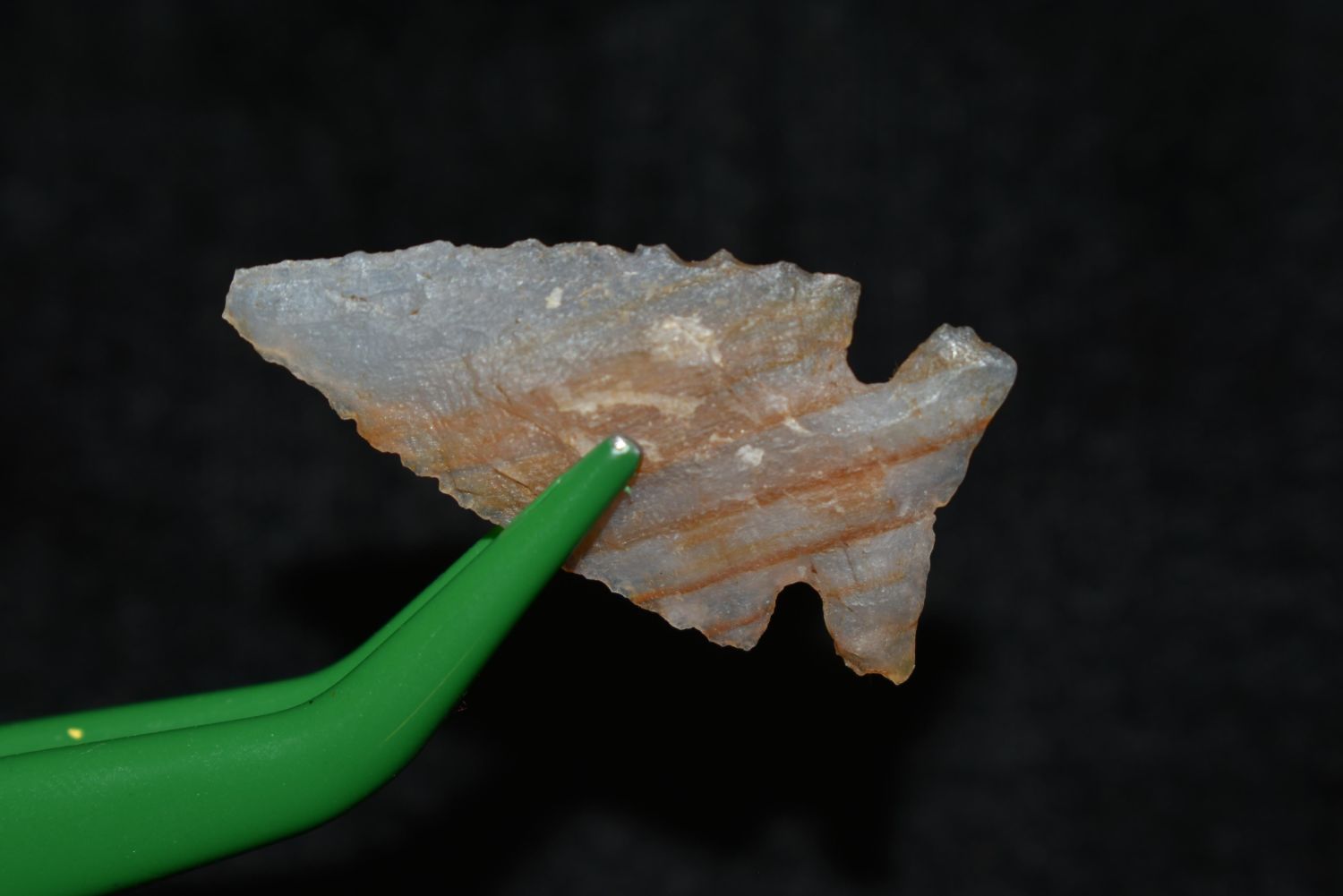 1 1/8" Highly Translucent Plains Side Notched, Musselshell, Montana where he found his first arrowhead at a very early age. This led Creel on a lifetime search for Montana’s prehistoric past. Creel owned a ranch in Musselshell and collected from sites and in and around the Musselshell River and tributaries. Every piece in Creel’s collection is personally found. He did not purchase pieces, nor did he accept pieces as gifts. He took pride in the fact he found every piece. He also made the cedar frames from cedar trees that were cut on his ranch. Many of the pieces were collected from the buffalo jumps which were plentiful nearby