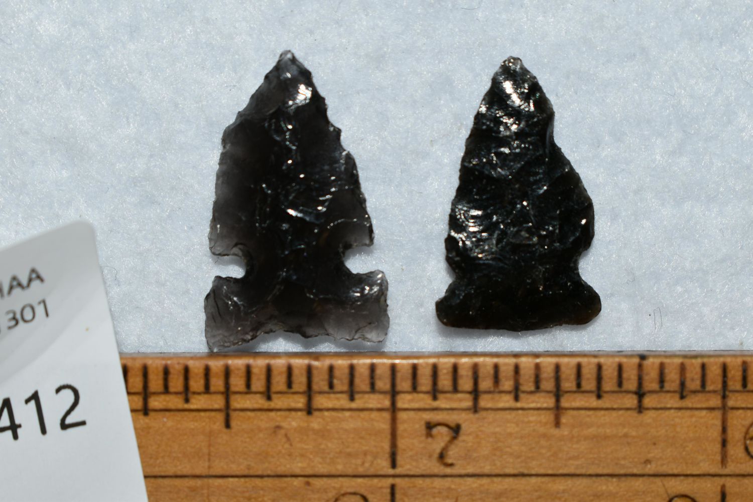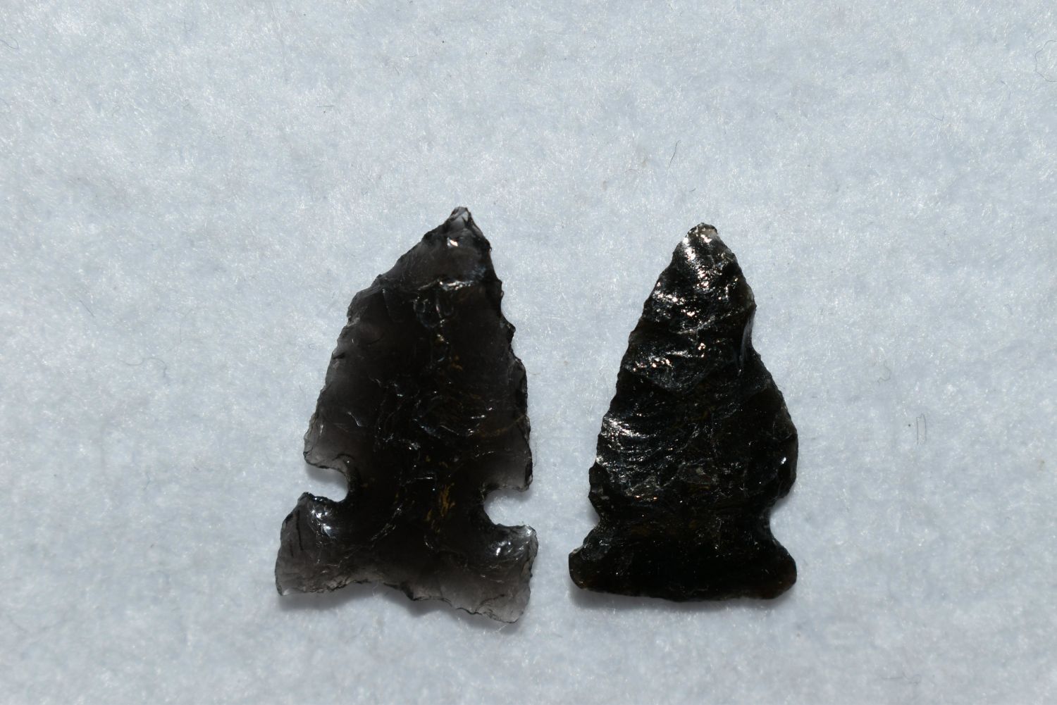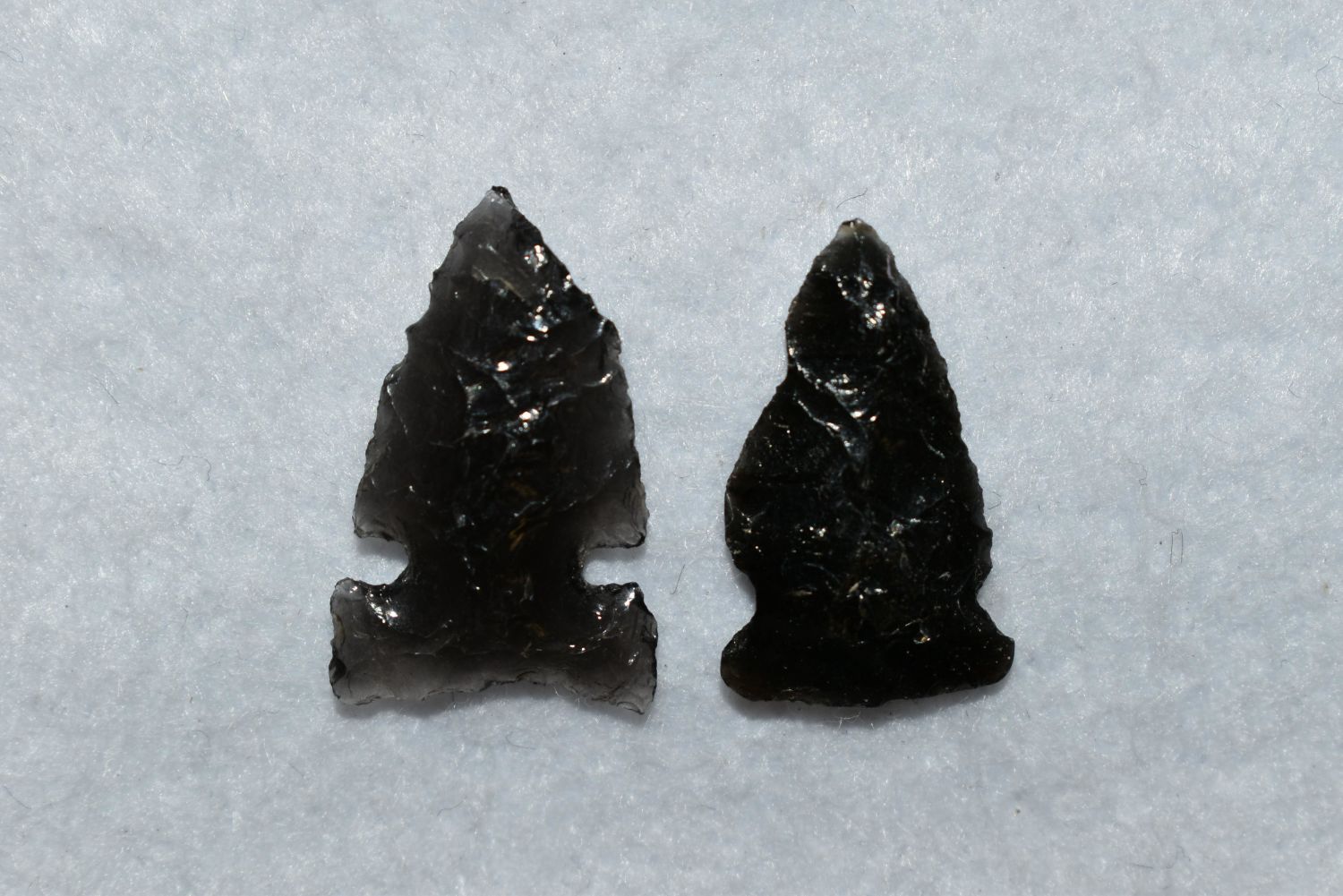 Lot of 2 Obsidian Birdpoints, Musselshell, Montana where he found his first arrowhead at a very early age. This led Creel on a lifetime search for Montana’s prehistoric past. Creel owned a ranch in Musselshell and collected from sites and in and around the Musselshell River and tributaries. Every piece in Creel’s collection is personally found. He did not purchase pieces, nor did he accept pieces as gifts. He took pride in the fact he found every piece. He also made the cedar frames from cedar trees that were cut on his ranch. Many of the pieces were collected from the buffalo jumps which were plentiful nearby