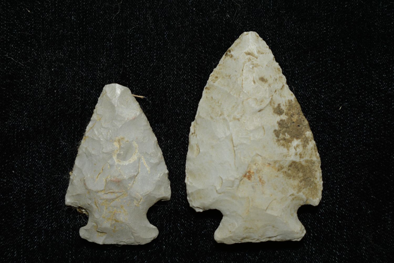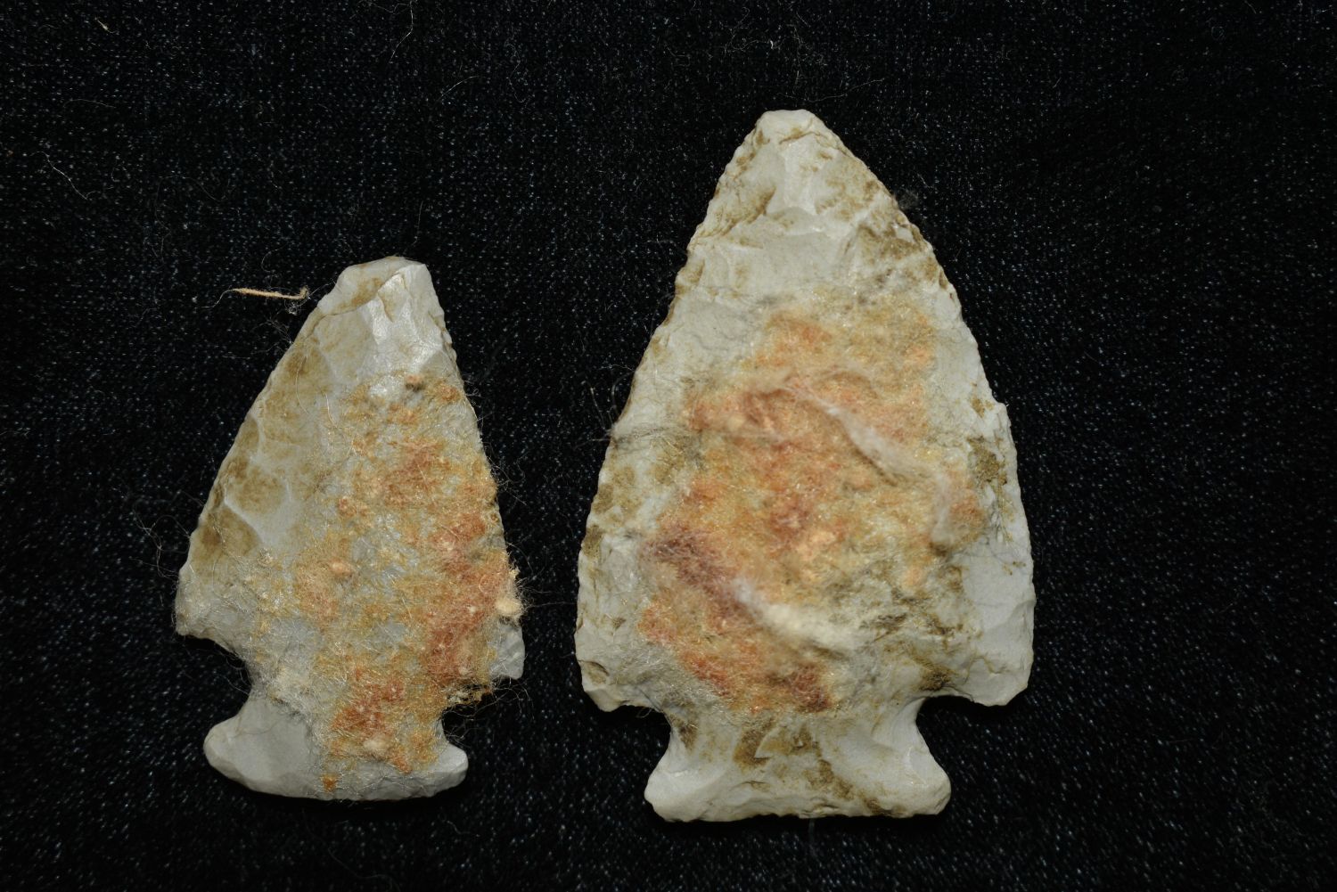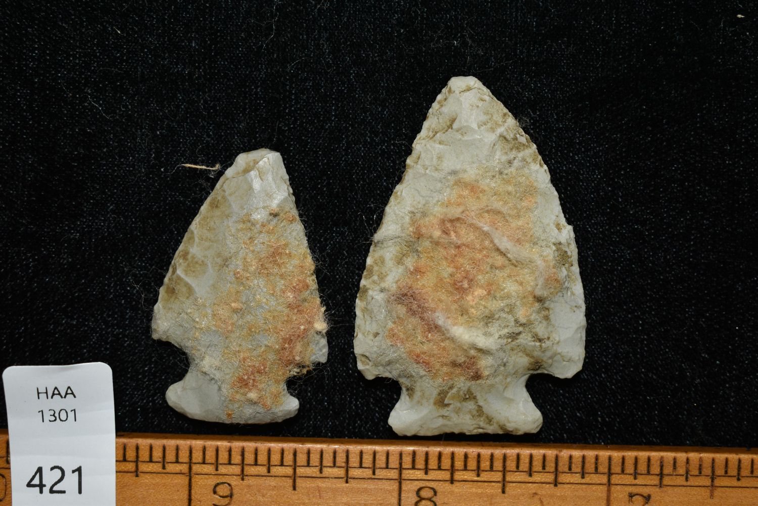 Lot of 2 arrowheads, Musselshell, Montana where he found his first arrowhead at a very early age. This led Creel on a lifetime search for Montana’s prehistoric past. Creel owned a ranch in Musselshell and collected from sites and in and around the Musselshell River and tributaries. Every piece in Creel’s collection is personally found. He did not purchase pieces, nor did he accept pieces as gifts. He took pride in the fact he found every piece. He also made the cedar frames from cedar trees that were cut on his ranch. Many of the pieces were collected from the buffalo jumps which were plentiful nearby