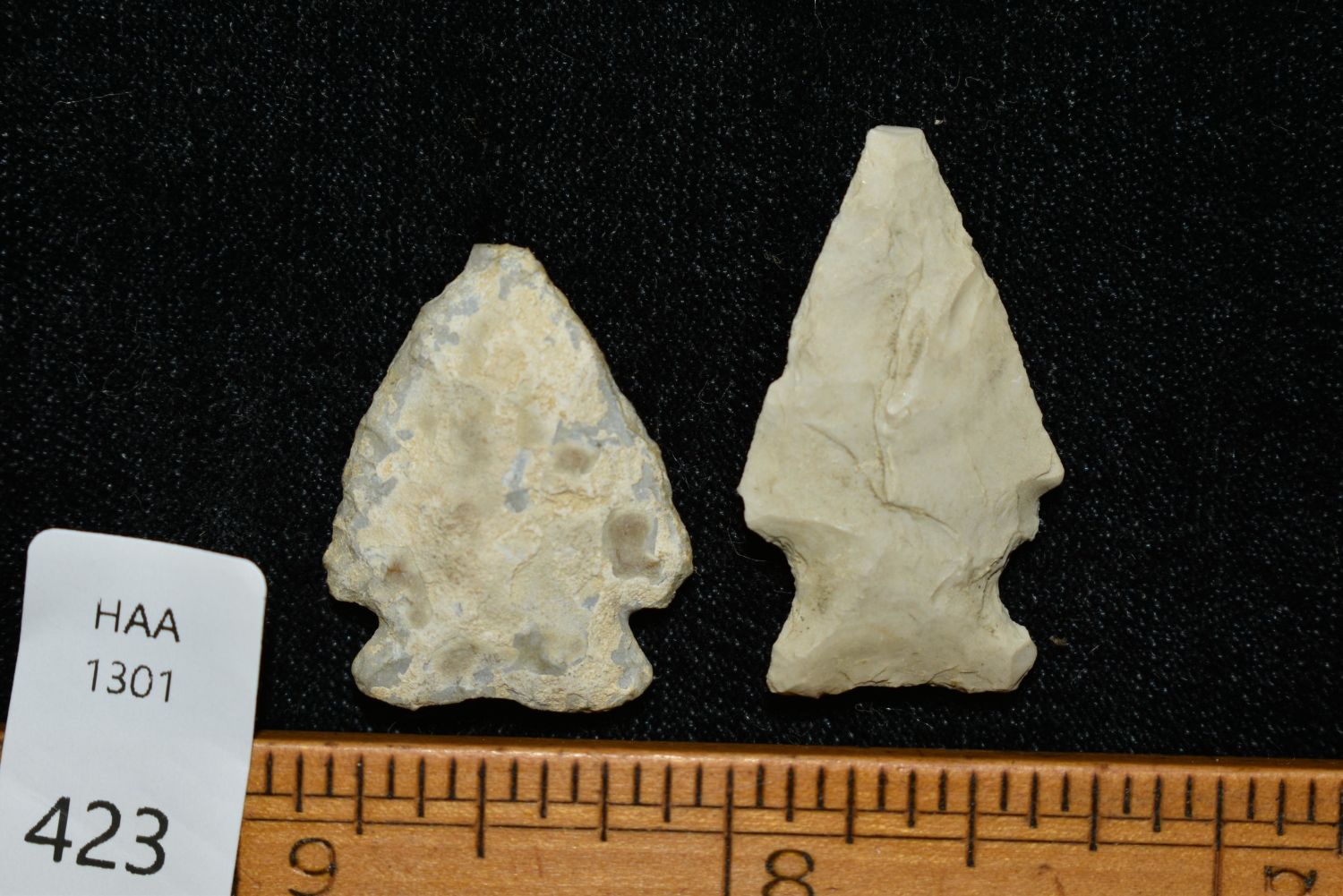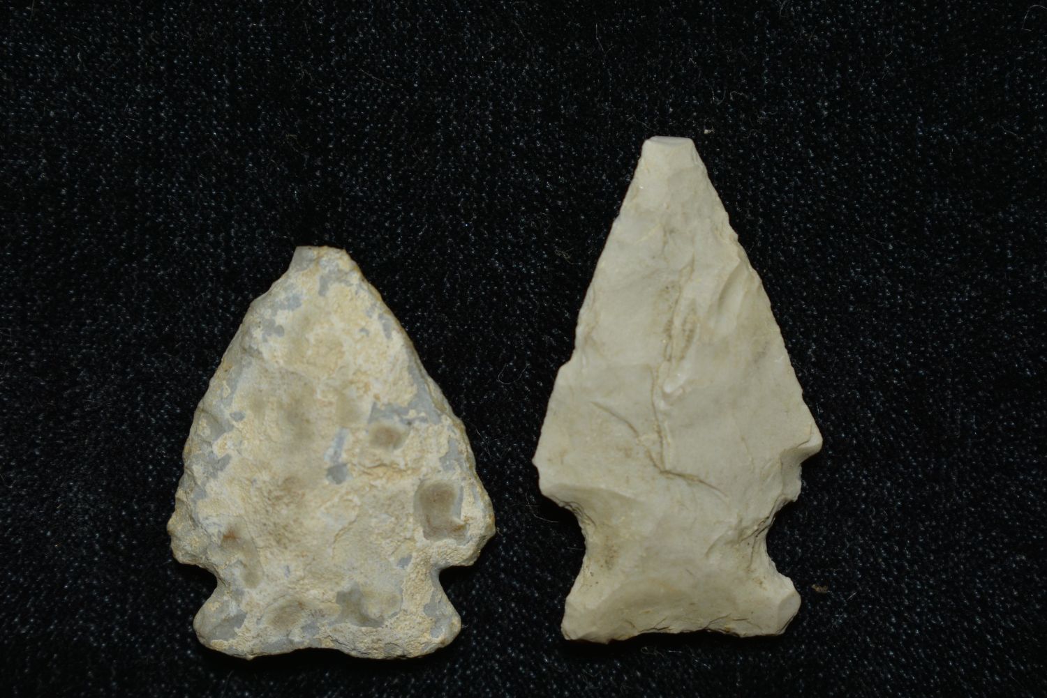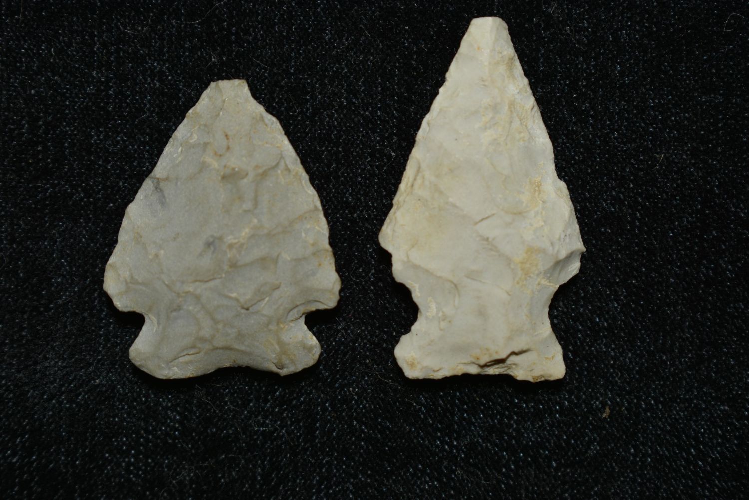 Lot of 2 Birdpoints, Musselshell, Montana where he found his first arrowhead at a very early age. This led Creel on a lifetime search for Montana’s prehistoric past. Creel owned a ranch in Musselshell and collected from sites and in and around the Musselshell River and tributaries. Every piece in Creel’s collection is personally found. He did not purchase pieces, nor did he accept pieces as gifts. He took pride in the fact he found every piece. He also made the cedar frames from cedar trees that were cut on his ranch. Many of the pieces were collected from the buffalo jumps which were plentiful nearby