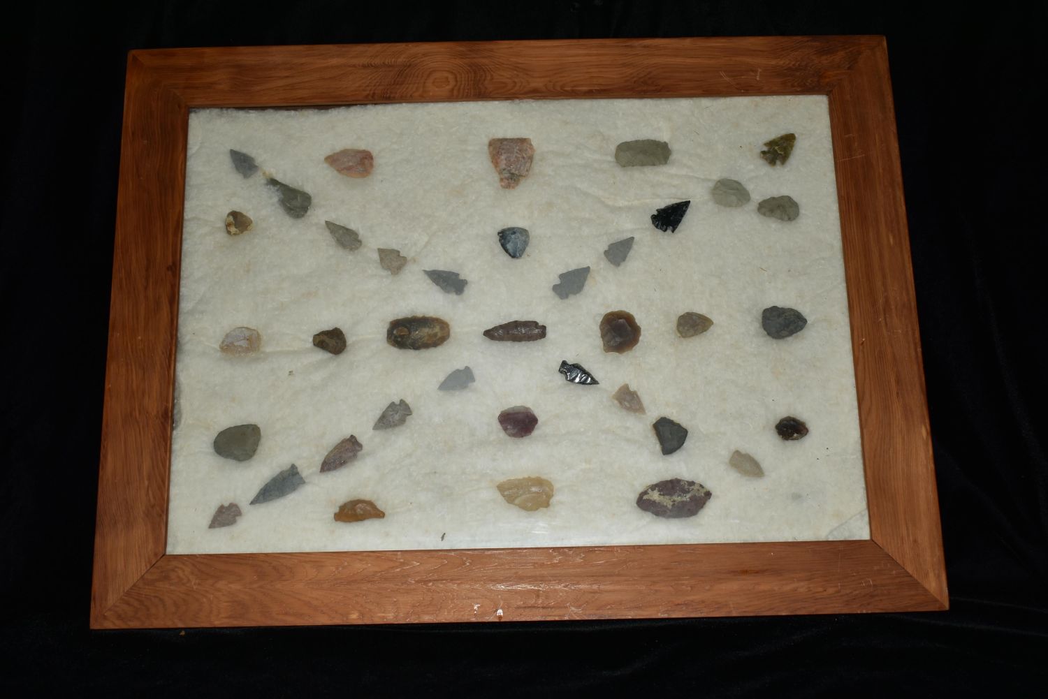 24 1/8" x 18" Cedar Frame, Contains Approx. 38 Arrowheads, Frame Made by Creel Poore, Musselshell, Montana where he found his first arrowhead at a very early age. This led Creel on a lifetime search for Montana’s prehistoric past. Creel owned a ranch in Musselshell and collected from sites and in and around the Musselshell River and tributaries. Every piece in Creel’s collection is personally found. He did not purchase pieces, nor did he accept pieces as gifts. He took pride in the fact he found every piece. He also made the cedar frames from cedar trees that were cut on his ranch. Many of the pieces were collected from the buffalo jumps which were plentiful nearby