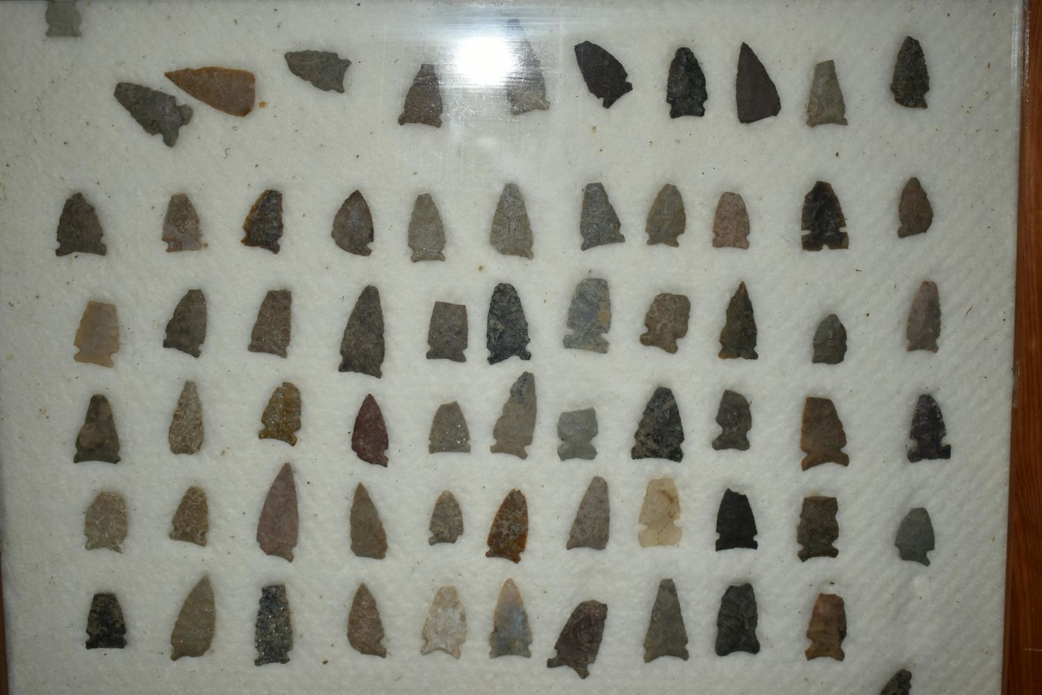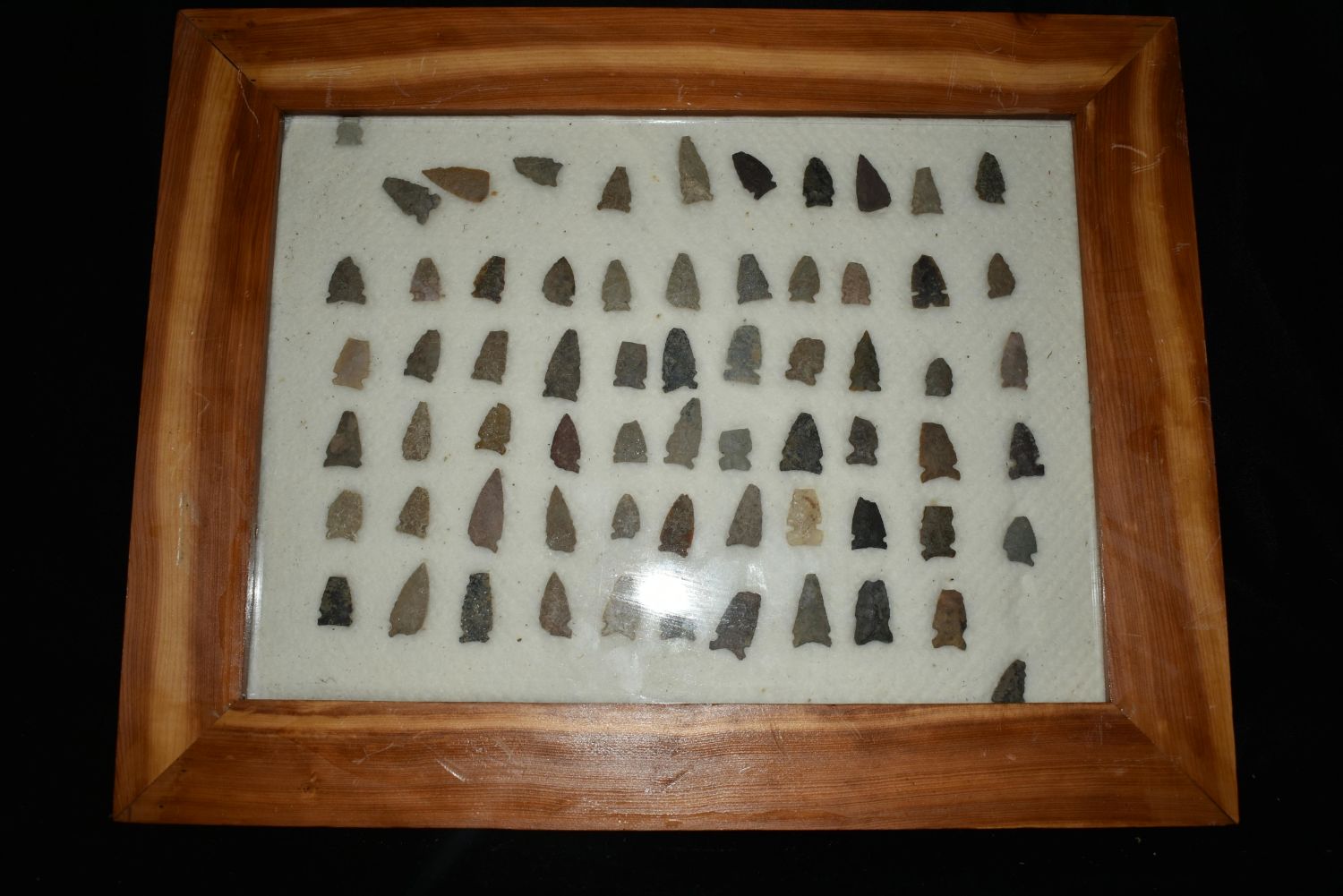 18" x 14" Frame, Contains Approx. 66 Arrowheads, Frame by Creel Poore, Musselshell, Montana where he found his first arrowhead at a very early age. This led Creel on a lifetime search for Montana’s prehistoric past. Creel owned a ranch in Musselshell and collected from sites and in and around the Musselshell River and tributaries. Every piece in Creel’s collection is personally found. He did not purchase pieces, nor did he accept pieces as gifts. He took pride in the fact he found every piece. He also made the cedar frames from cedar trees that were cut on his ranch. Many of the pieces were collected from the buffalo jumps which were plentiful nearby